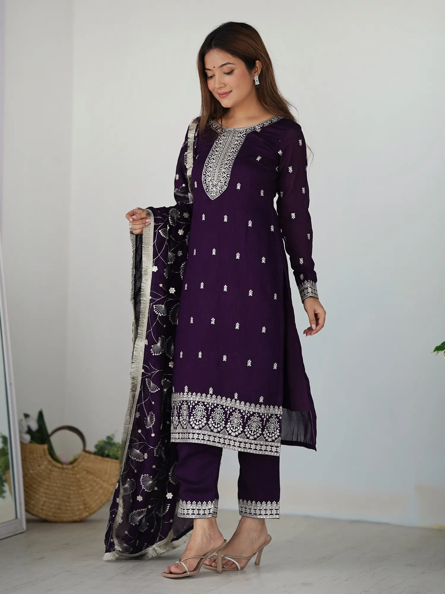 Attractive Chinon Silk Thread Embroidered And Sequins Work Salwar Suit With Dupatta