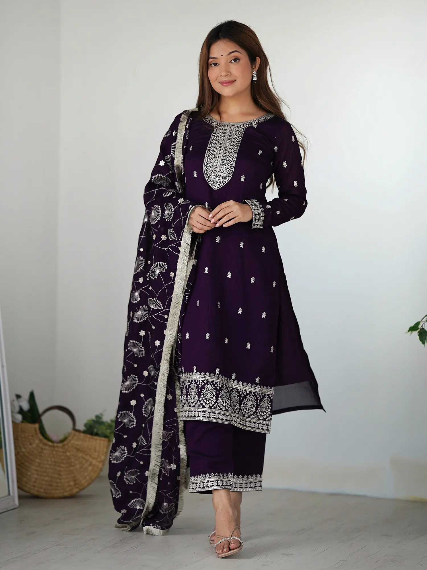Embroidery And Sequence Work Floral Fancy Silk Salwar Suit With Matching Dupatta