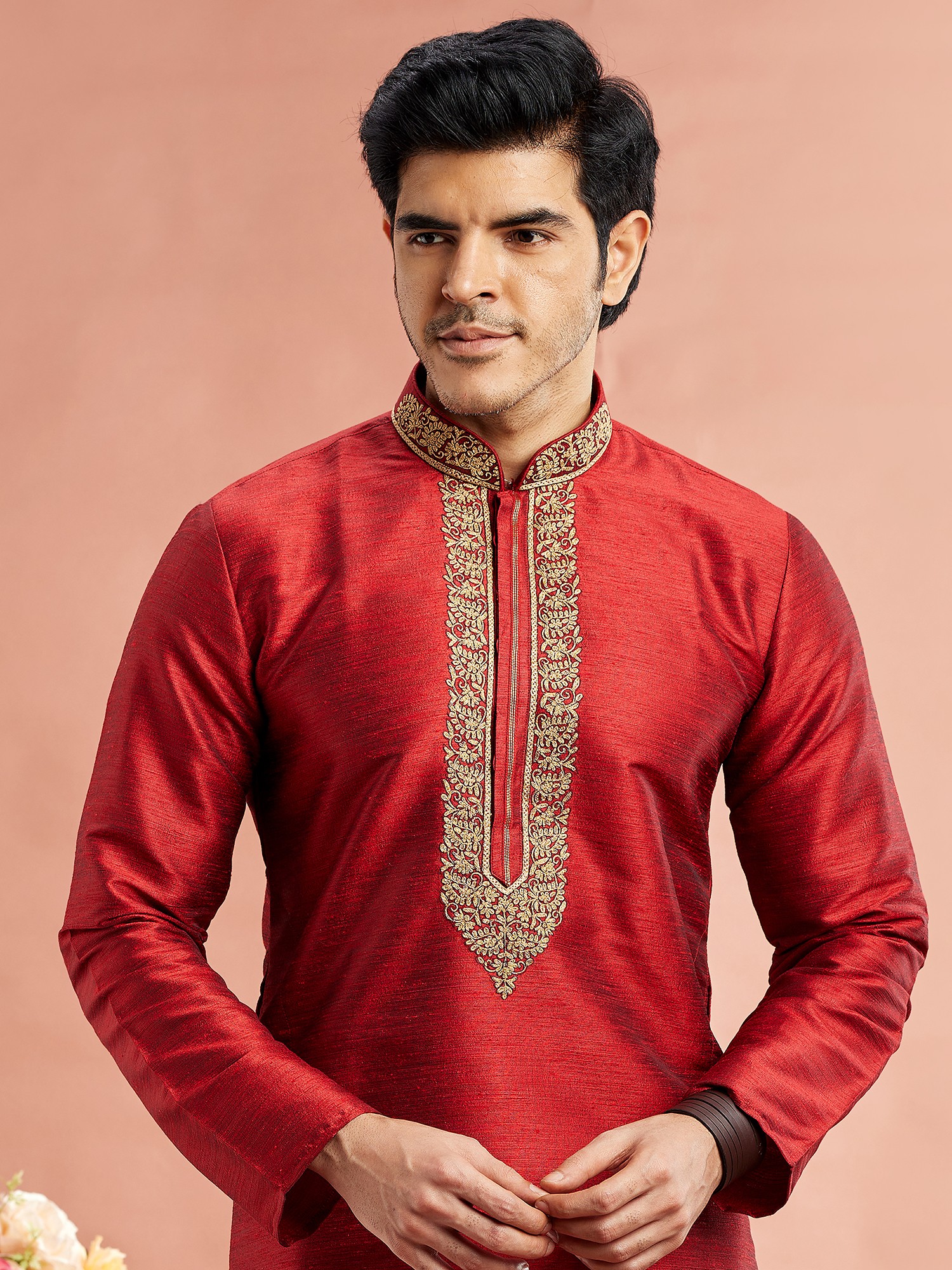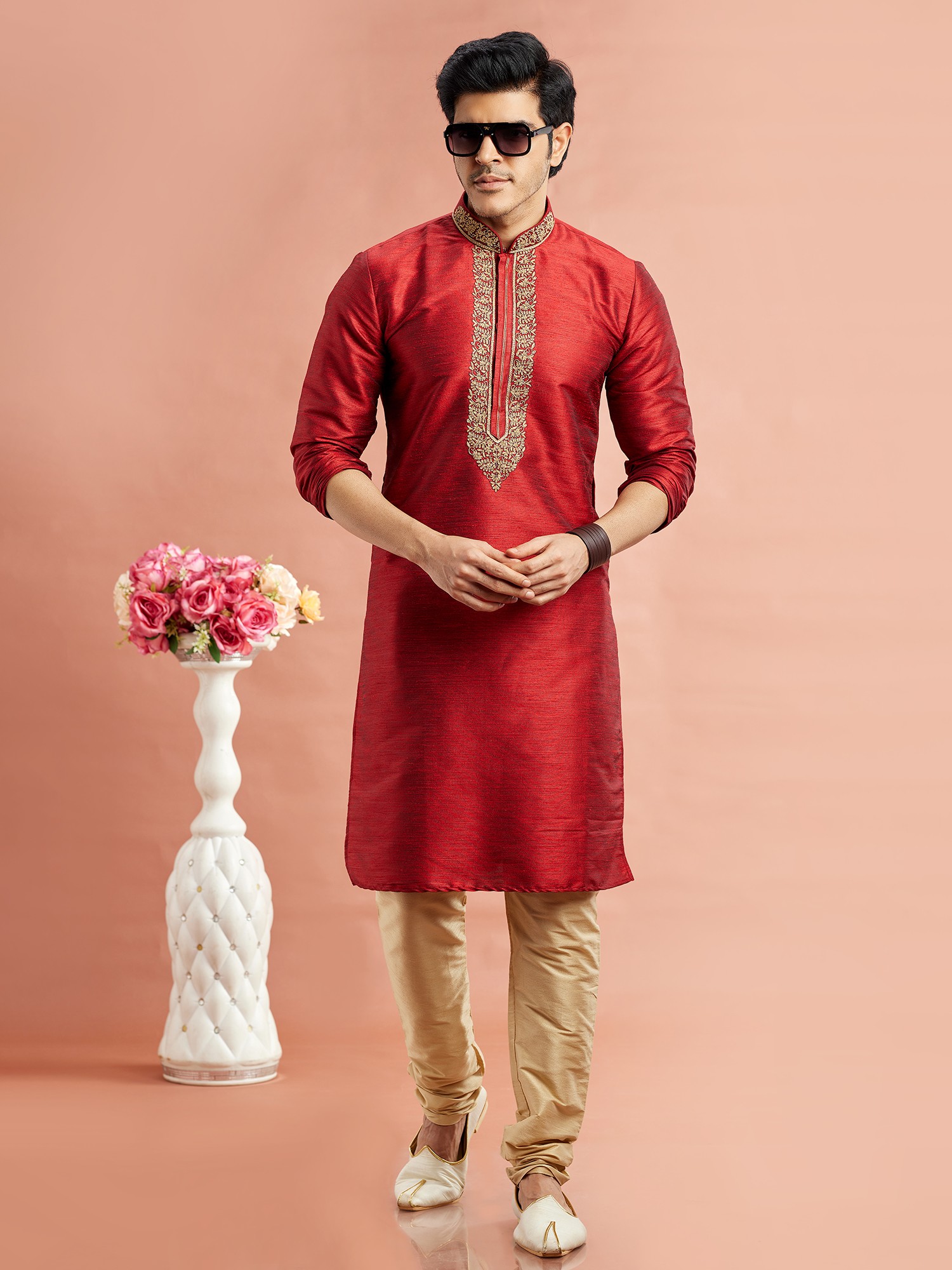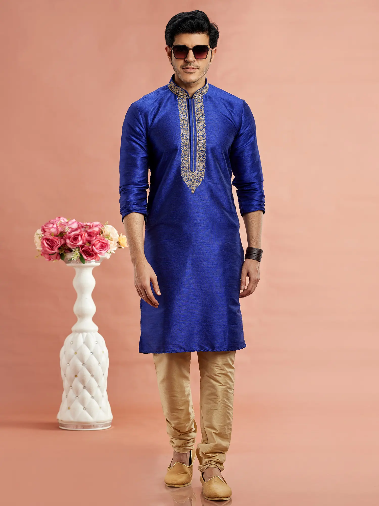 Jacquard Art Silk Embroidery Work On Neck Full Sleeve Kurta Pajama Set