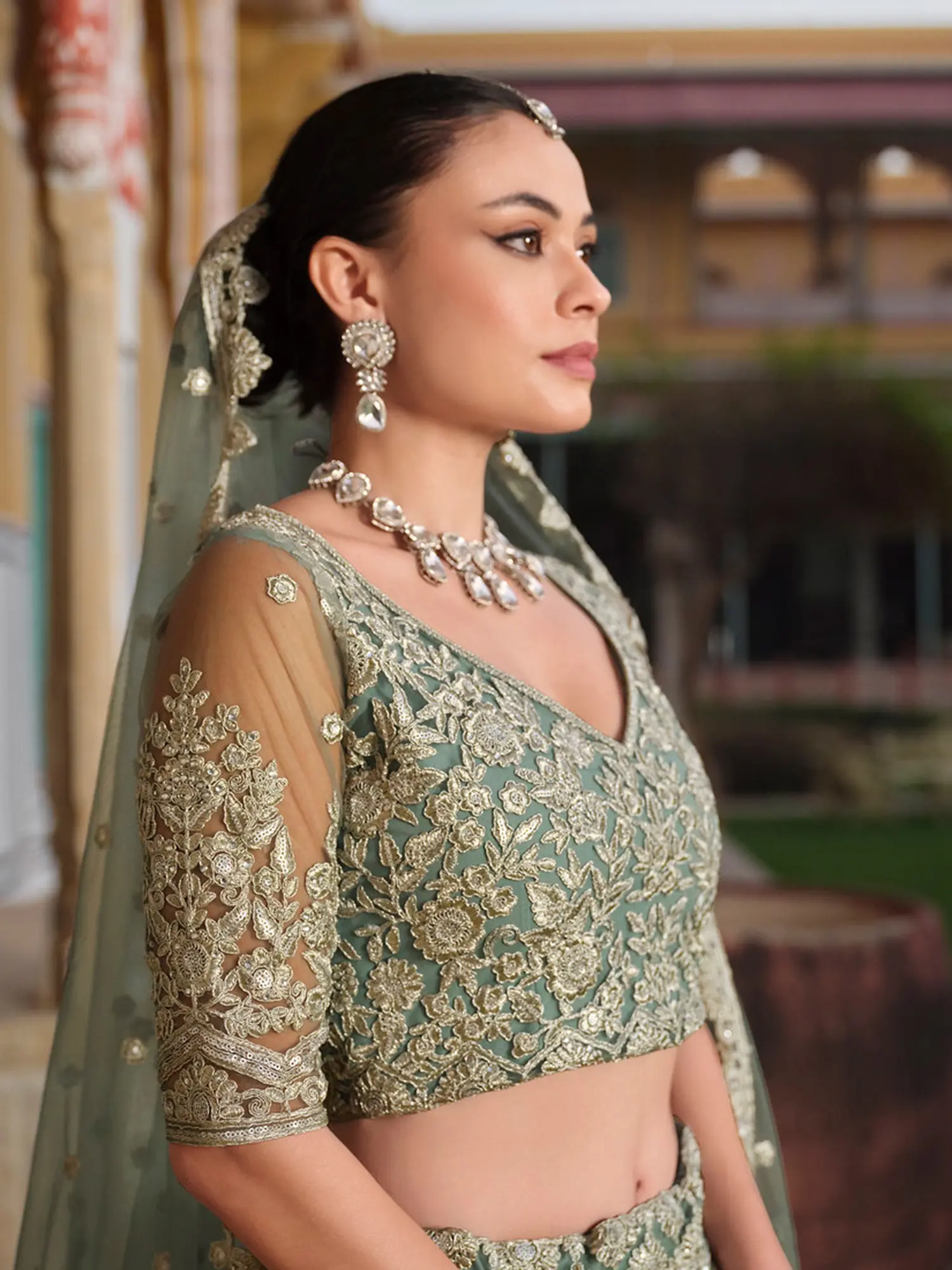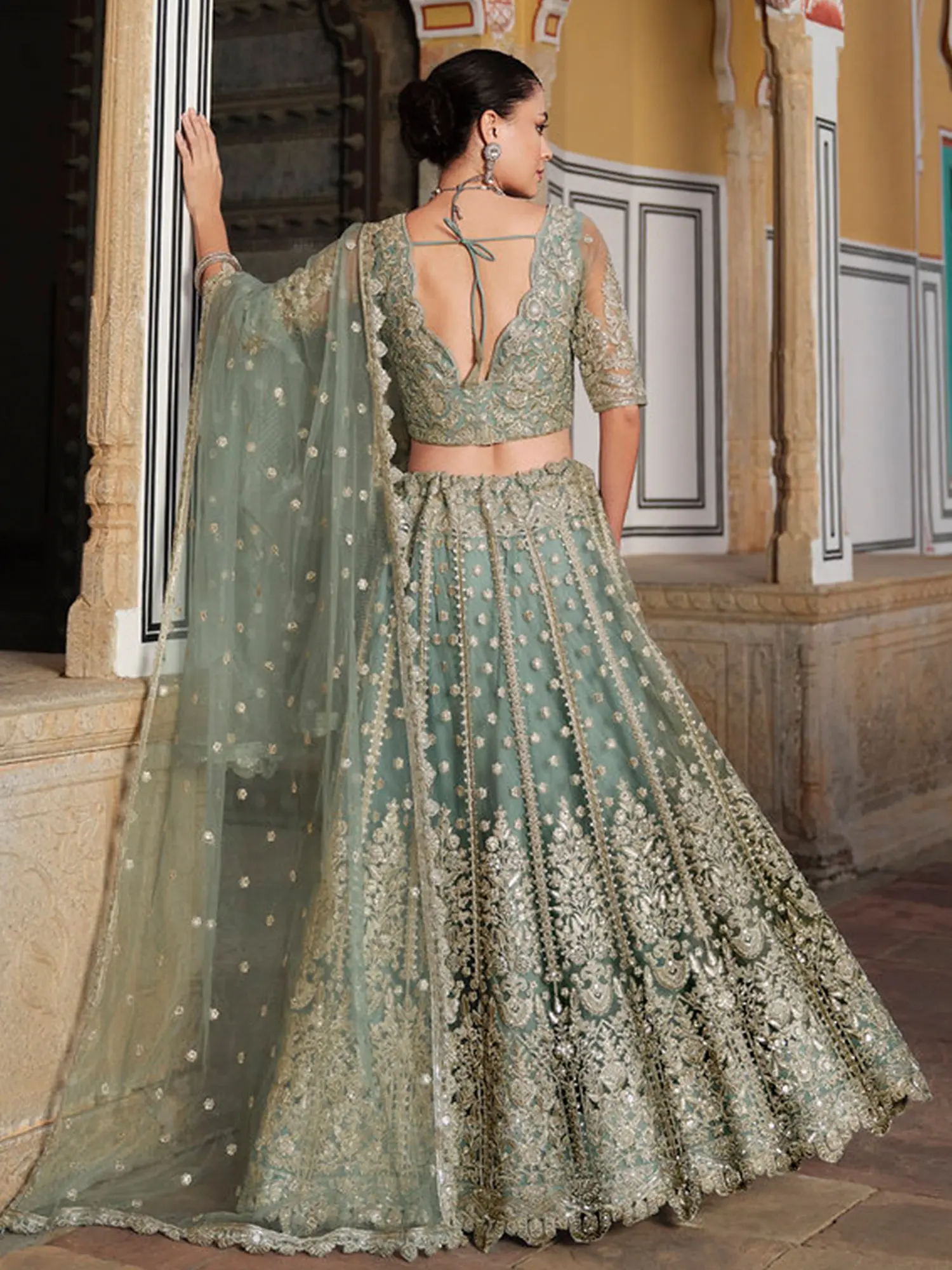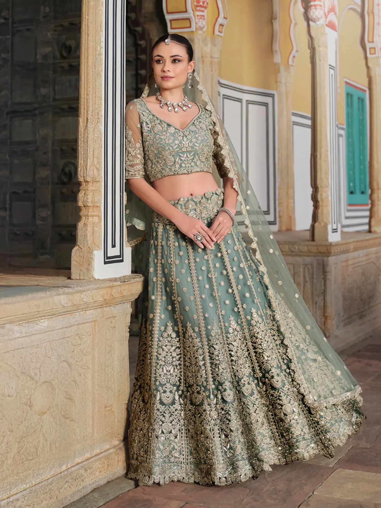 Zephyr-Green Designer Banarasi Lehenga Choli with Metallic-Thread Embroidery and Velvet Applique