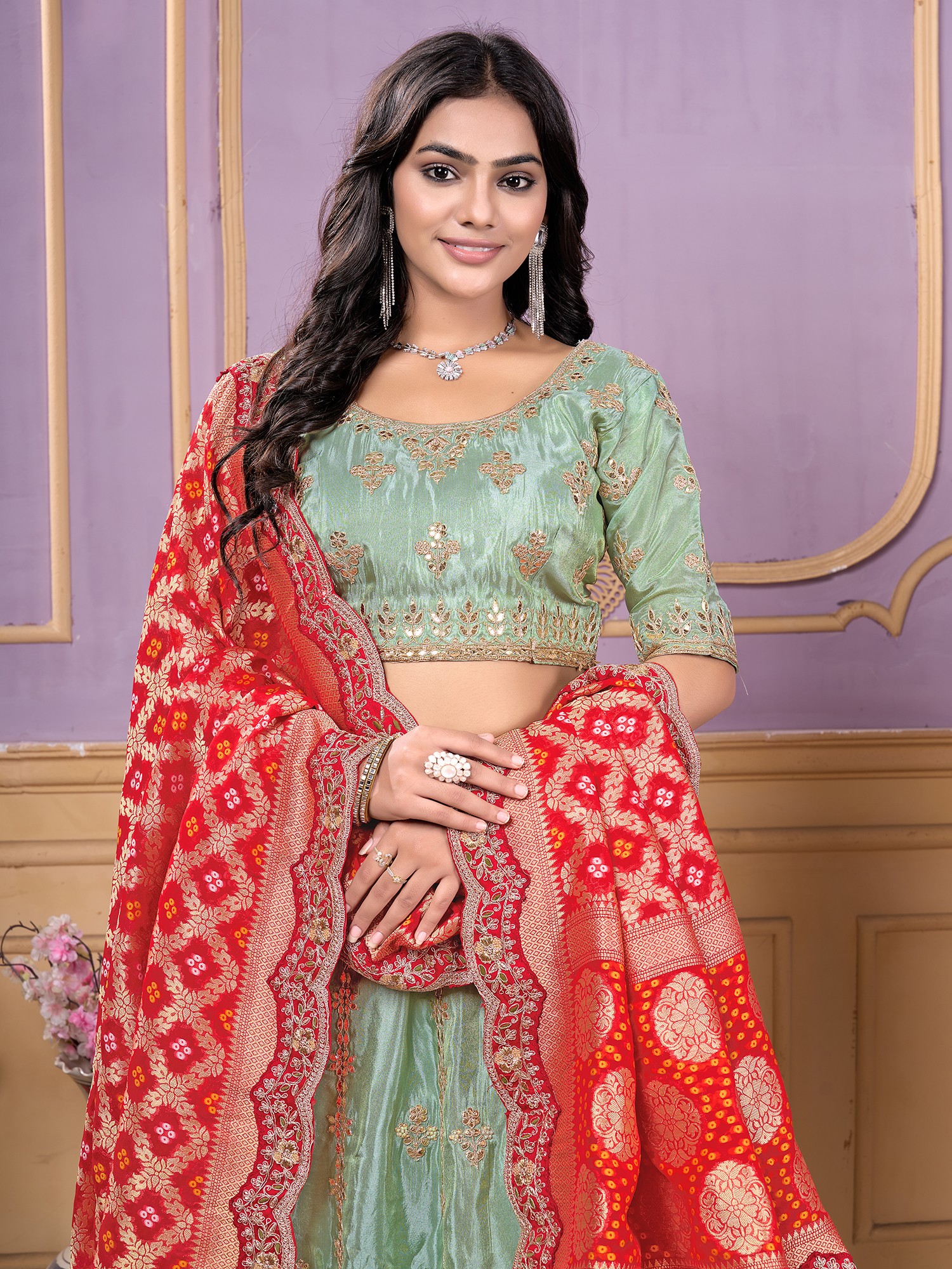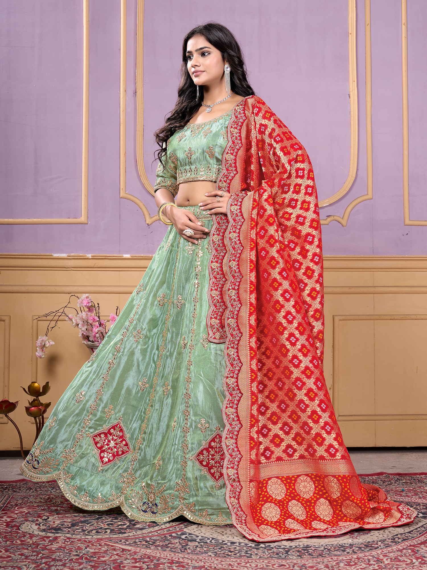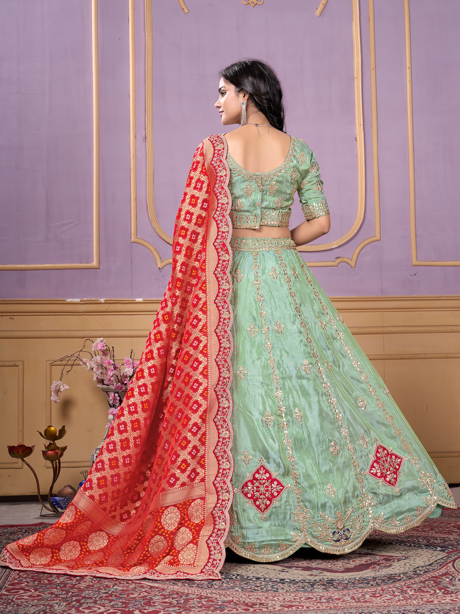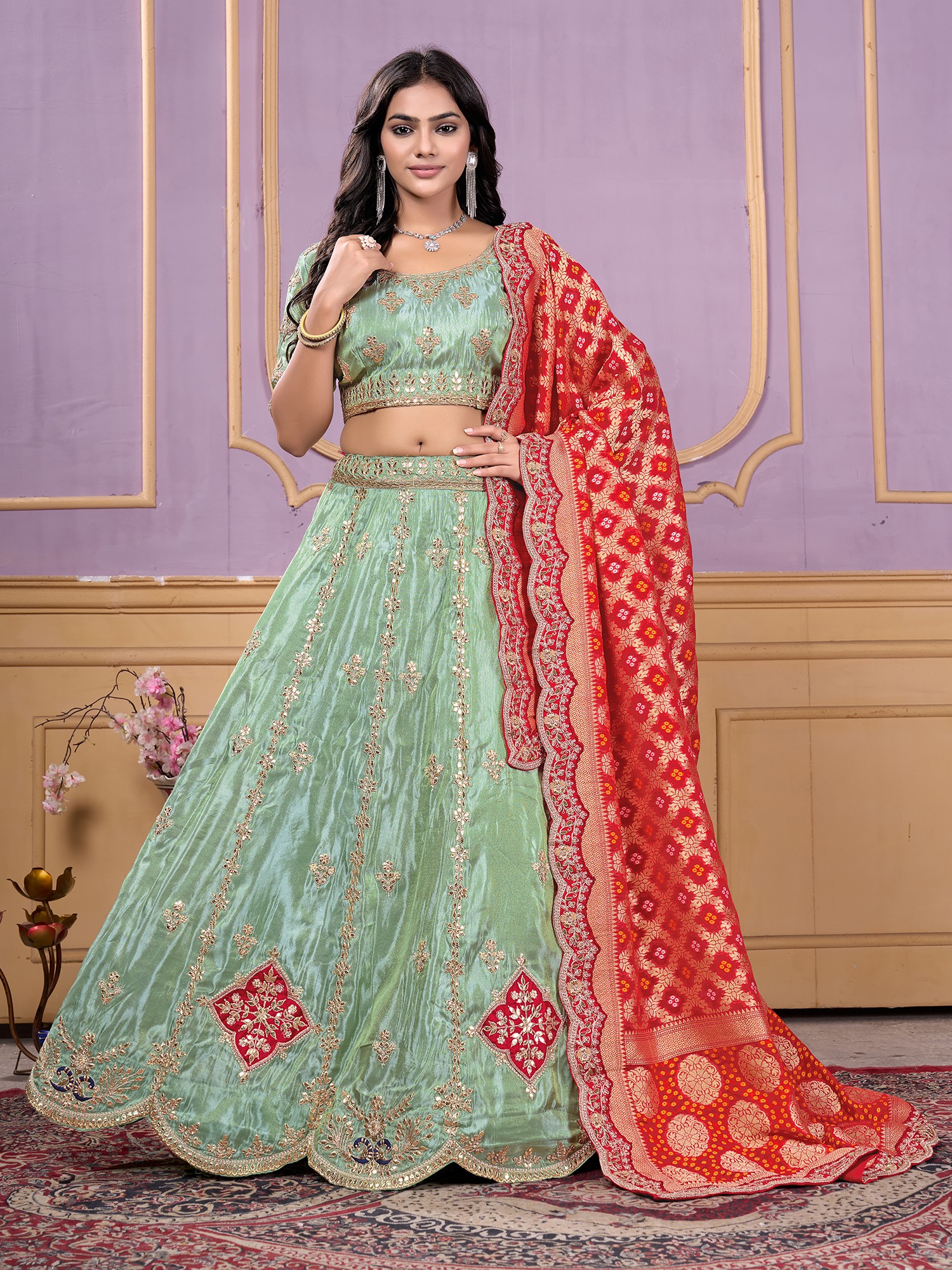 Pure Cosmos Tissue Embroidery And Sequins Work Attractive Lehenga Choli With Premium Net Dupatta