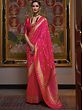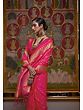 The border displays a stunning pine pattern, inspired by south Indian weaves. An exquisite golden pattern on the pallu with tassels adds to the appeal of the drape, paired with a matching blouse to create perfect festive looks.