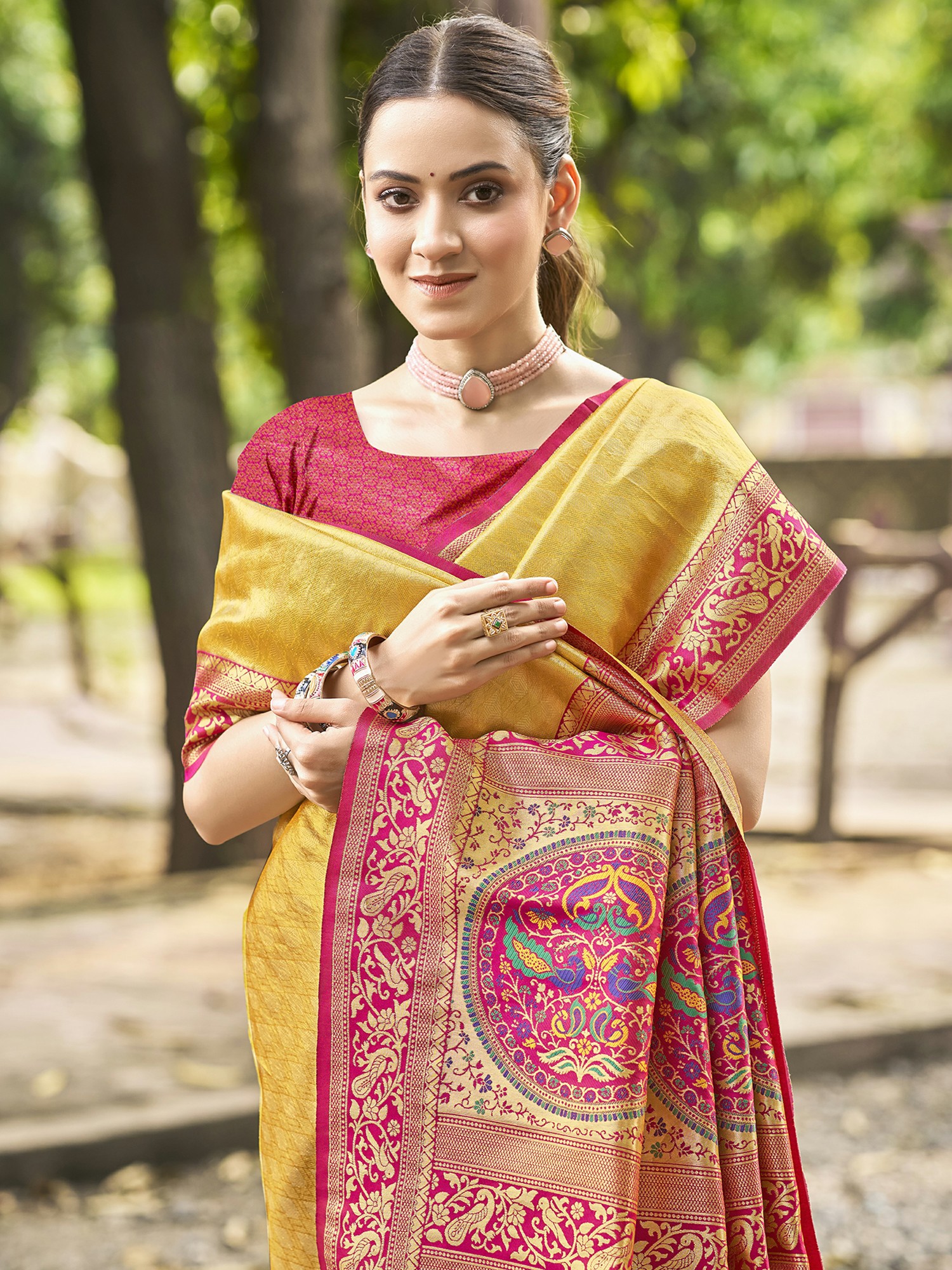 Step into the spotlight with this exquisite Kanjivaram silk saree, a testament to timeless Indian craftsmanship. The lustrous silk fabric, in a captivating shade of rich yellow, drapes beautifully, creating a silhouette that is both graceful and regal. This saree is designed to make you the center of attention at any festive gathering, wedding, or special occasion, exuding an aura of sophisticated charm.