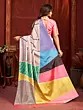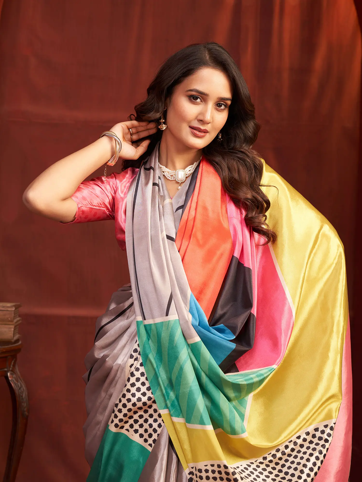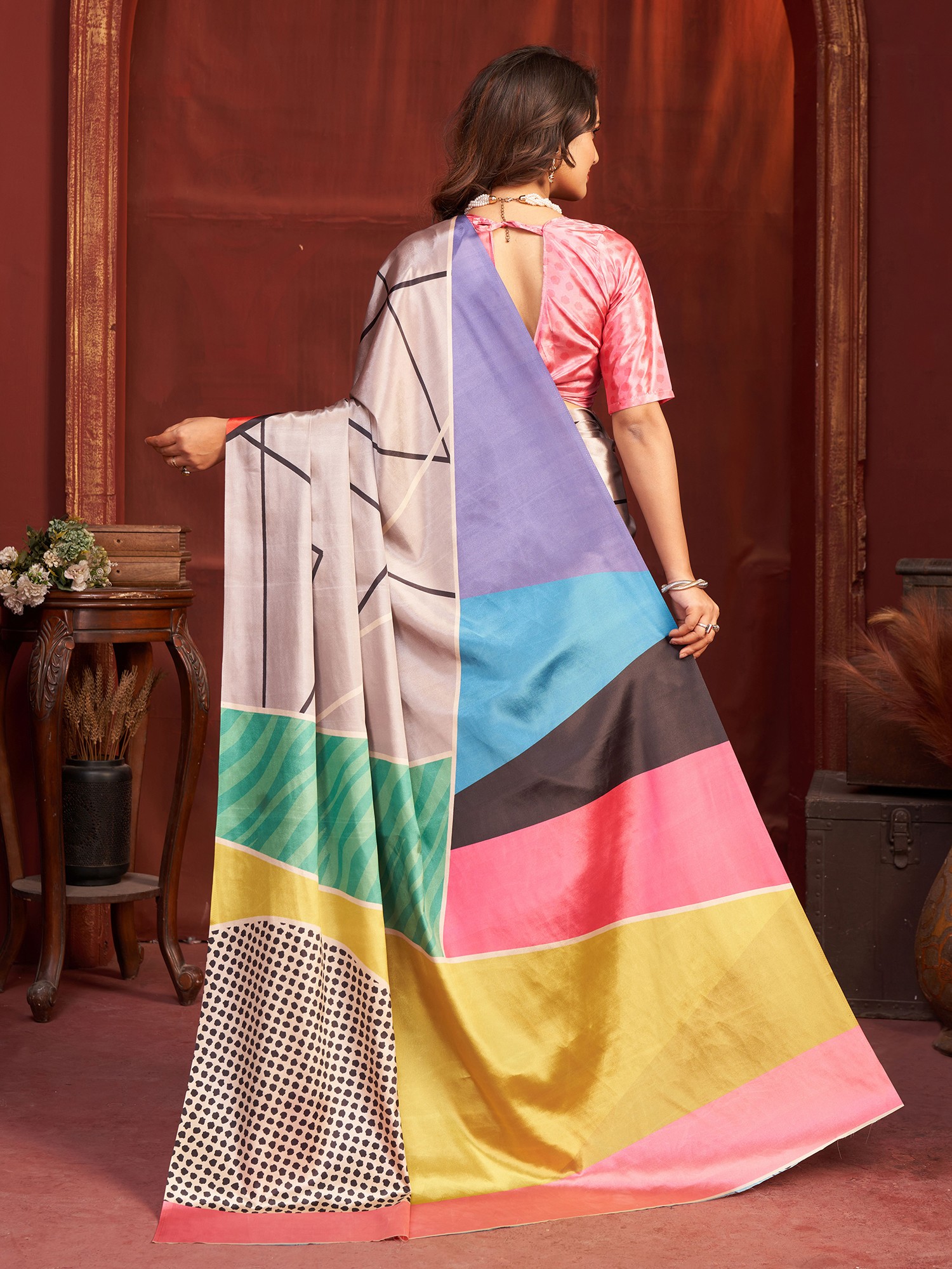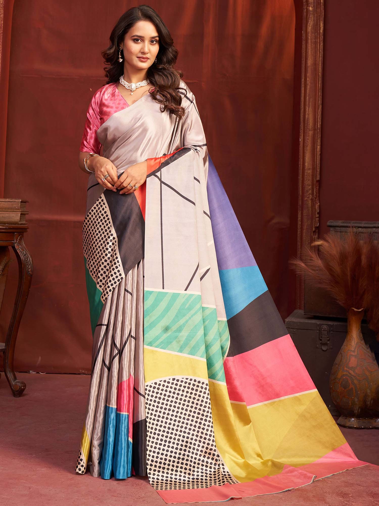 Stunning Malai Crepe Silk Saree With Designer Printed Multicolor Abstract Geometric Patterns Offering Luxurious Flowing Drape
