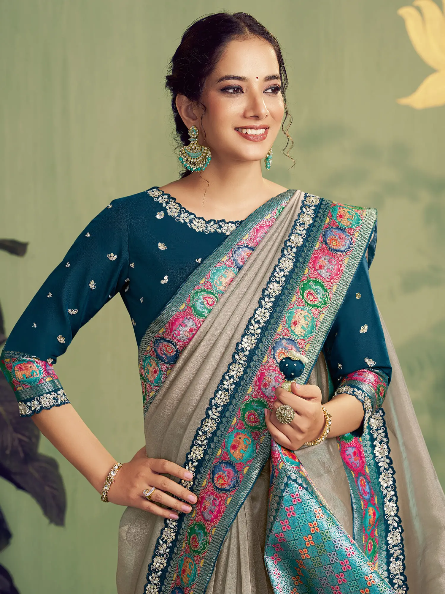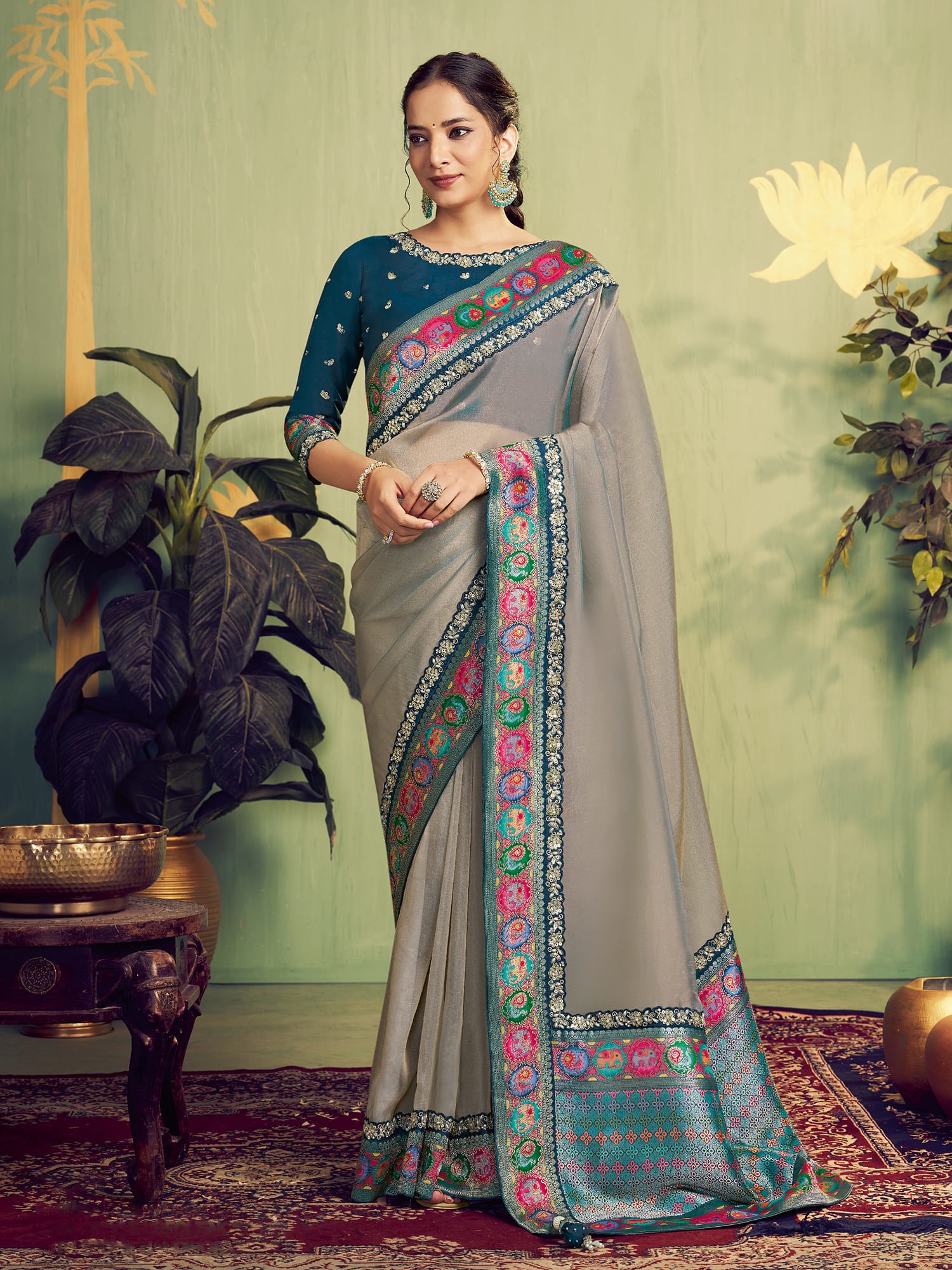 The gossamer-like tissue silk provides a fluid, ethereal drape that accentuates your natural grace. Its lustrous sheen catches the light, creating a captivating aura that follows your every move. The richly detailed border, a vibrant symphony of colors and patterns, frames the ensemble with unparalleled artistry. You will undoubtedly be drawn to the delicate yet impactful handwork that adorns its entirety.