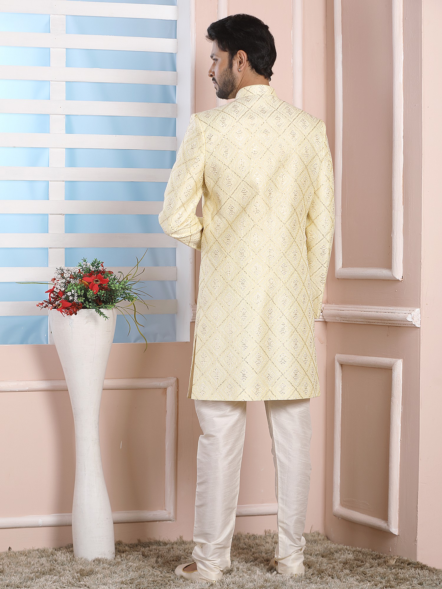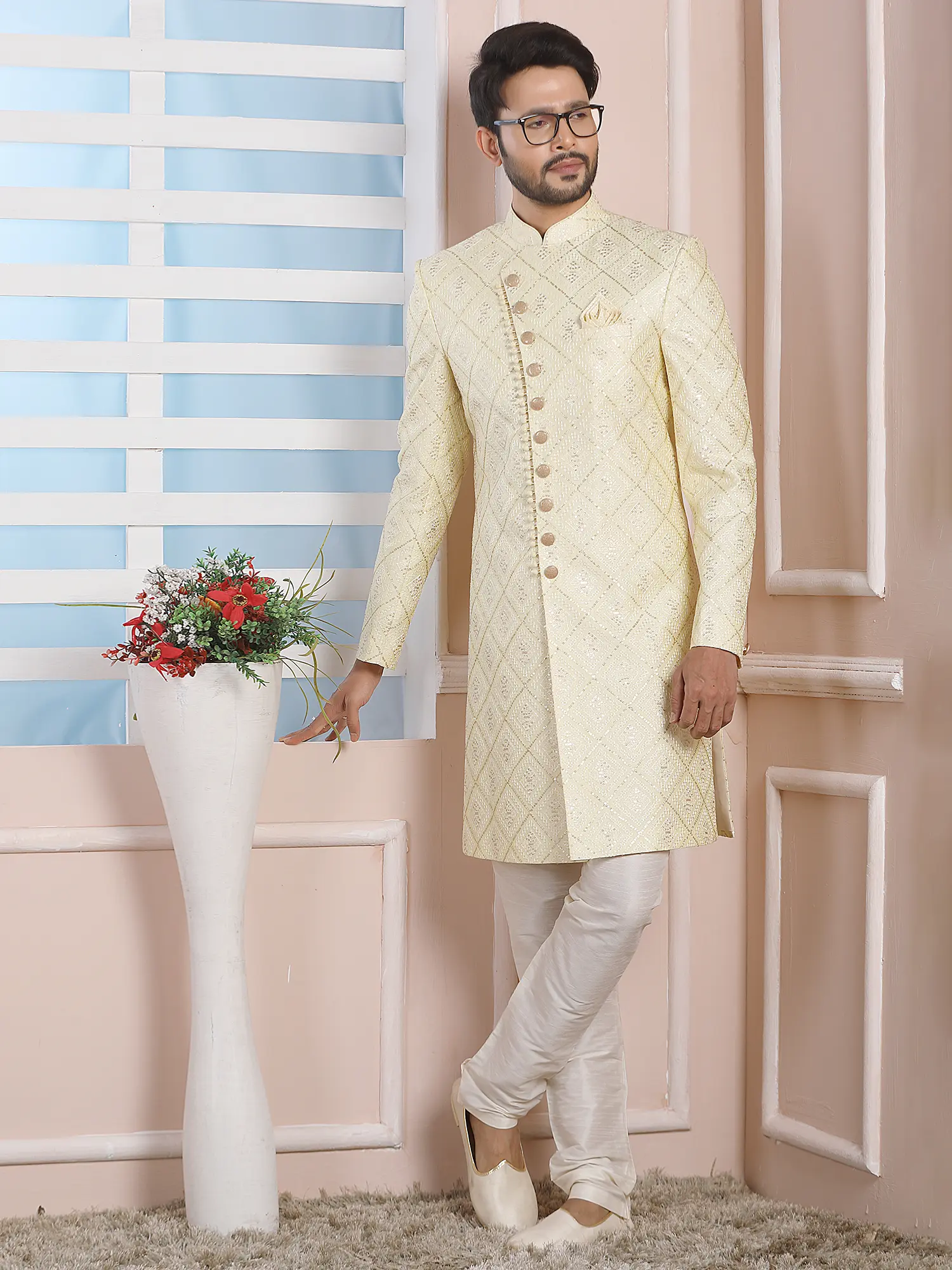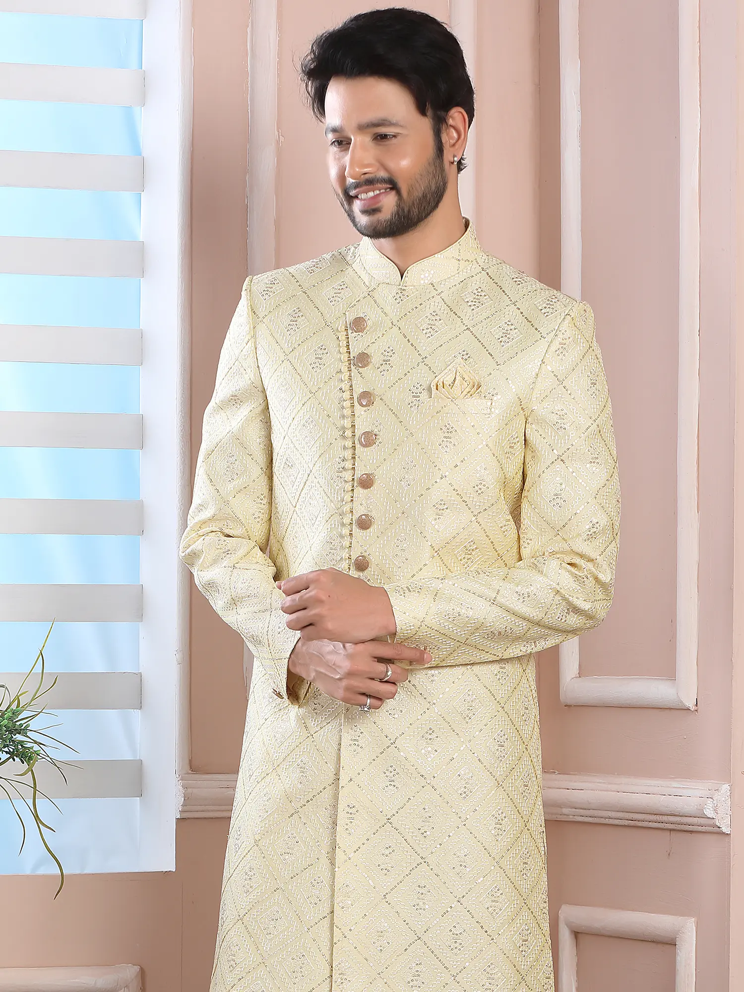 Elegant Jacquard Silk Indo Western Sherwani With Luxe Dupion Art Silk Aligarhi Pant For Wedding Sangeet Glam