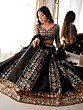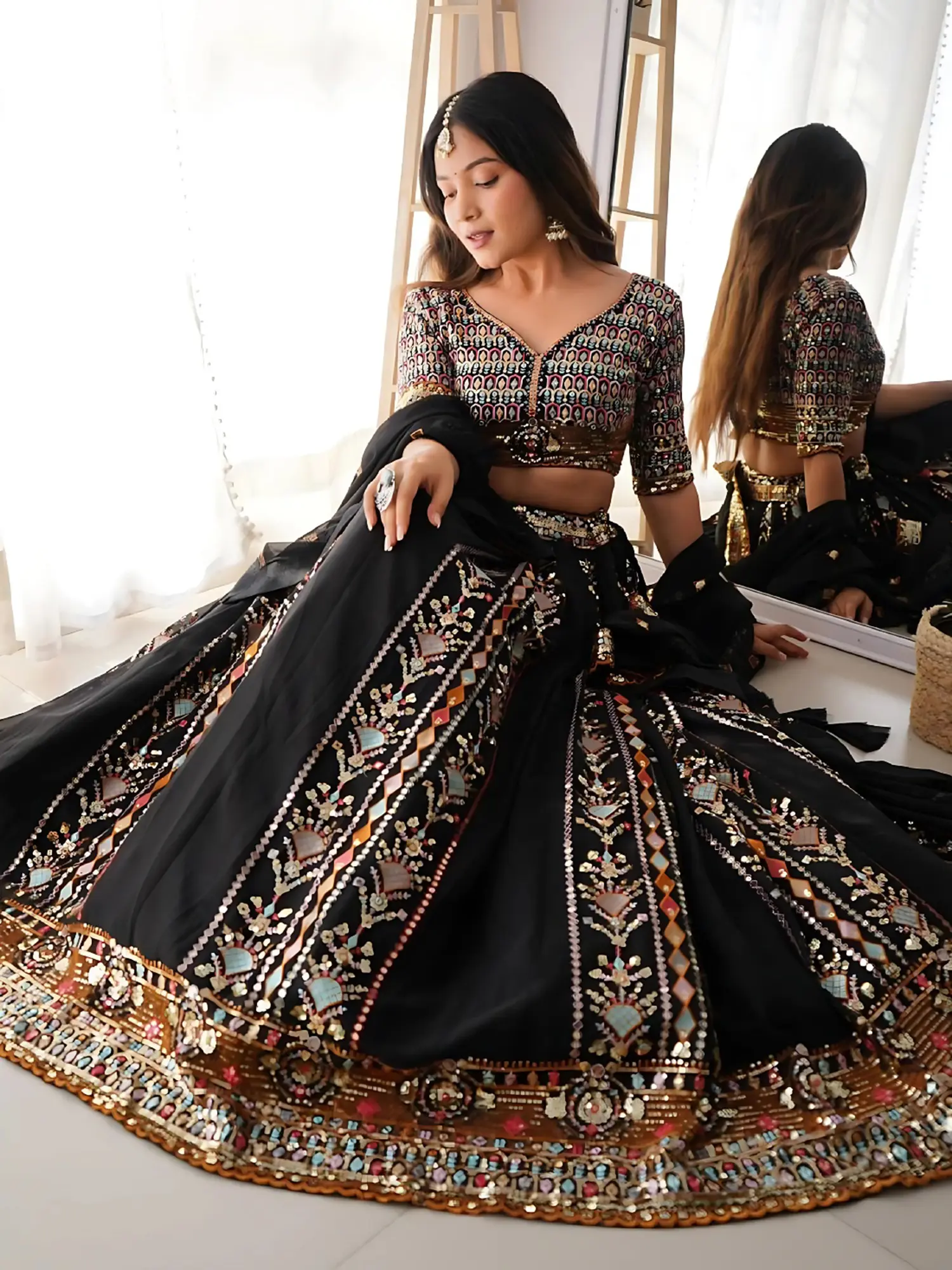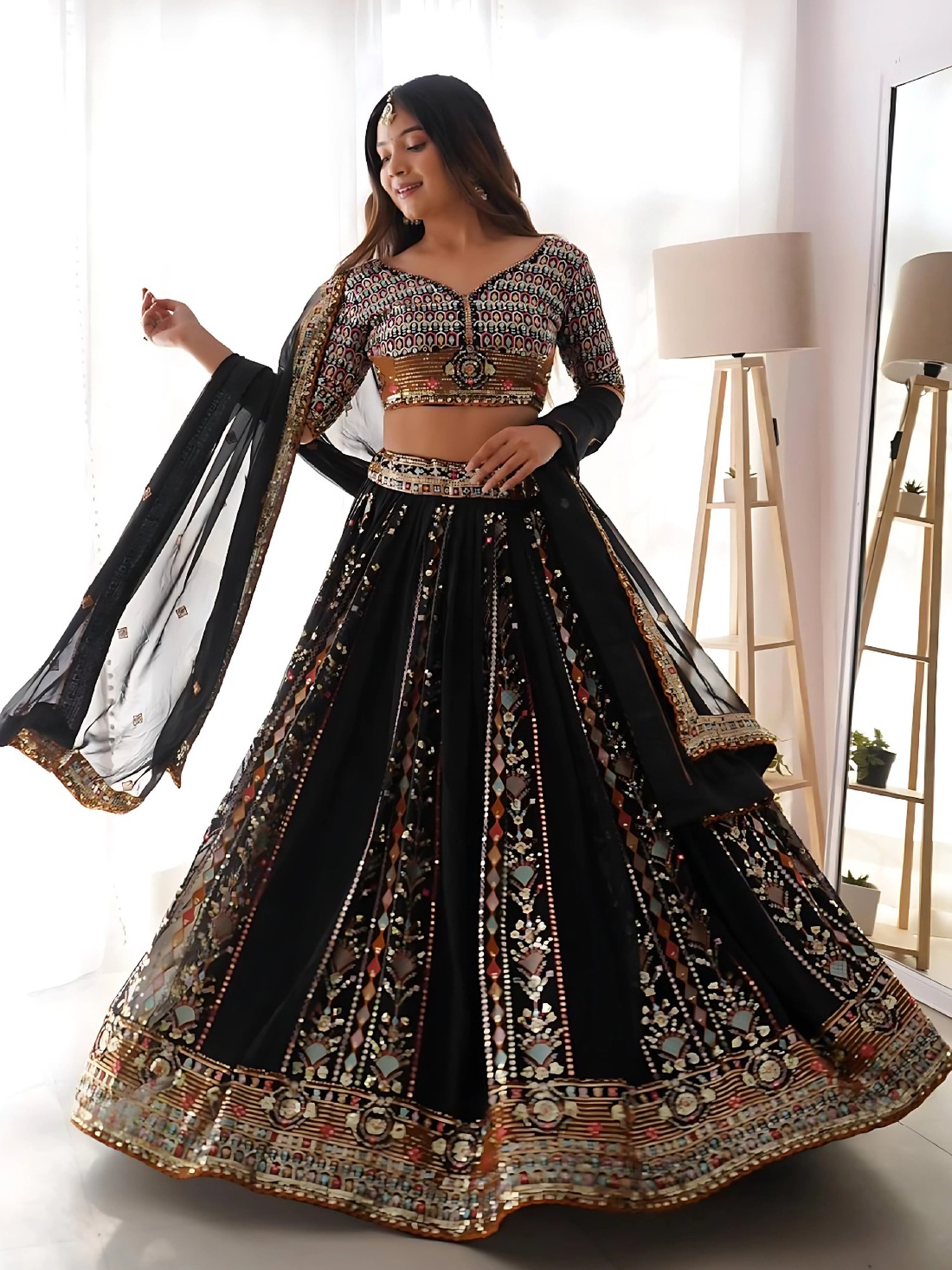 Step into the spotlight with this exquisite black faux georgette lehenga choli set, designed to make you the center of attention at any occasion. Crafted from luxurious faux georgette fabric, this ensemble offers a graceful drape and a comfortable feel, ensuring you look and feel your absolute best. The rich black hue provides a sophisticated canvas for the vibrant and intricate sequin embroidery that adorns the entire outfit.
