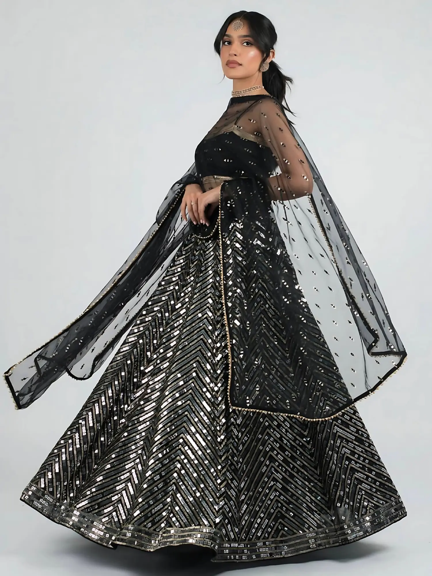 This lehenga set is more than just an outfit; it's an experience. The careful selection of fabrics and embellishments ensures a comfortable yet glamorous feel, allowing you to revel in the festivities with confidence. The classic black hue makes it a timeless addition to your ethnic wear collection, easily paired with a range of accessories to create unique looks. Whether you're attending a lavish wedding, a vibrant Diwali celebration, or an elegant engagement party, this lehenga set will ensure you embody grace and style. Its intricate detailing and luxurious feel speak volumes about your discerning taste in fashion. Elevate your ethnic wardrobe with this stunning piece that blends traditional artistry with contemporary design, guaranteeing you a look that is both unforgettable and utterly chic.