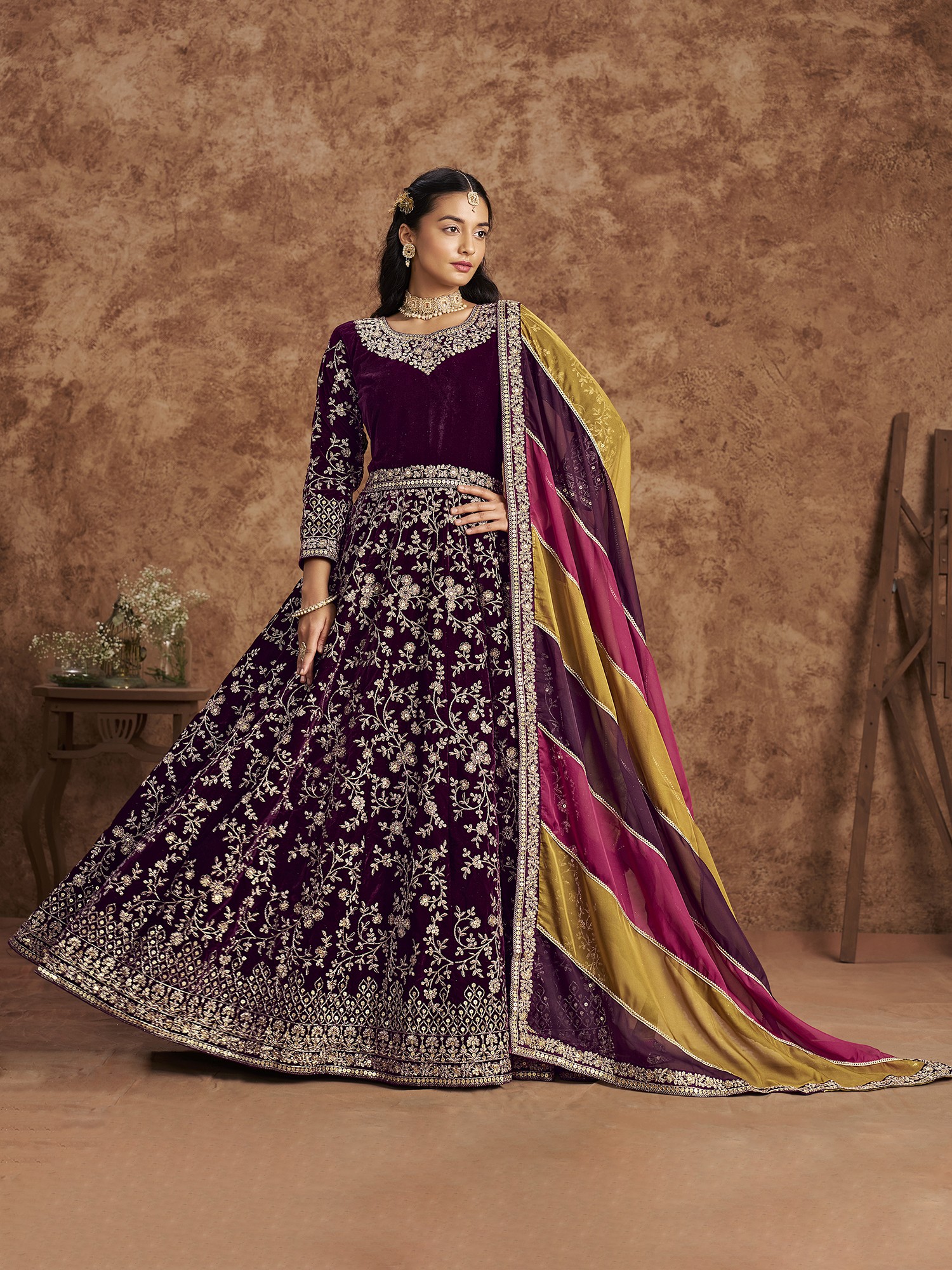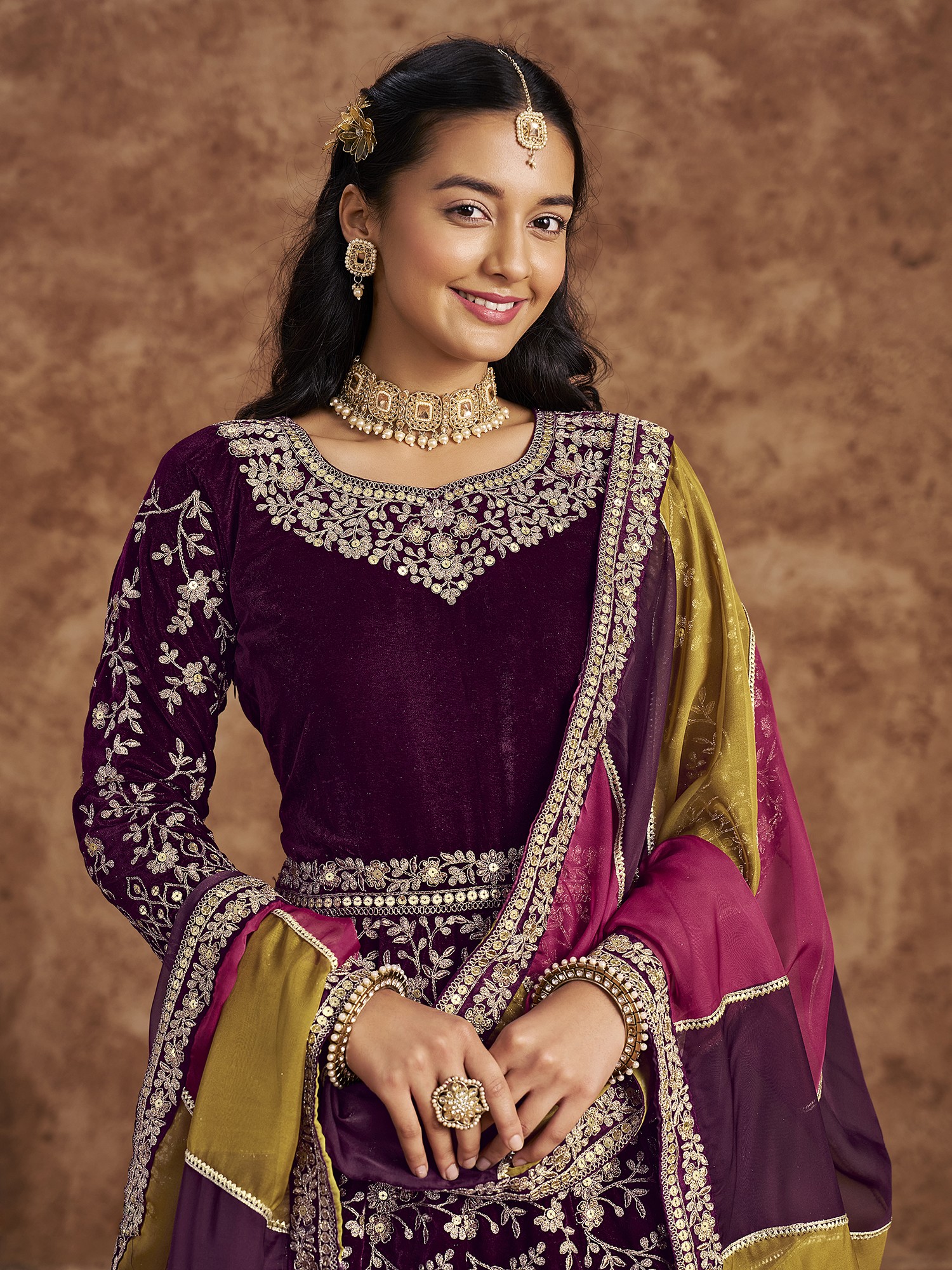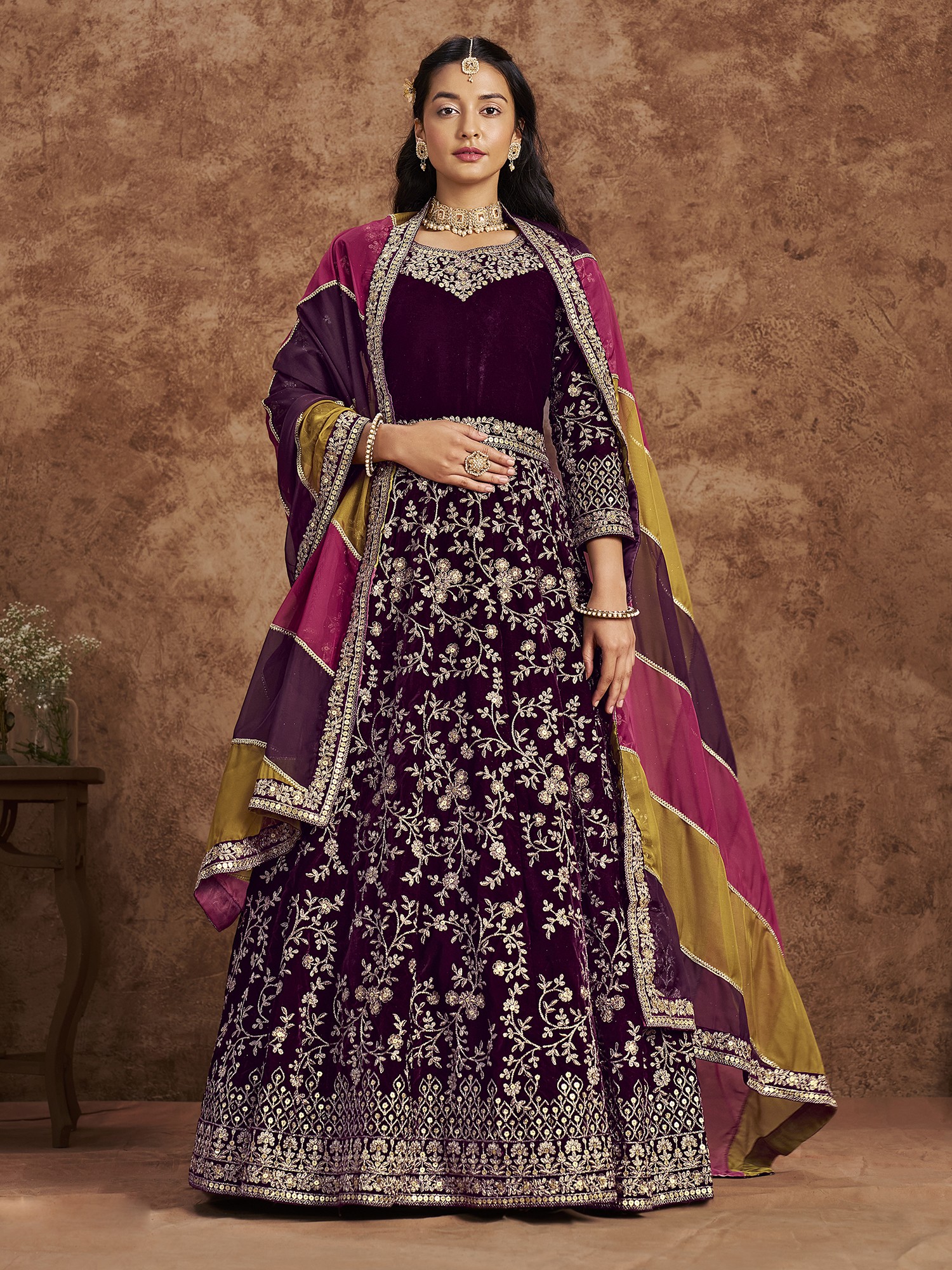 Women's Velvet Embroidered Gown Set With Bottom And Dull Organza Print Dupatta For Party And Wedding Wear