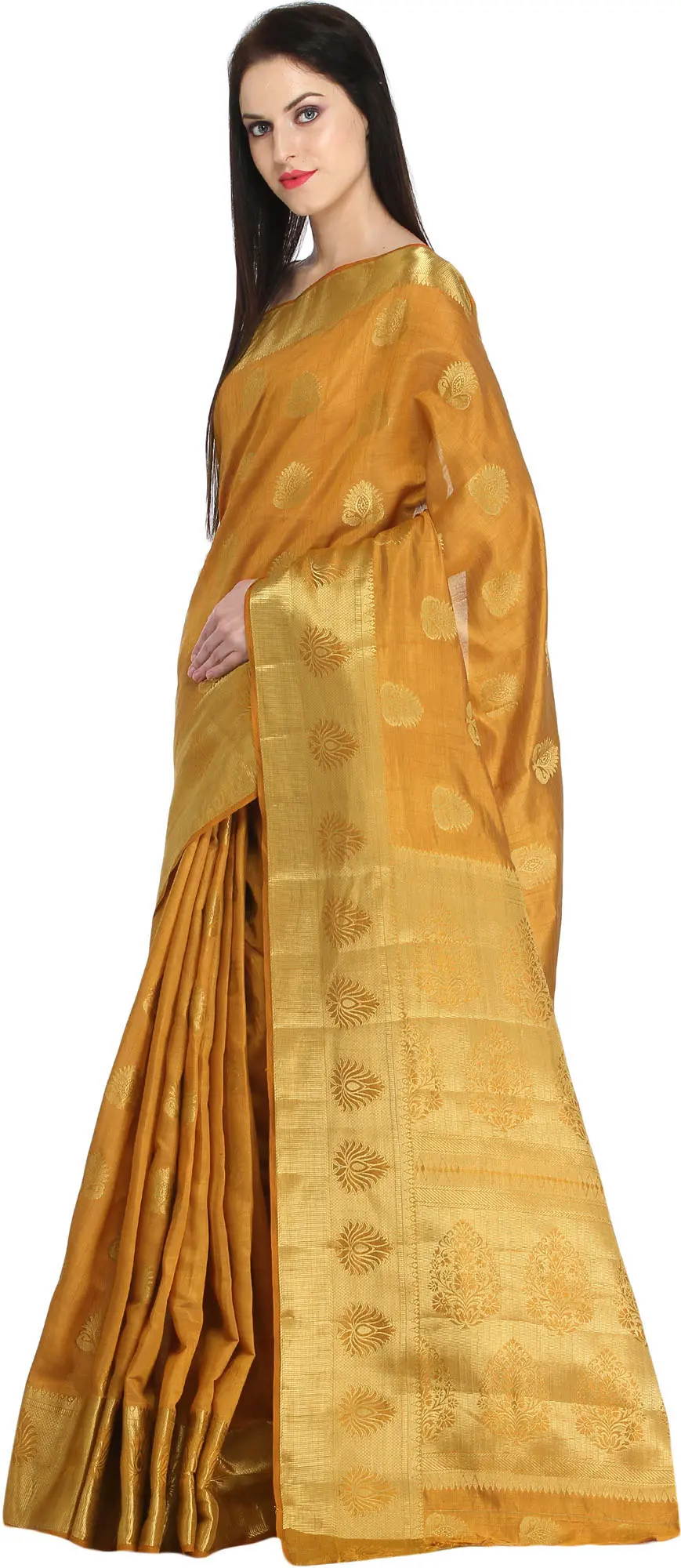 Camel-Brown Banarasi Saree with Woven Flowers in Golden Thread All-Over