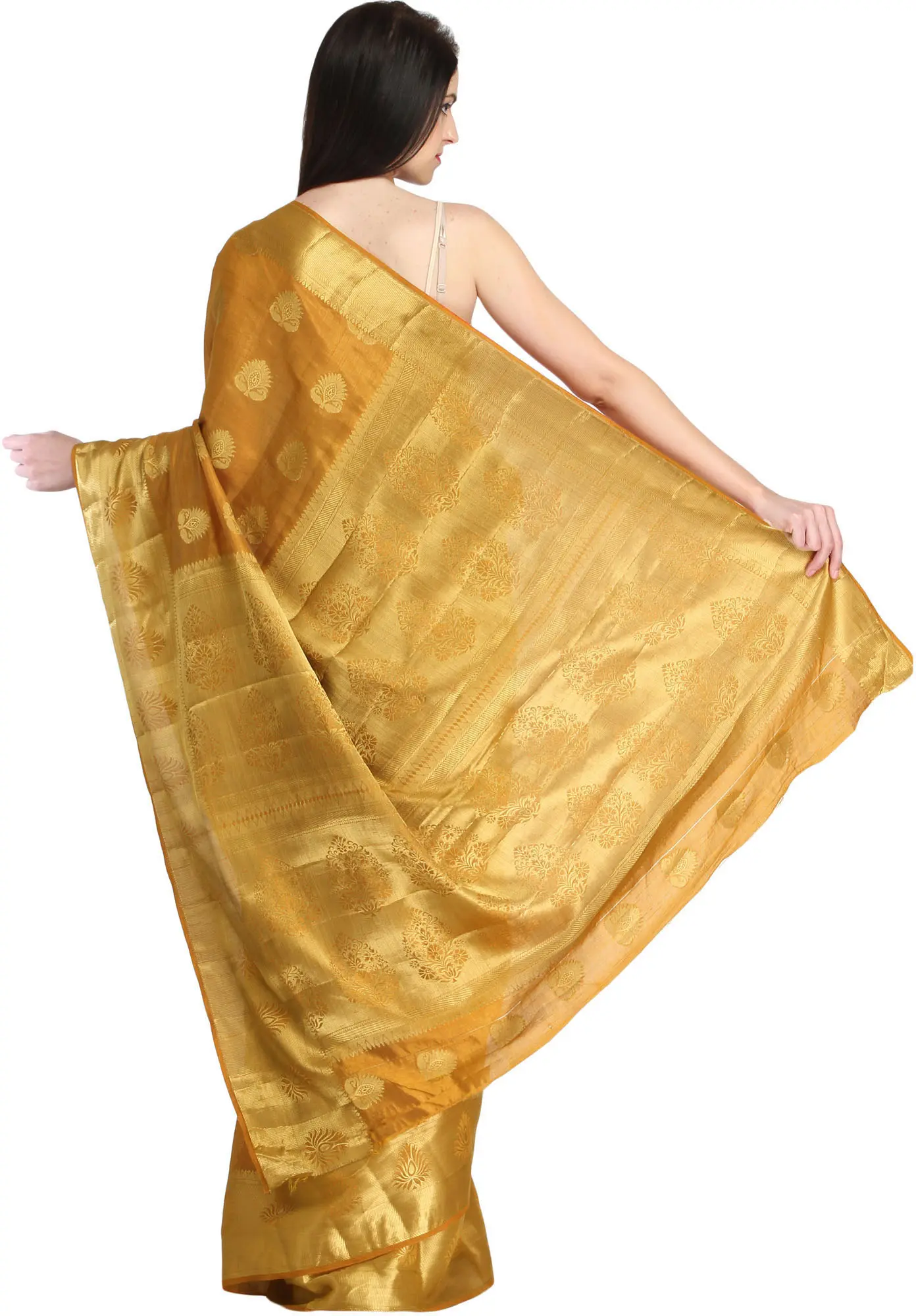 Sudan-Brown Sari from Bangalore with Golden Woven Bootis and Dense Weave on Pallu