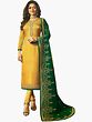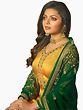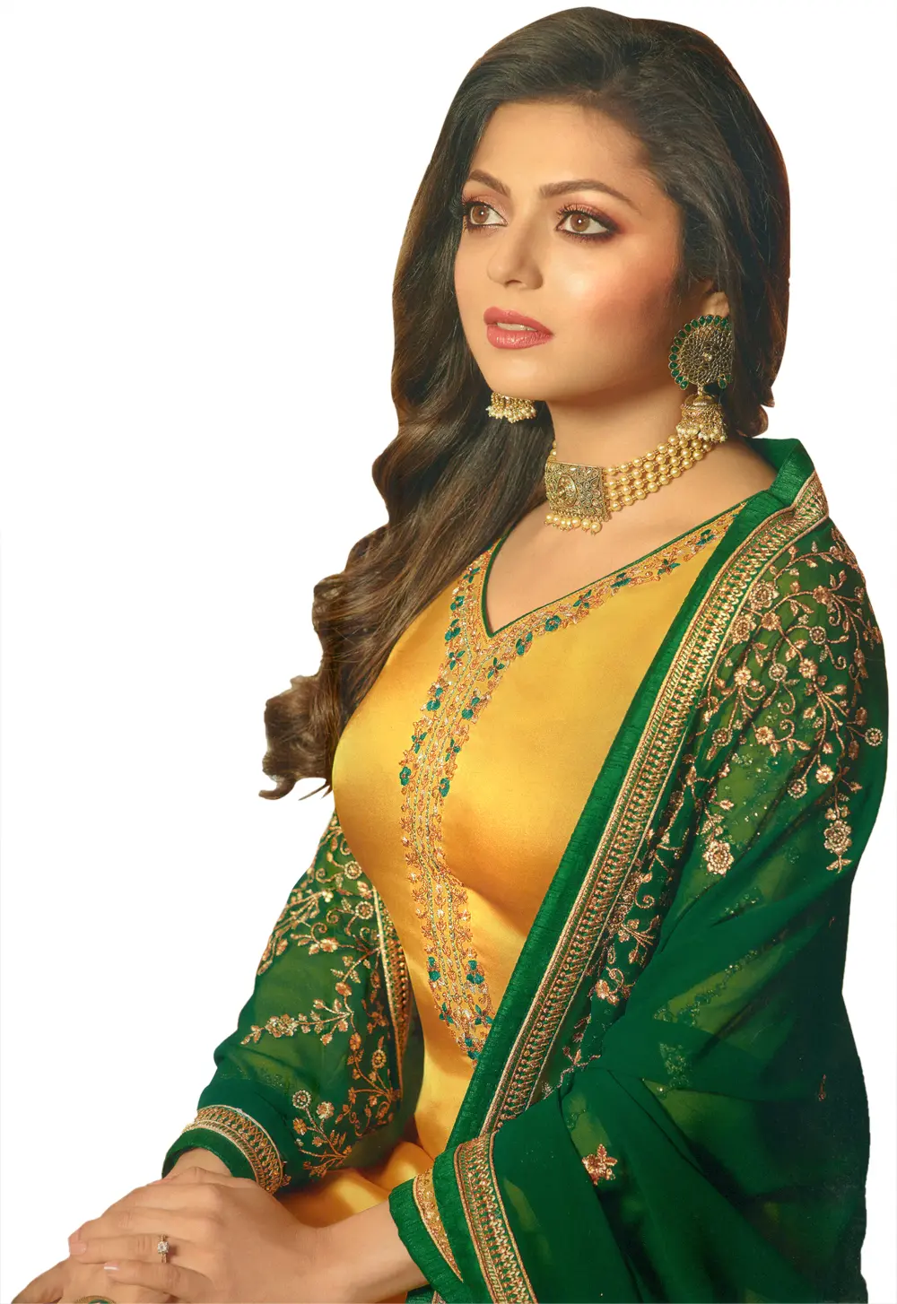 The dominant colour is a mustard-mixed gold. The close-fitted choodidar trousers are a solid colour, and so is the kameez but for the hint of embroidery down the bust. Zoom in on the miniscule but precise handiwork that graces the raised neckline and the line of symmetry down the bust. The green of the hemlines and the dupatta makes for a natural, vibrant colour contrast. Note the lush embroidery along the edges of the translucent chiffon dupatta.