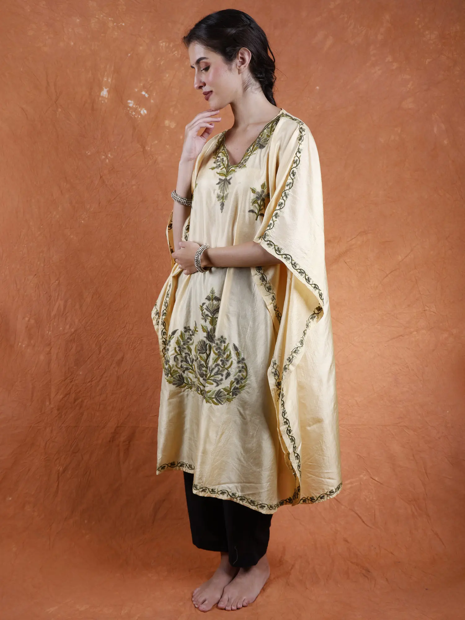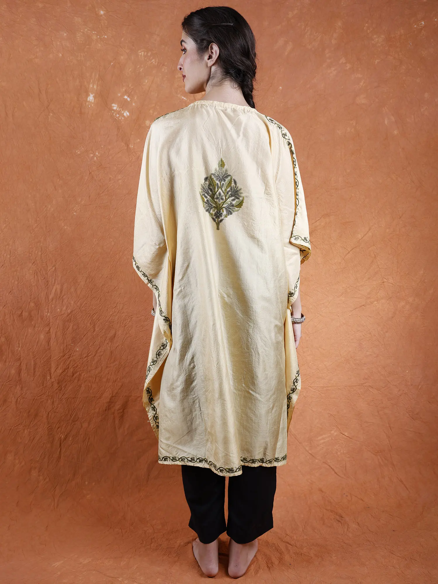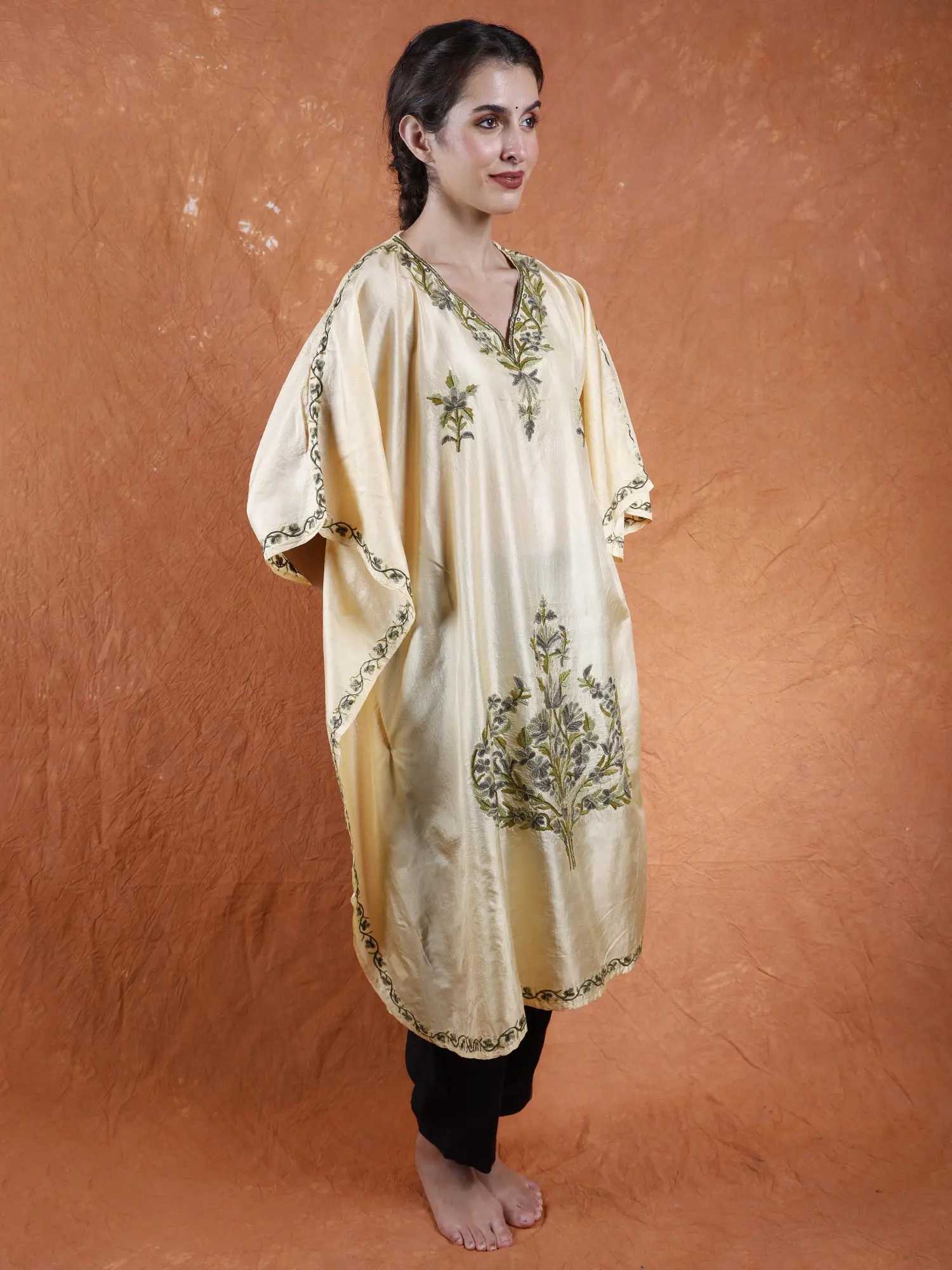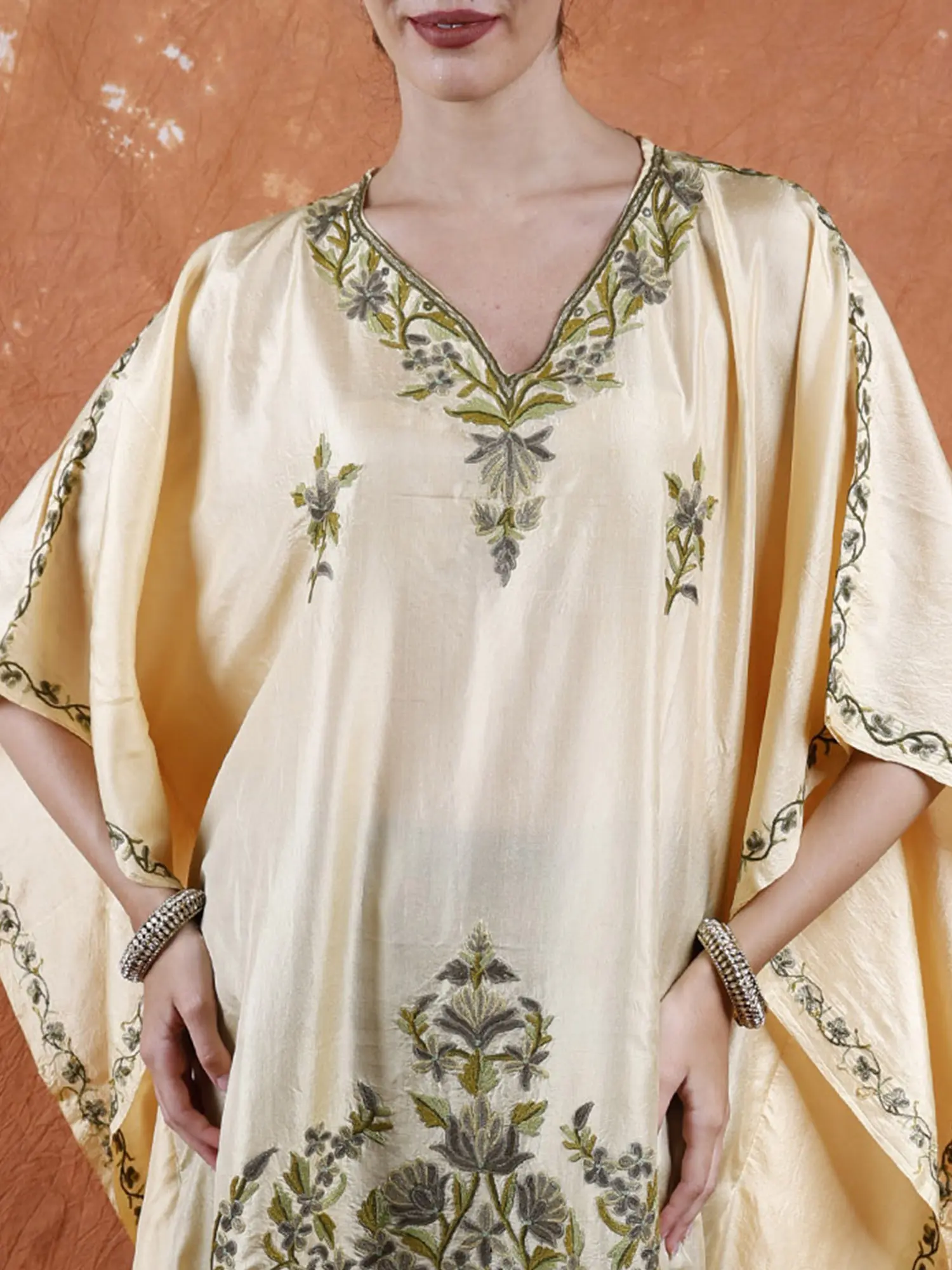 This Summer-Melon Pure Silk Short Kaftan from Kashmir adorned with exquisite floral Aari embroidery by hand epitomizes luxury and elegance. Its pure silk fabric and intricate craftsmanship elevate it to a statement piece perfect for a summer brunch party or high-class gatherings. The vibrant melon hue and delicate floral motifs ensure it becomes the focal point, capturing attention and admiration. With its combination of style, sophistication, and craftsmanship, this kaftan effortlessly exudes luxury and is the ideal choice for making a lasting impression at any upscale event.
