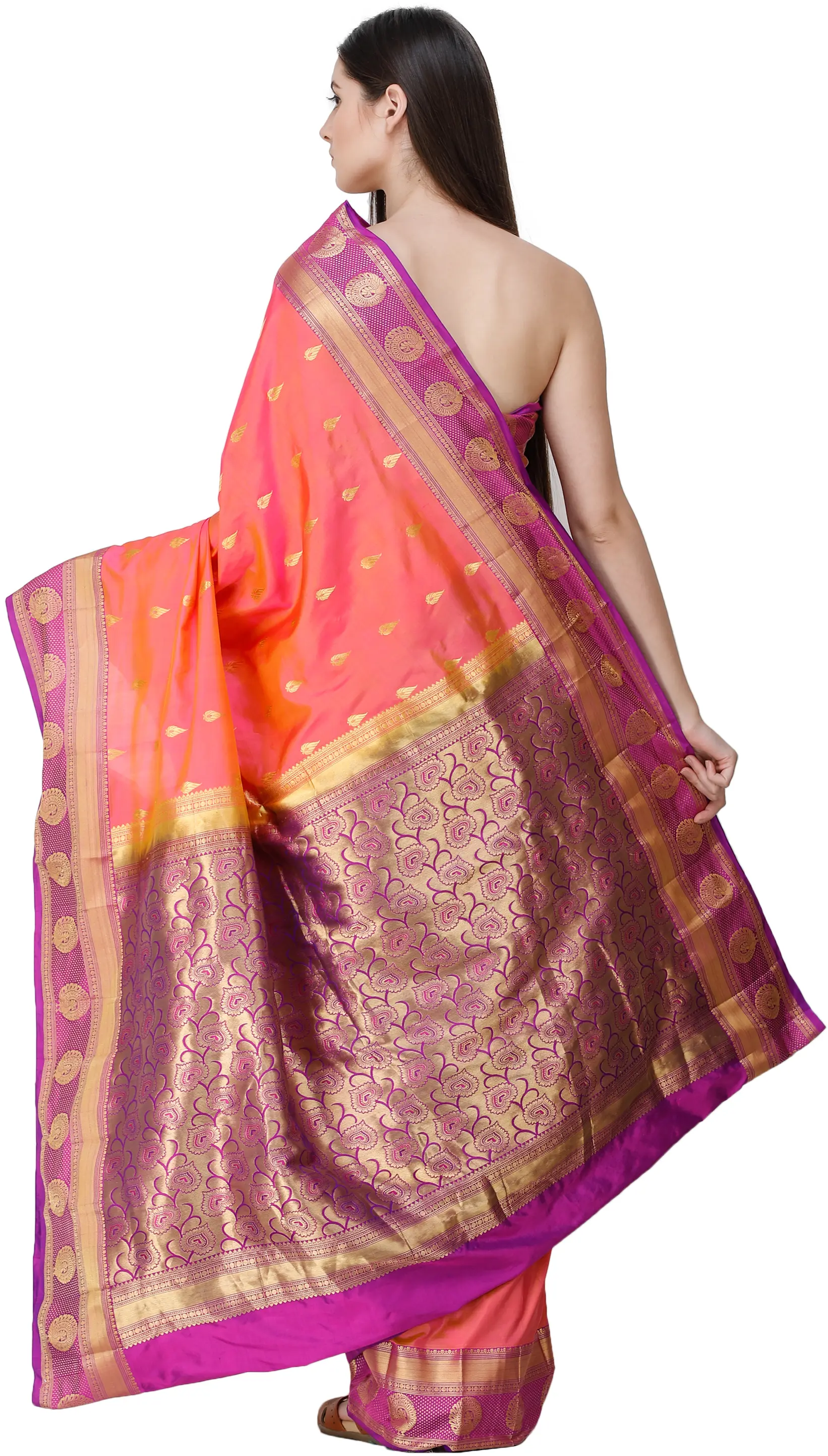 Sunset-Gold Floral Pattern Pure Silk Saree from Bangalore with Zari Weave