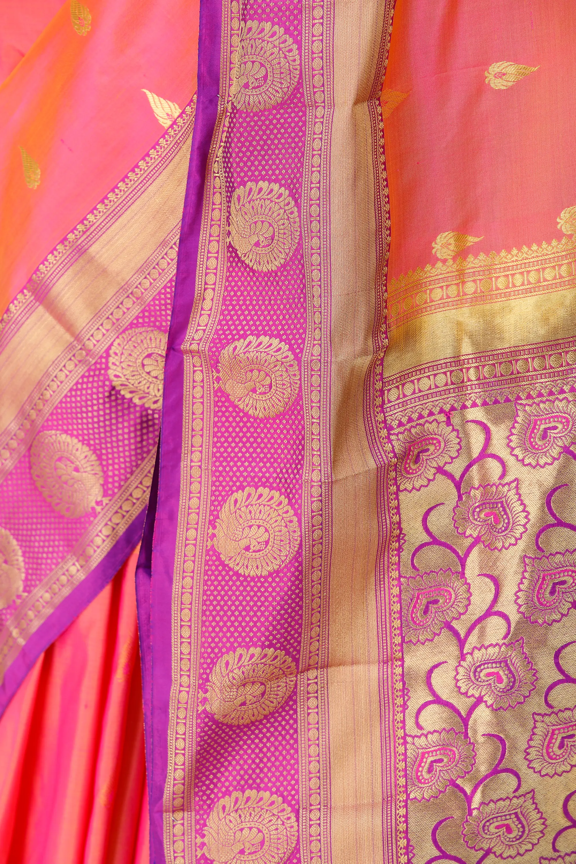 The true artistry of this sari lies in its elaborate zari-woven bootis that adorn the border and pallu. These meticulously crafted motifs in gleaming gold zari create a stunning contrast against the rich sunkist-coral silk. The border features a captivating band of traditional bootis, each intricately woven to showcase a sense of depth and detail. The pallu, the crowning glory of any sari, is a canvas of breathtaking designs. Here, the zari work is even more elaborate, featuring a grander pattern that draws the eye and speaks volumes of its regal heritage. The intricate floral and paisley motifs woven in zari are a visual delight, adding a touch of grandeur and timeless charm.