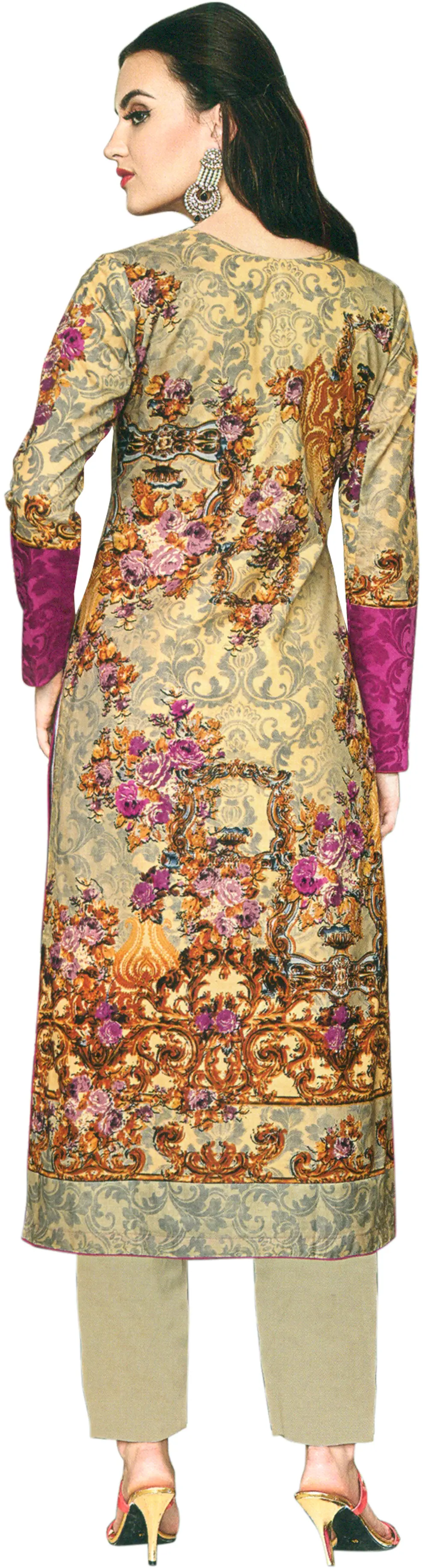Long Printed Salwar Kameez with Crewel Embroidered Flowers on Neck and Faux Pearls