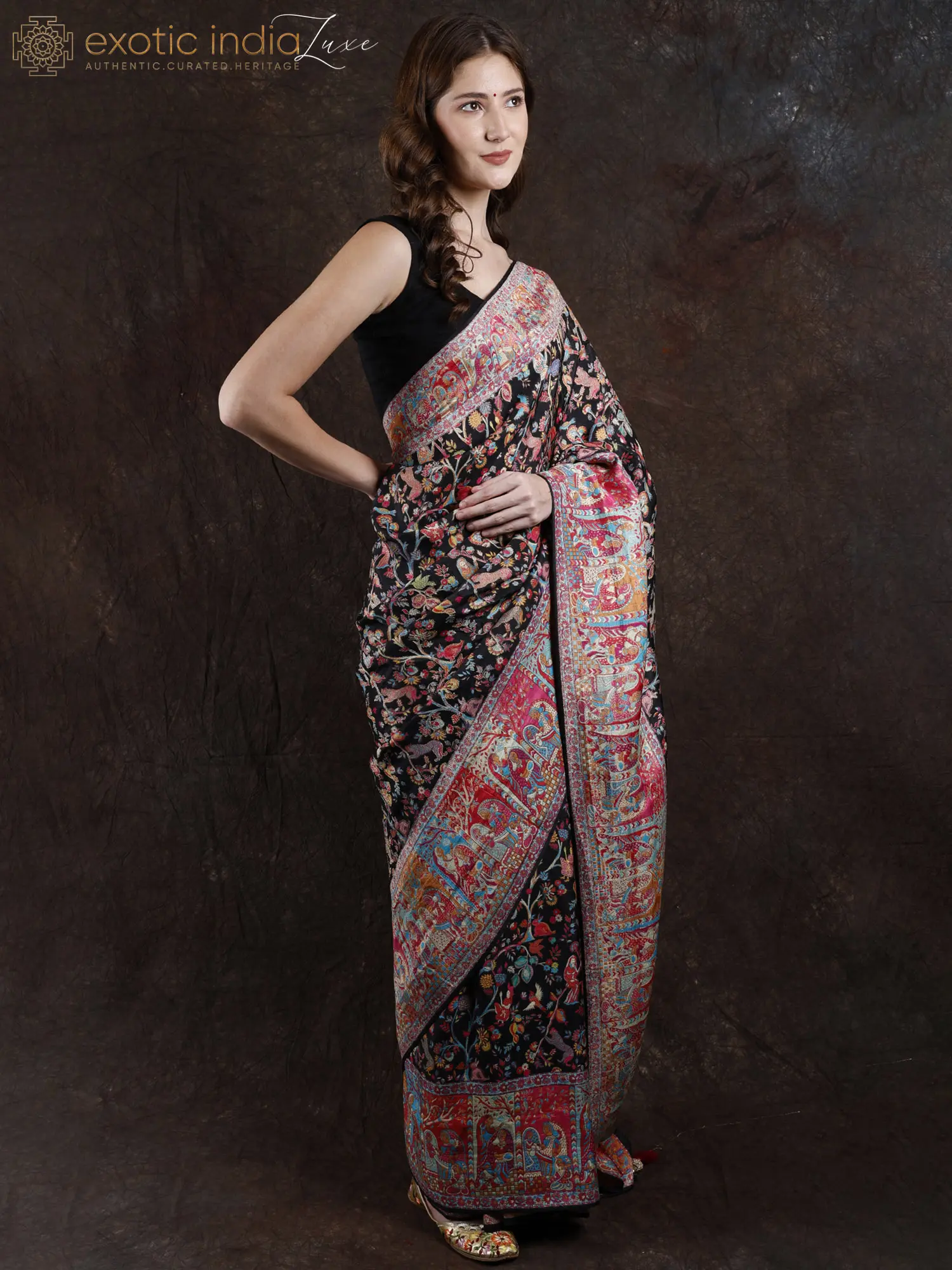 Pirate-Black Kani Saree from Kashmir with Shikargah Scenes Woven by Hand