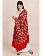 The high radiating shade of the shawl is as vivid like its been bathed in the colour red. The beautiful patterns, the pure material that sits just right on the skin, the ravishing elegance all together make this stole a must have in your wardrobe. Perfect to showcase the festivity of colours, traditionality and dash on femininity, this shawl fits well with all ethnic attires and perfectly compliments the beauty of the wearer. Its royal, empress look makes this stole the perfect choice for anyone looking for a stole that speaks their story.