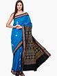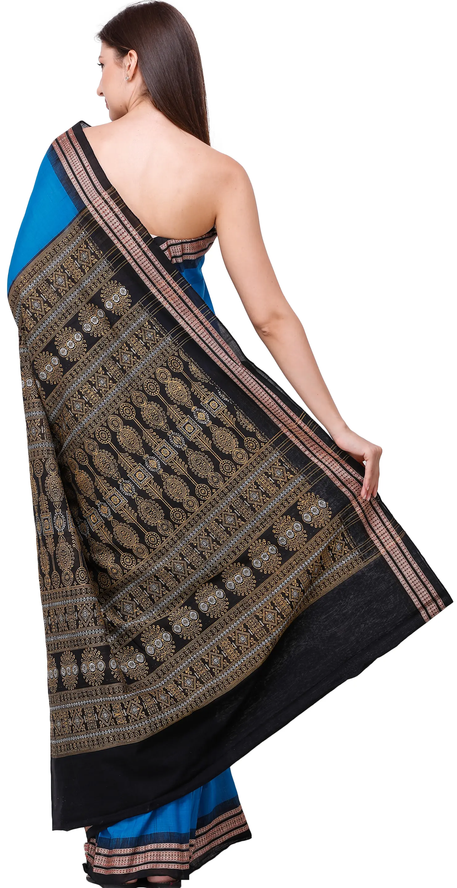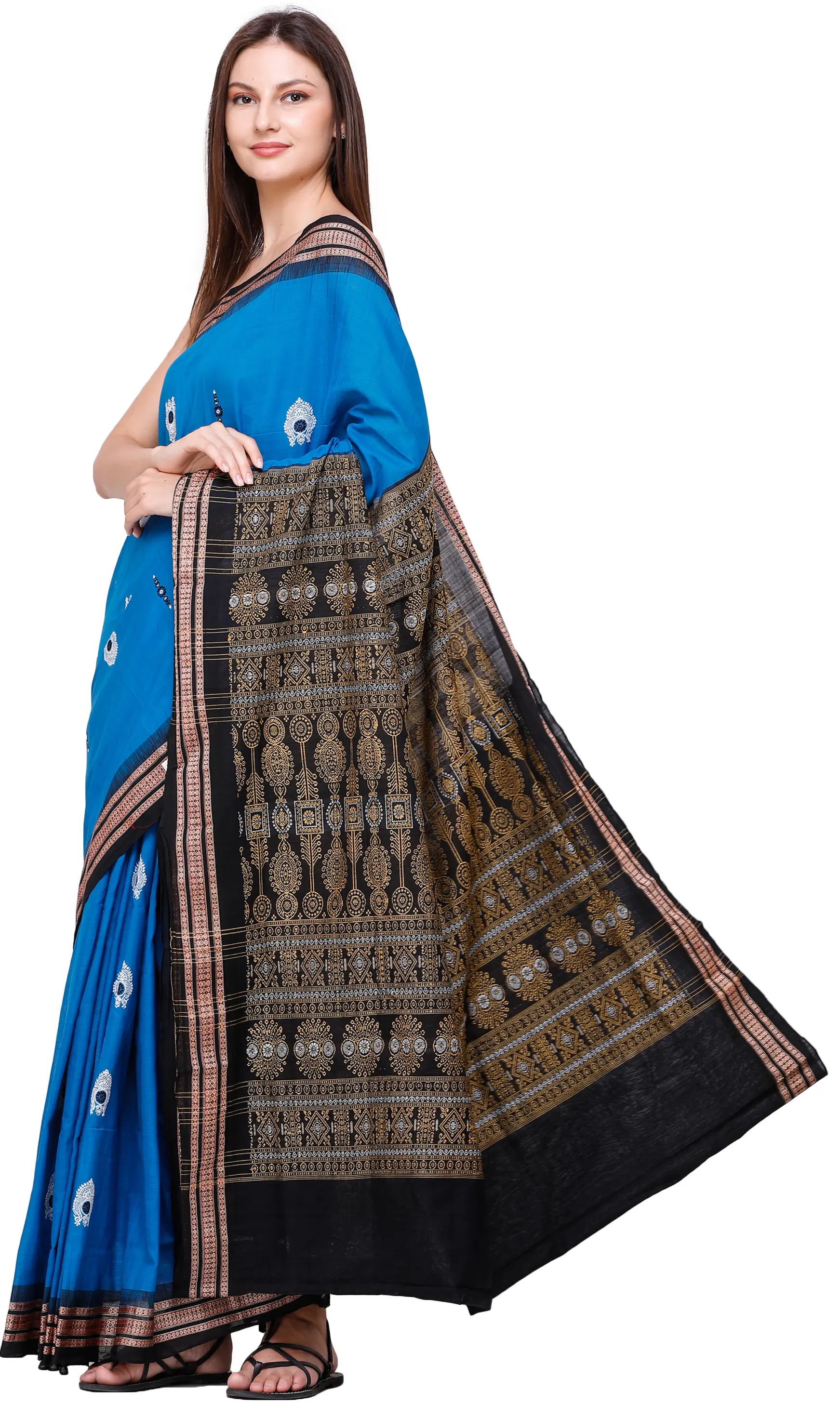 Swedish-Blue Bomkai Sari from Orissa with Motifs and Hand-Woven Bootis on Pallu