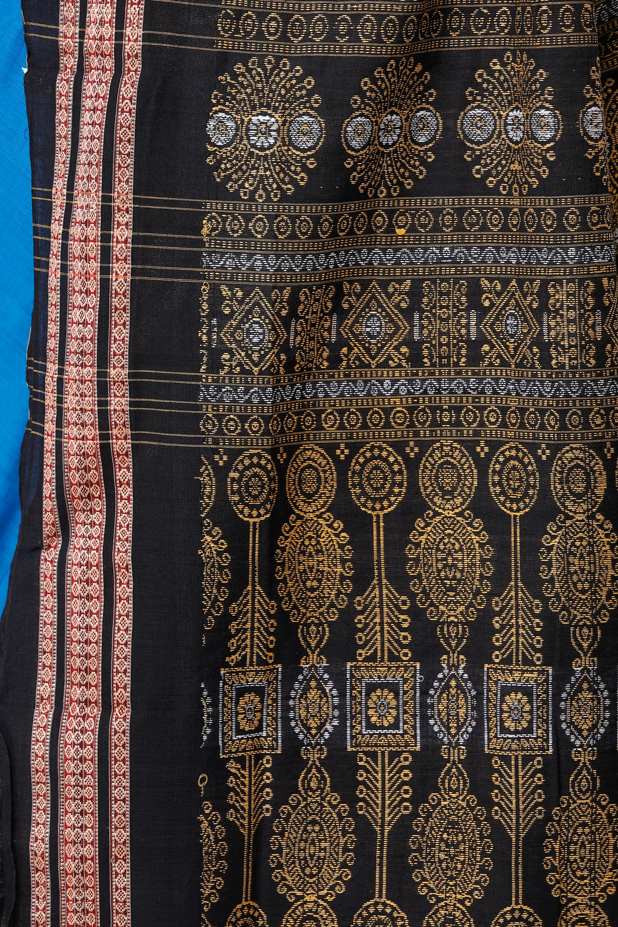 The true showstopper lies in the richly detailed pallu. Here, the traditional Bomkai artistry comes to life in a stunning contrast of black, gold, and white threads. Intricately woven bootis, arranged in horizontal bands, showcase a mesmerizing geometric and floral symphony. Each motif is a miniature work of art, reflecting the skilled craftsmanship and deep-rooted traditions of Odisha's weaving community. The interplay of contrasting colors and textures creates a visual feast, making this pallu an undeniable statement piece.