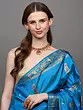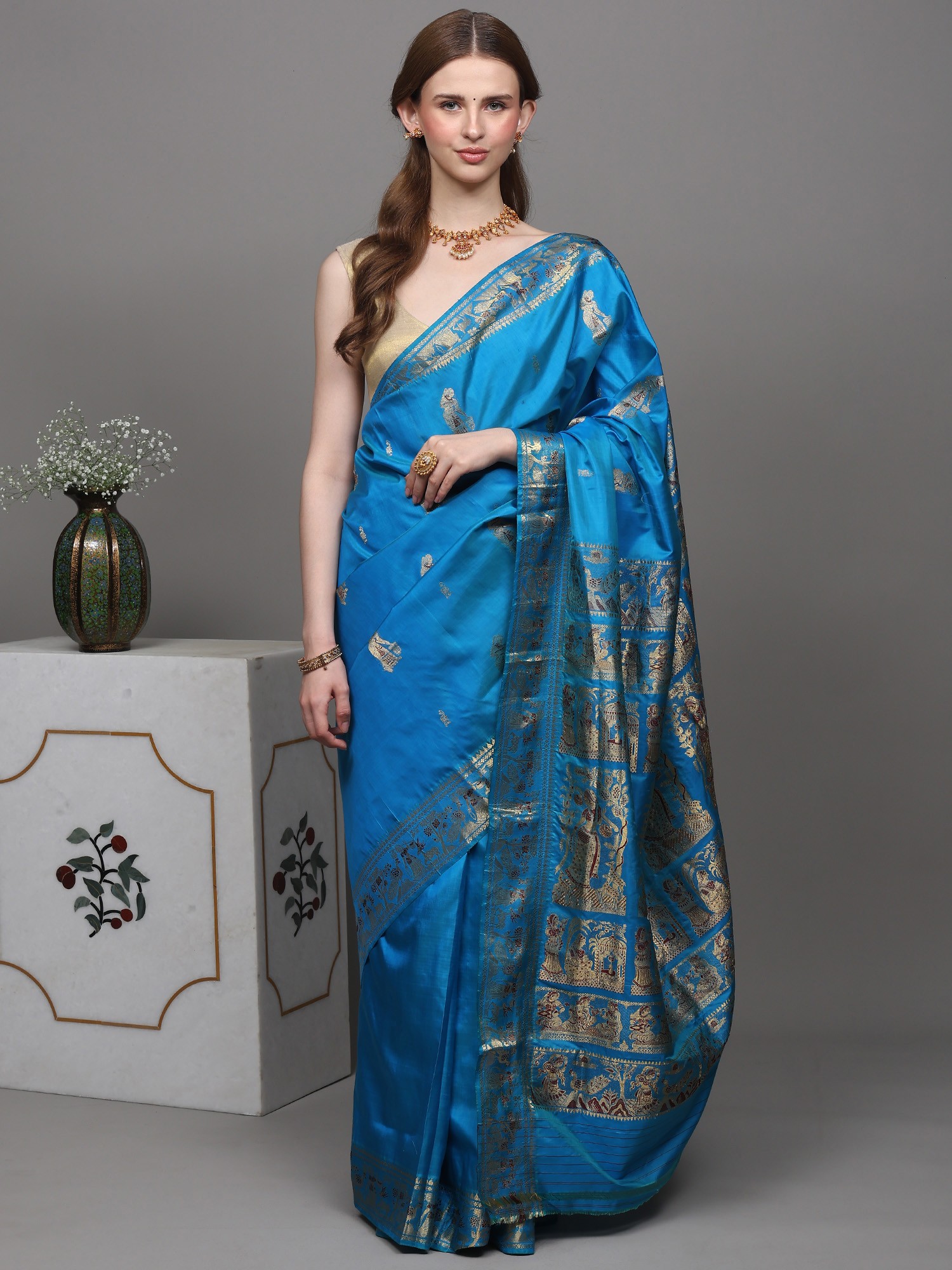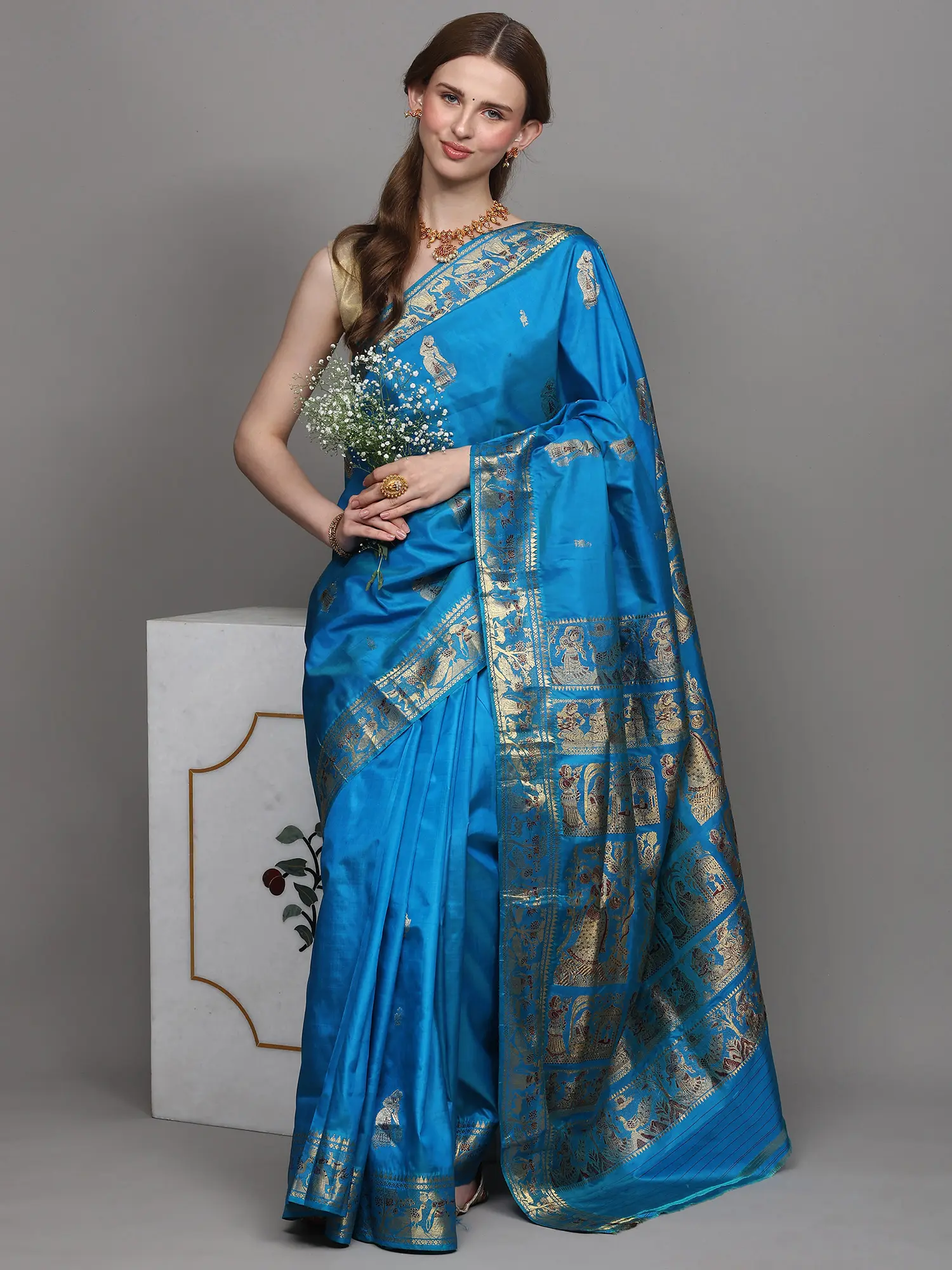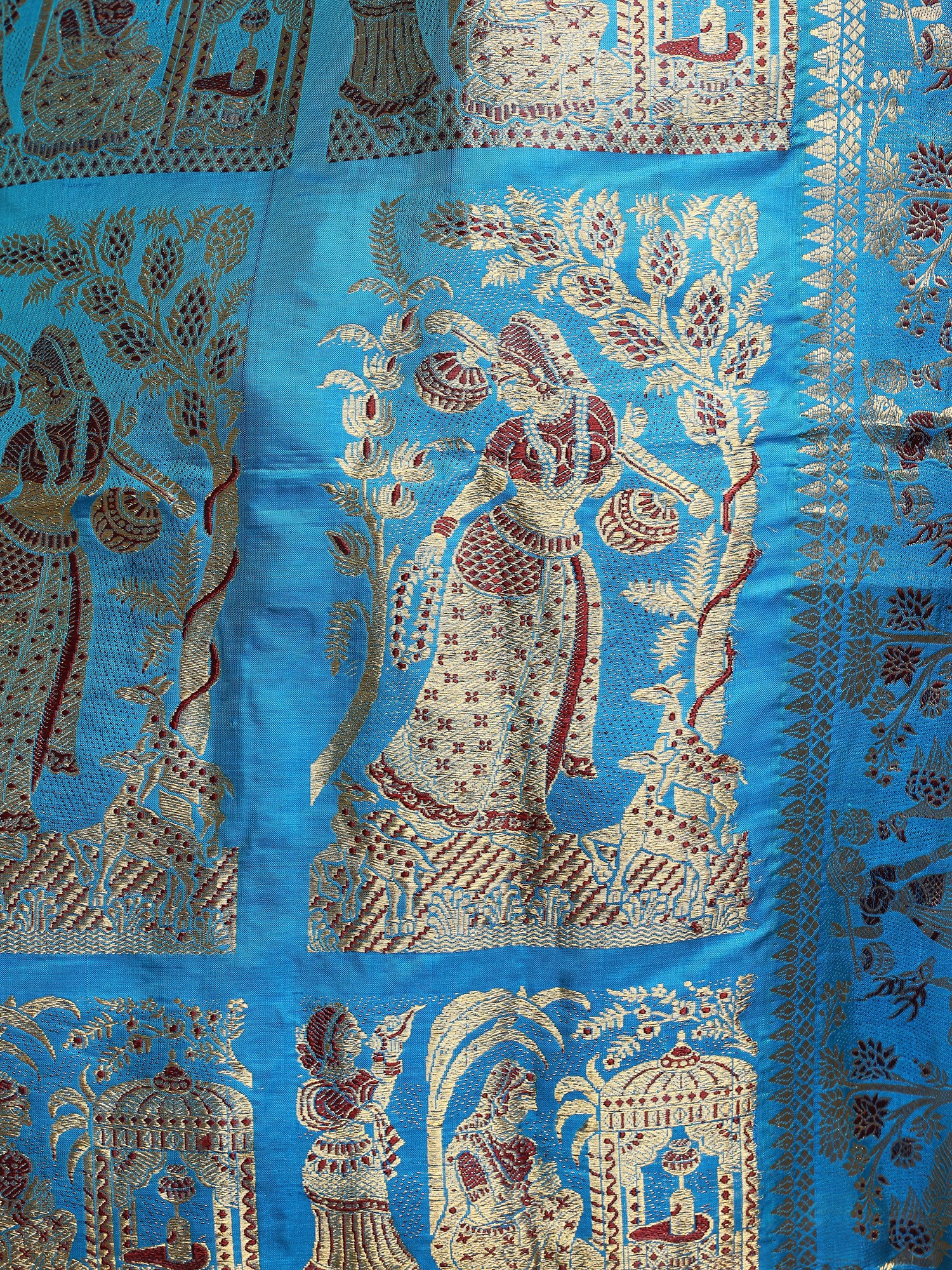 This blue colour saree with zari work will add a touch of royalty to your wardrobe. The saree illustrates Hindu mythological episodes. The sophisticated thread weave in maroon and golden colour is adding a touch of class. This is destined to become one of your statement sarees.