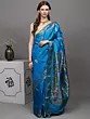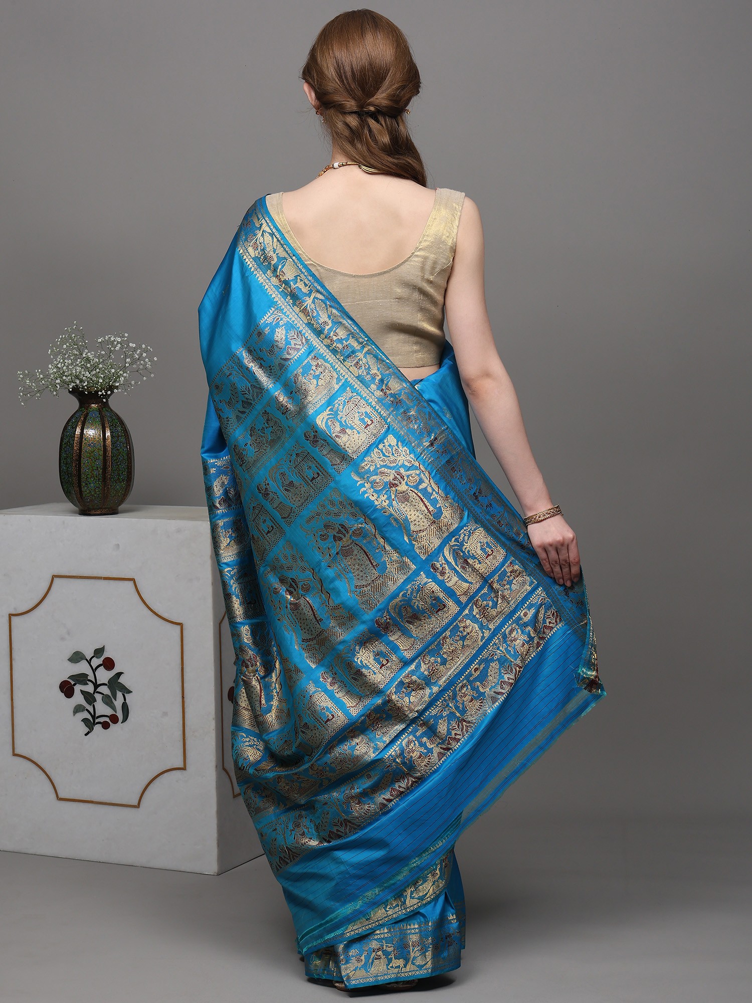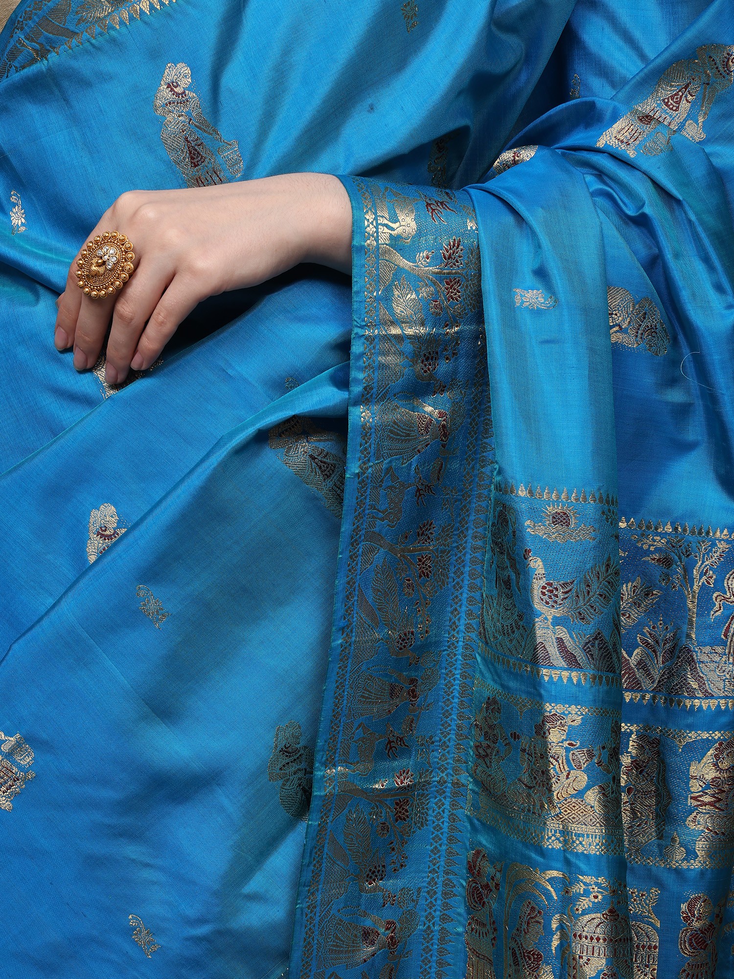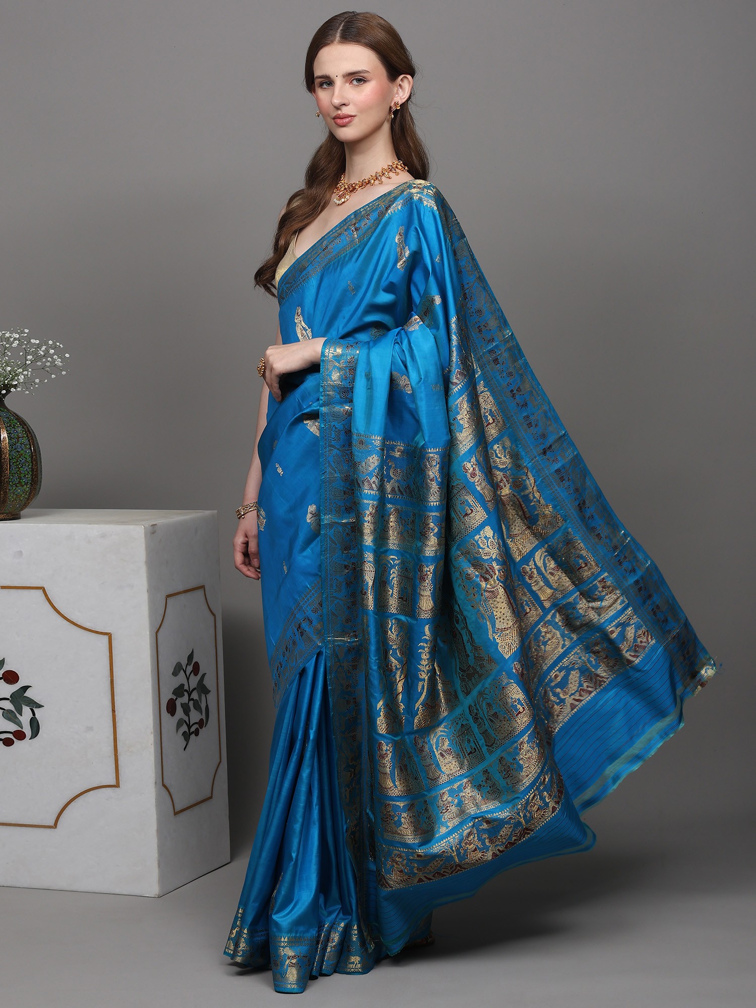 This blue colour saree with zari work will add a touch of royalty to your wardrobe. The saree illustrates Hindu mythological episodes. The sophisticated thread weave in maroon and golden colour is adding a touch of class. This is destined to become one of your statement sarees.