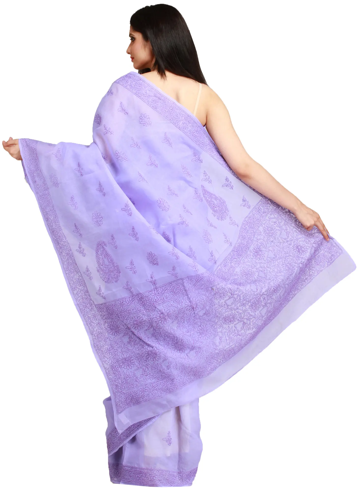 Sweet-Lavender Sari from Lucknow with Chikan Embroidery by Hand