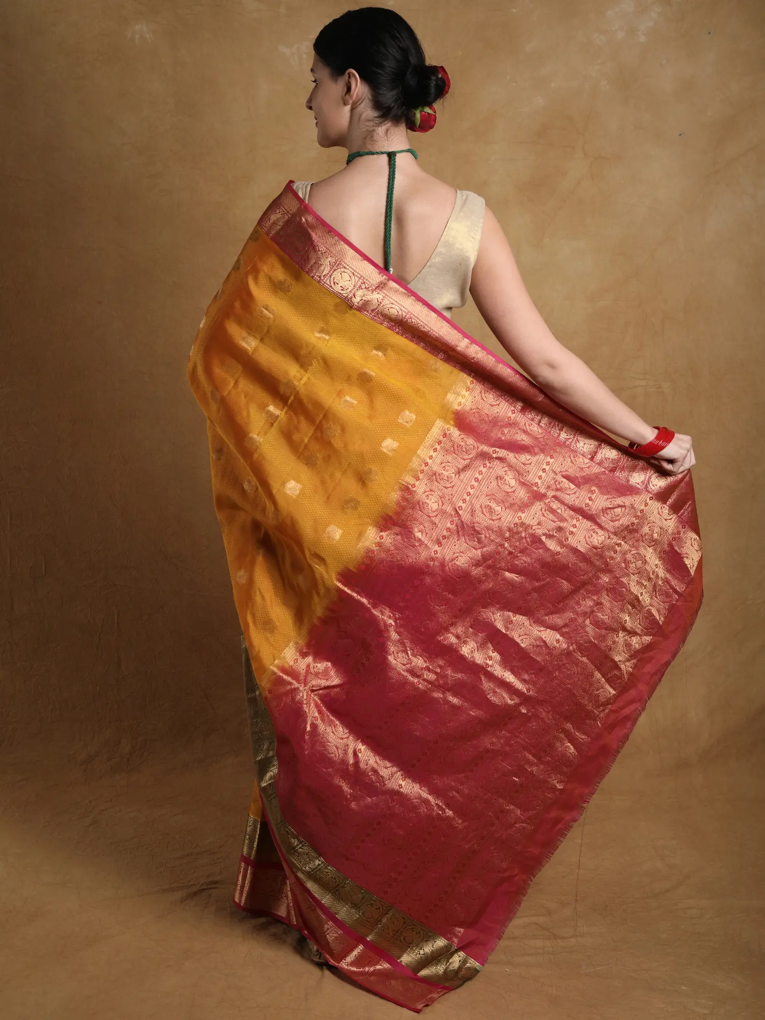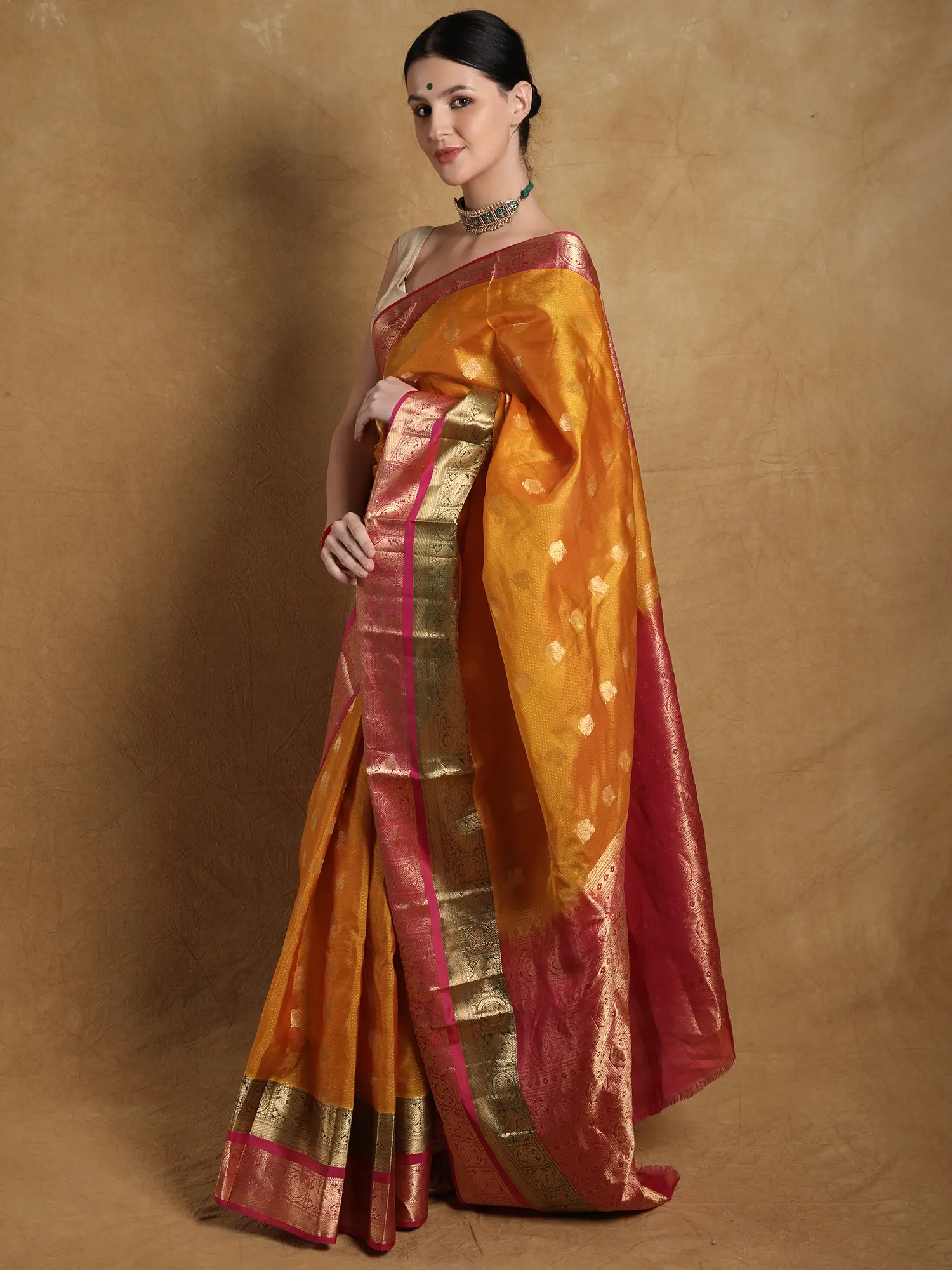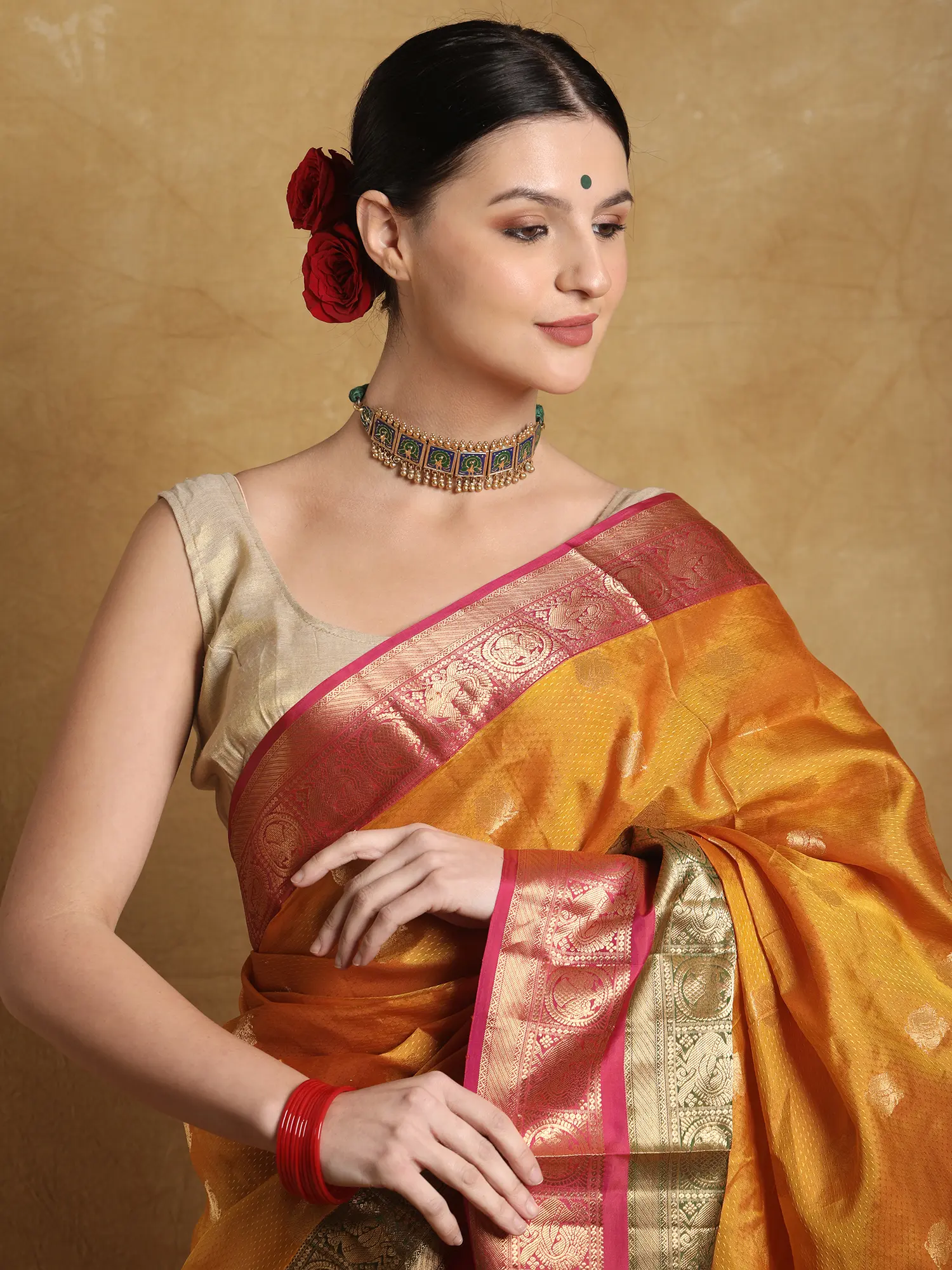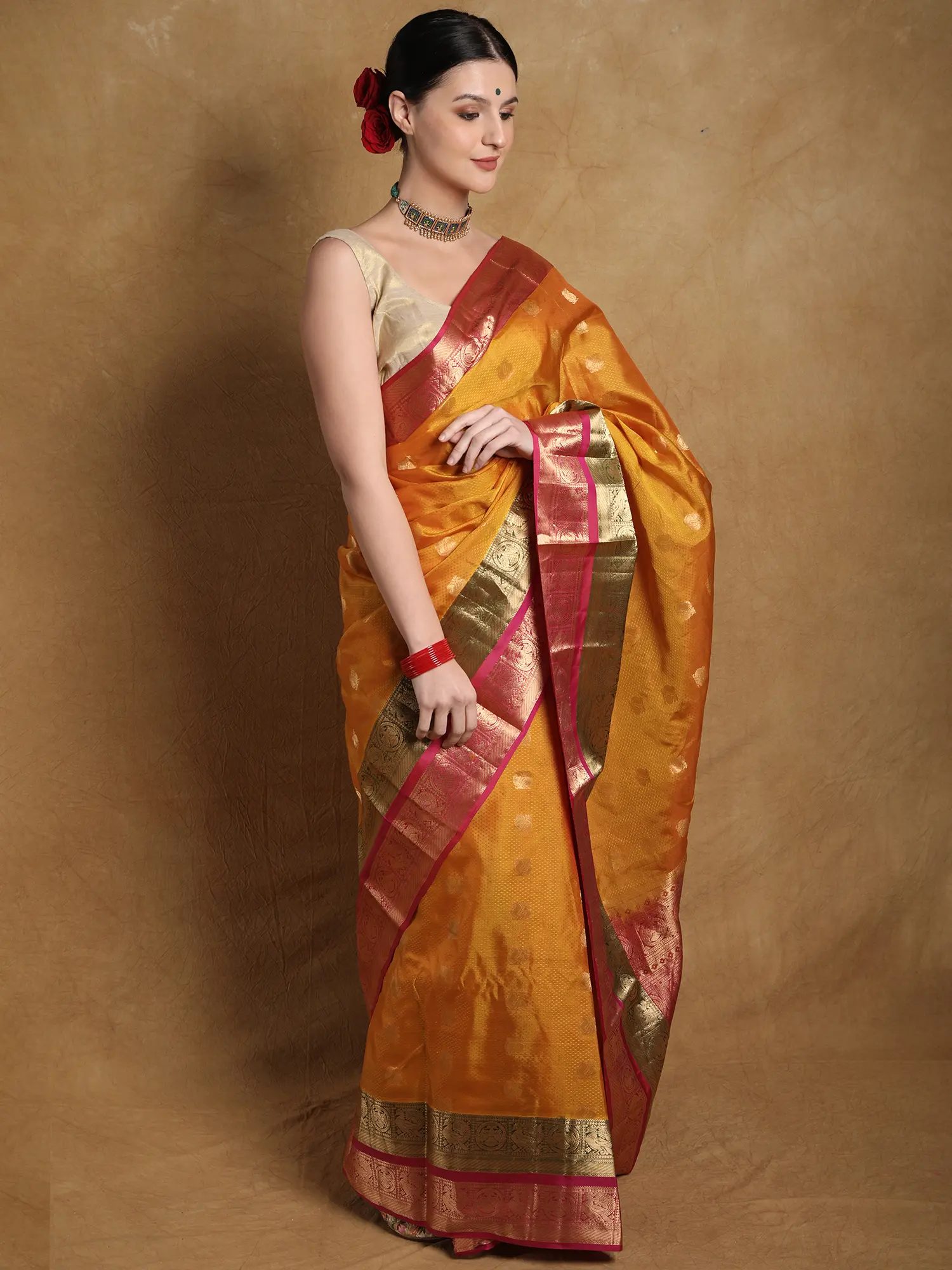 Culture woven into luxurious silk, this symphonic sunset brocaded silk saree from Karnataka is a treasure of traditional and auspicious motifs, borrowed from the sacred temples that adorn the landscape of Karnataka. The delicate fabric is enriched with the legendary Garudabherunda or Bherunda, a two-headed eagle, a form of Vishnu, and a historical emblem of Karnataka. The field of the saree is covered in the Annam bird motif, another fortunate symbol from the culture of India. This silk saree is an artistic drape with a rich brocade work on the endpiece.