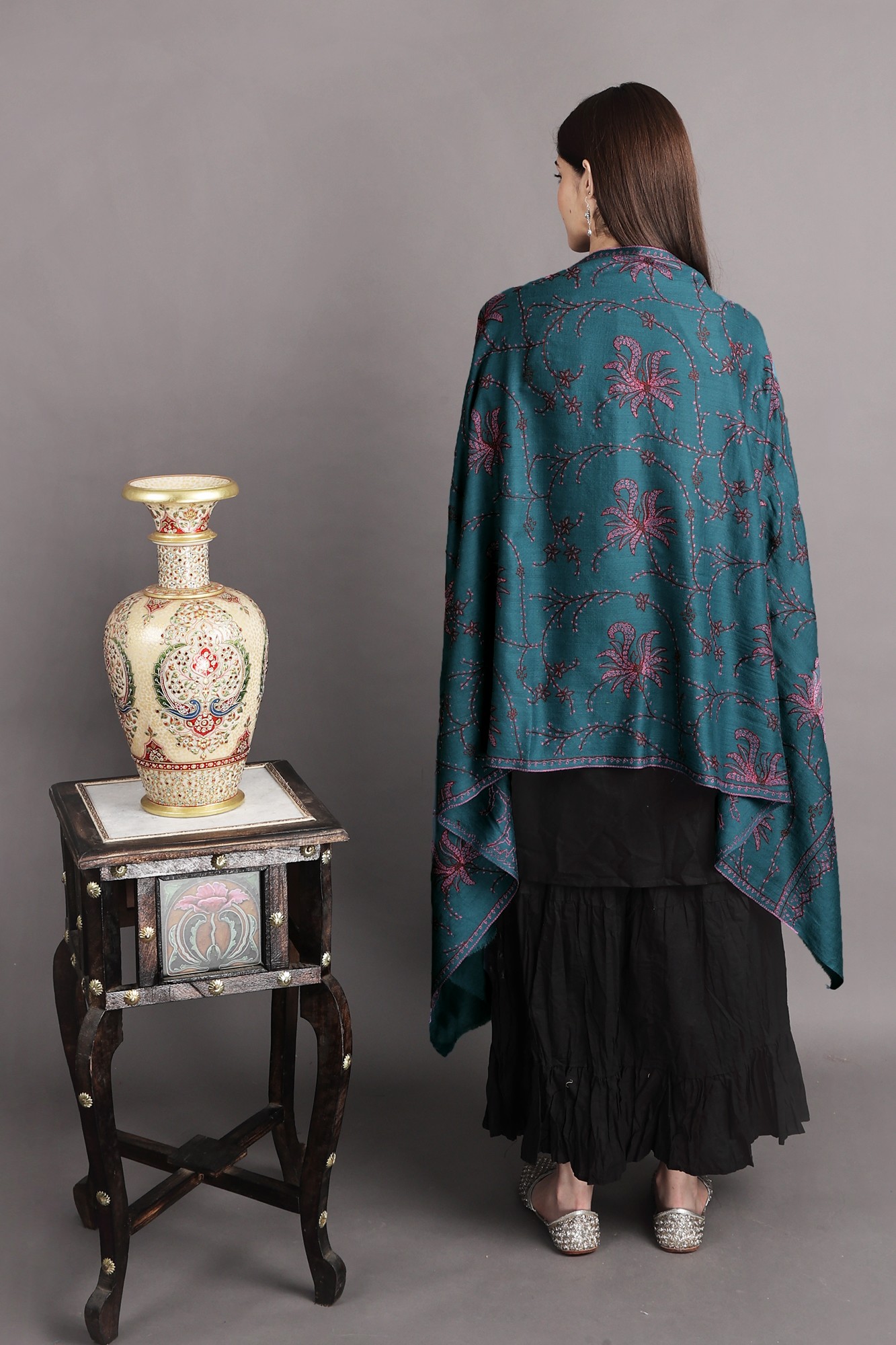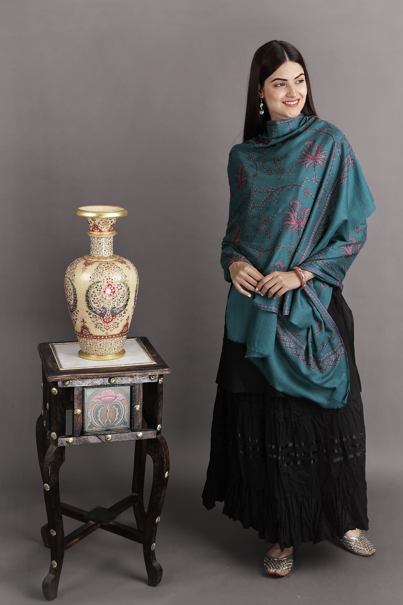 The alluring Tahitian-Tide Tusha Stole from Kashmir with Sozni hand-embroidered leaves. Tusha silk, derived from the underbelly of Himalayan silkworms, is known for its exquisite softness. This stole is a legacy to the craftsmanship of Kashmiri artisans who have perfected the art of weaving this delicate fabric. The hand-embroidered leaves, a symbol of nature's beauty, tell a story of precision and patience. The rich blue hue mirrors the tranquil waters of Tahiti. Each thread and each leaf reflects the dedication of artisans who have woven tradition into this stole. Wearing it, you carry not just a stole but a piece of Kashmir's rich artistic legacy.