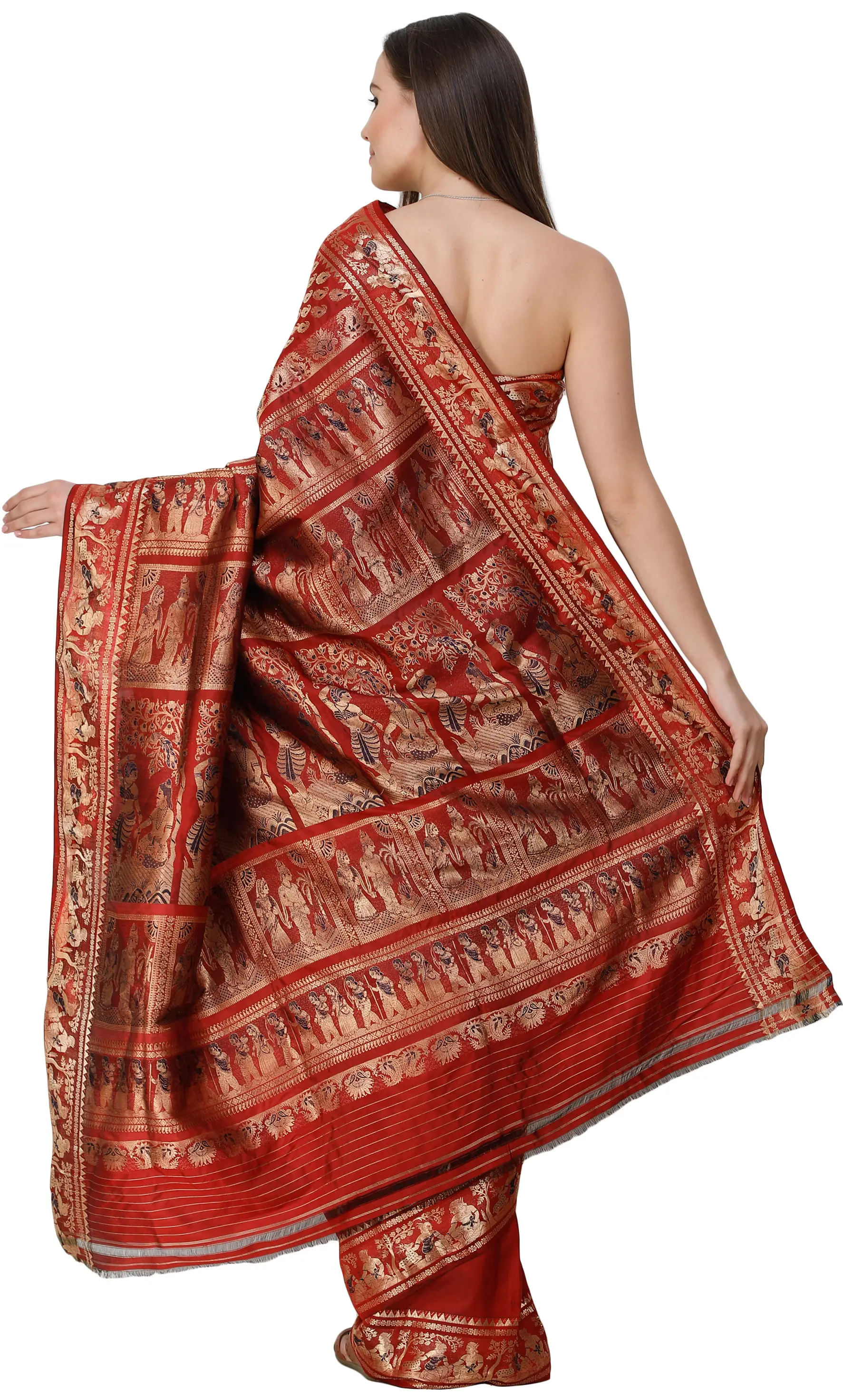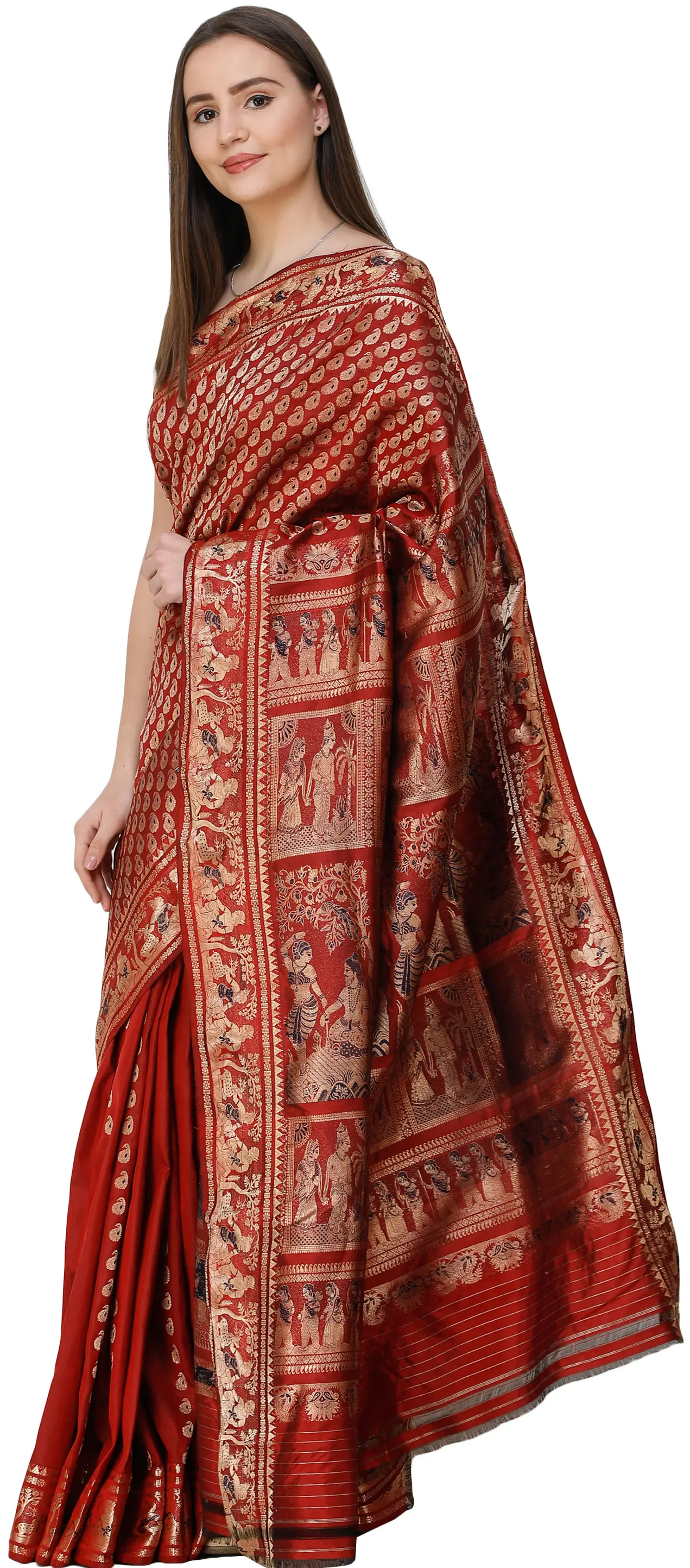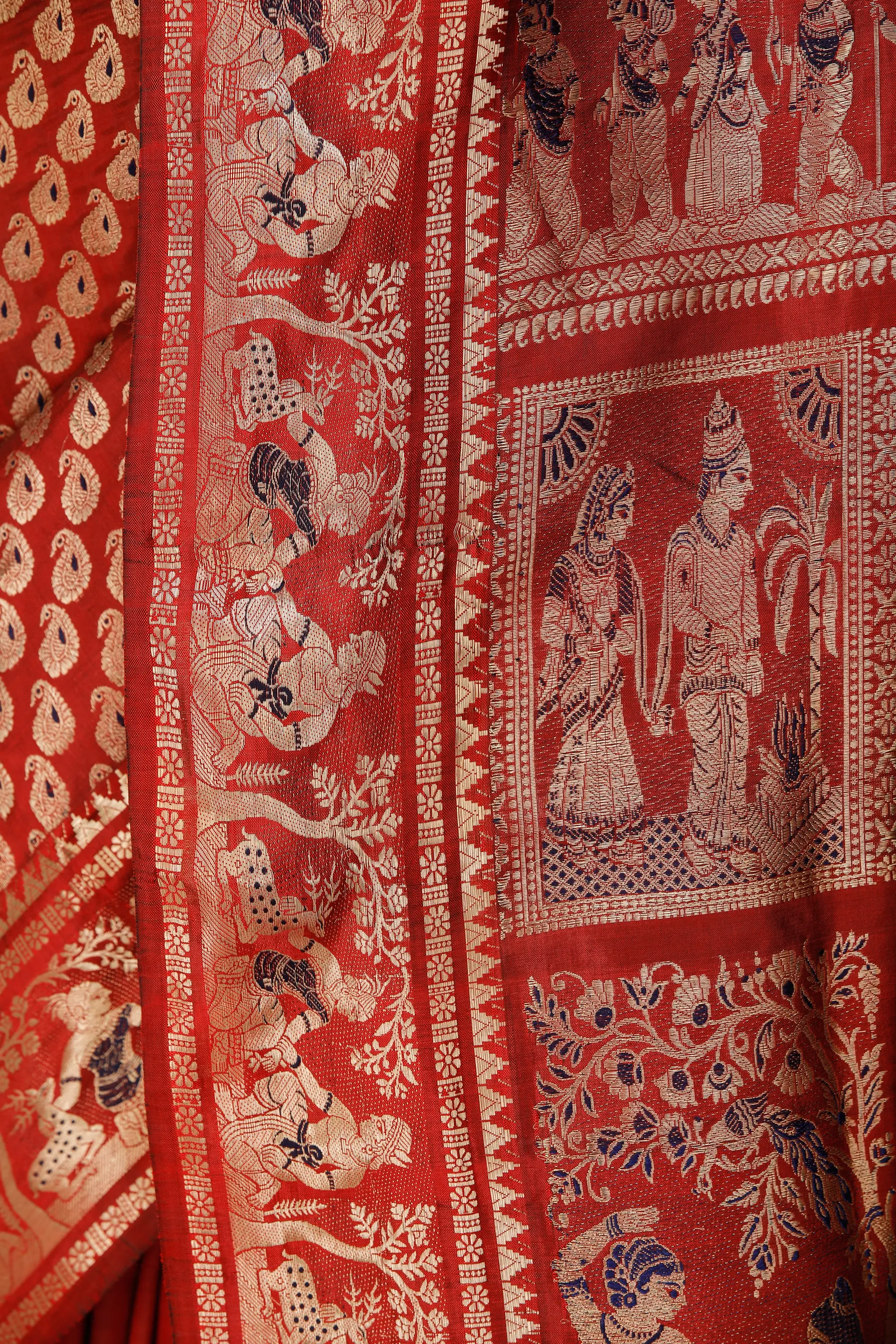 Because the Baluchari is the traditional wedding saree of the Bengali people, the colour is a deep rich red superimposed with gold. The superbly precise motifs on the endpiece depict scenes from the Ramayana, as visual folklore and episodes from the itihasas are the norm with these sarees. Zoom in on the plethora of gold-thread figures arranged in delicately woven panels, in order to appreciate the high-precision handiwork. The same is complemented by the luxuriant solid gold booties across the field of this saree.