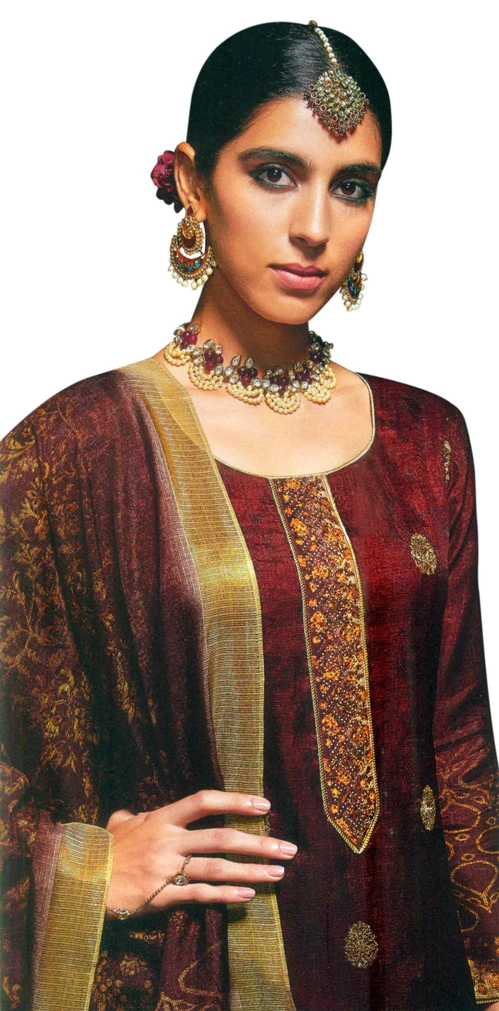 Complementing the kameez are the effortlessly chic palazzo pants. Their long, flowing silhouette provides a modern contrast to the traditional kameez, while ensuring freedom of movement and an elegant drape. The rich fabric of the pants mirrors the deep hue of the kameez, creating a harmonious and cohesive look. Completing this breathtaking ensemble is a generously sized dupatta. This isn't just an accessory; it's a statement piece. The dupatta features a gradient effect, with the deep burgundy transitioning into a lighter shade, adorned with a captivating Zari-woven pattern. The border of the dupatta is a celebration of texture and shine, featuring a band of lustrous golden fabric edged with a delicate fringe of golden threads, adding a final flourish of sophistication.