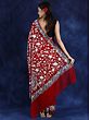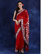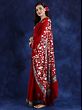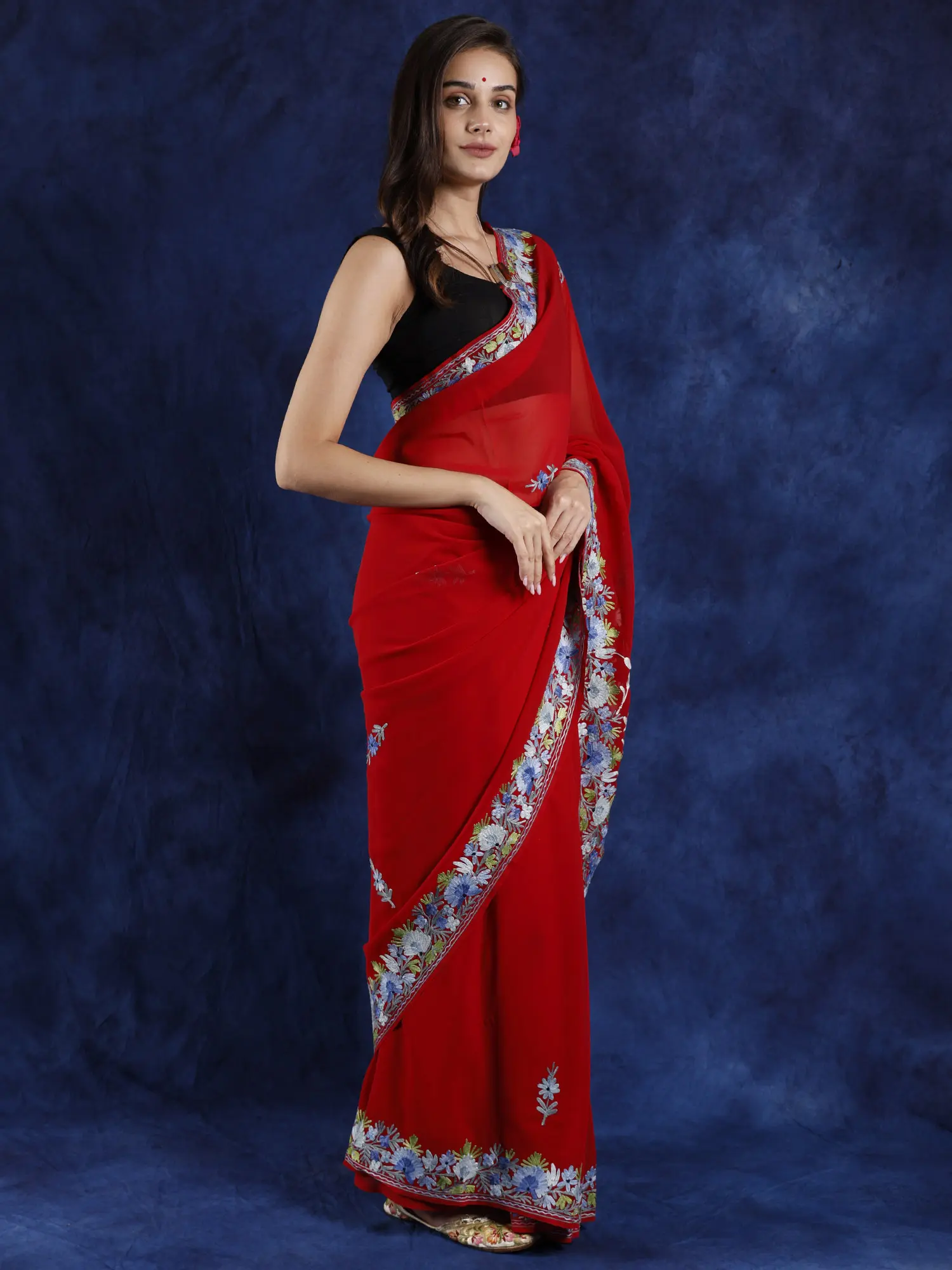 Choose the fiery elegance of a Tango-Red Georgette saree, hailing from the storied land of Kashmir for your wardrobe! The color itself is a timeless poem, a vivid red that speaks volumes without a single word. The lightweight georgette fabric caresses you, offering an effortless grace.