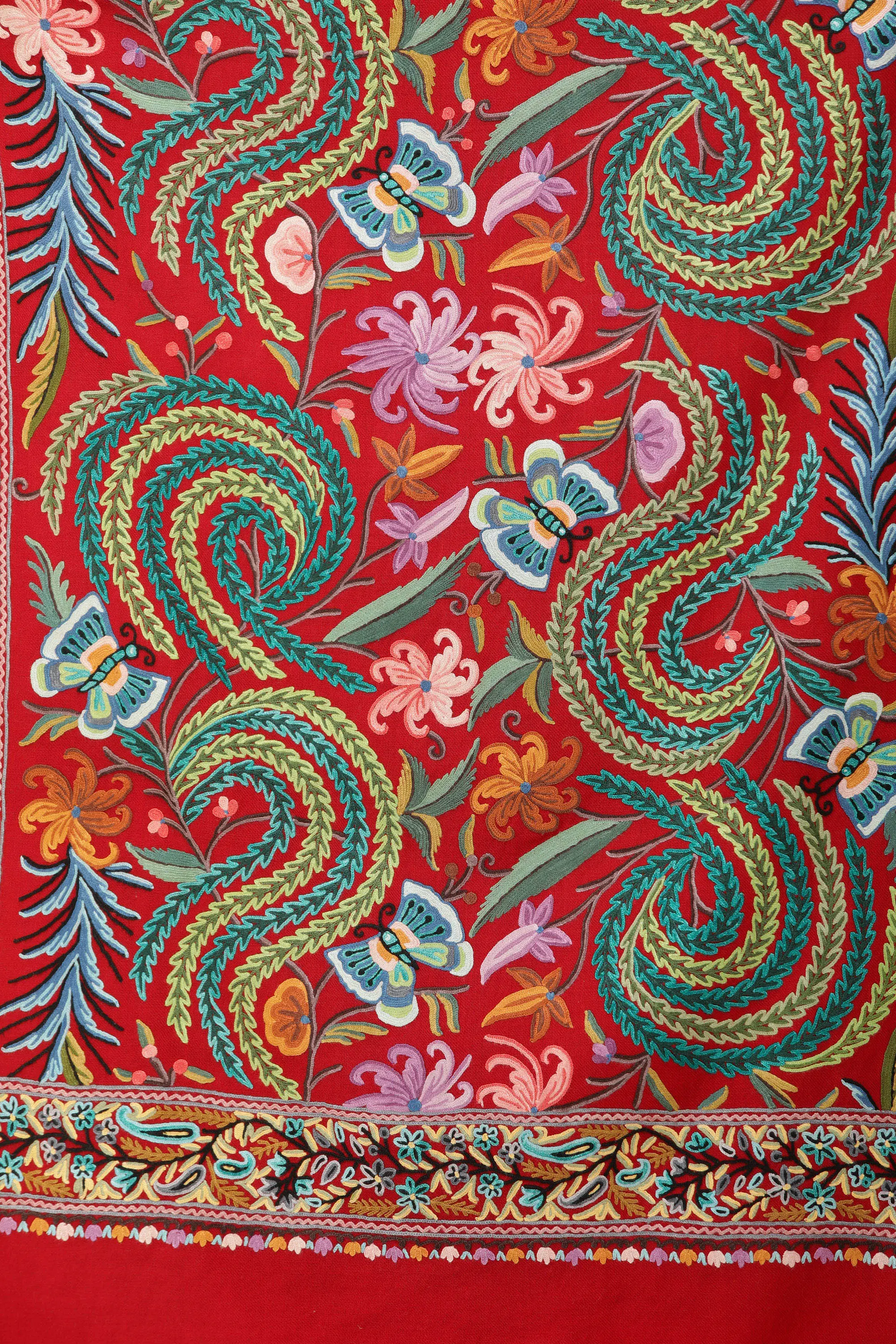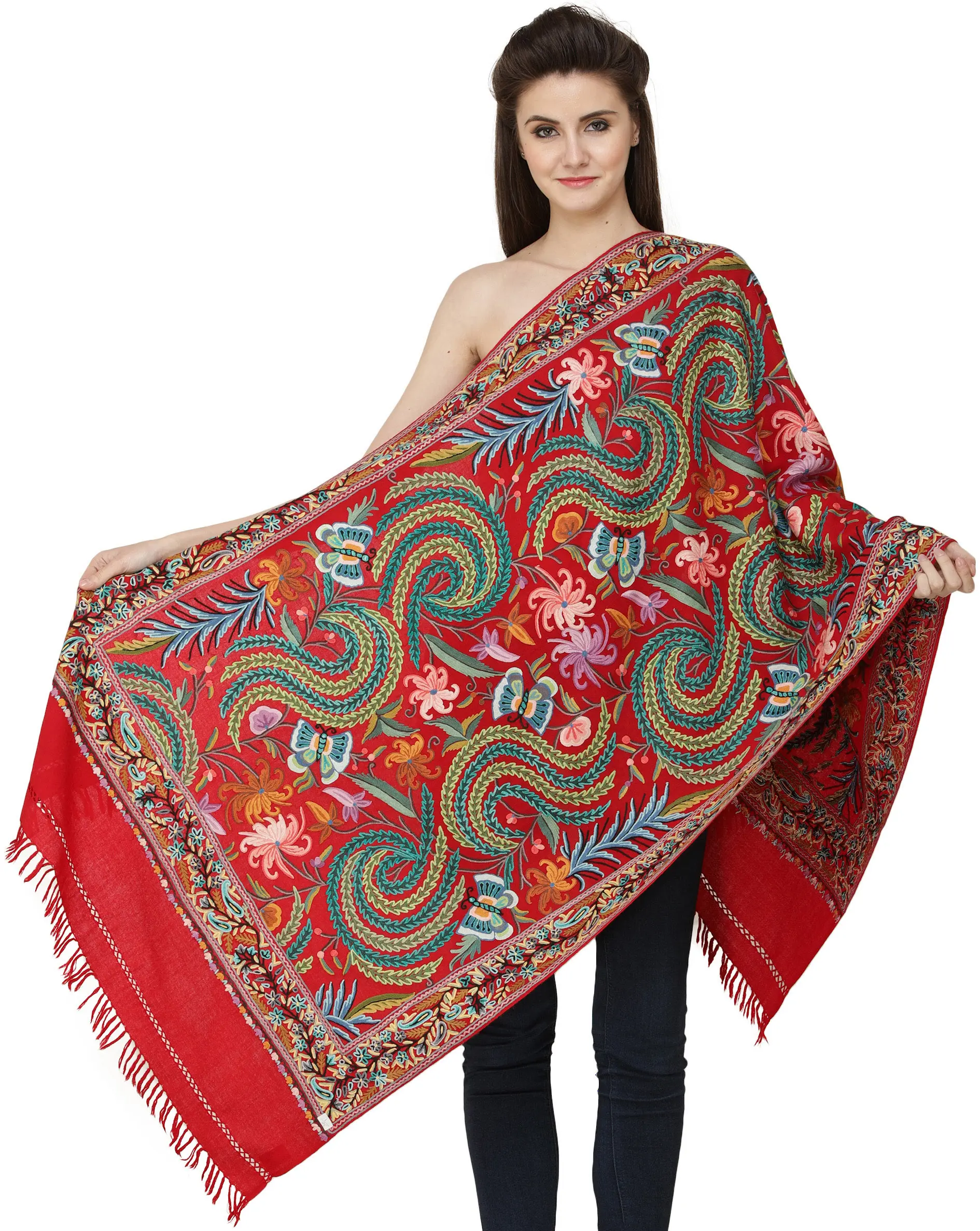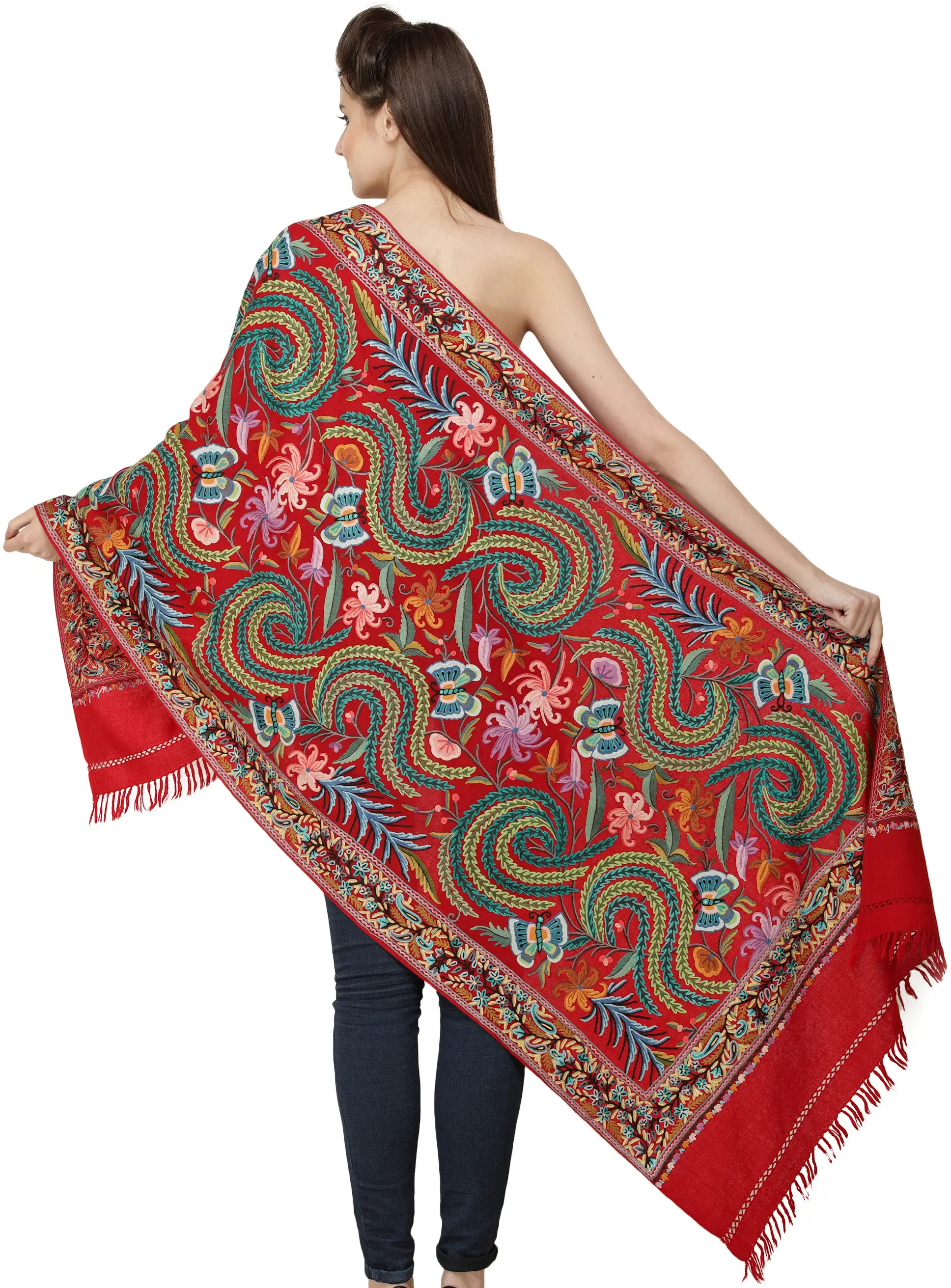 It is fashioned from the pure homegrown wools, and is a fine example of the highly coveted Kashmiri handiwork. Signs of the latter could be gleaned by zooming in on the luxuriant, richly coloured ari embroidery that dominates the foreground. Team this with your choicest Indian suit or saree, preferably a neutral-coloured one that is low on the embroidery, in order to bring out the best of this number. Such a stole would serve to keep you warm yet fashionable-looking when the galas run a tad late into the evening.