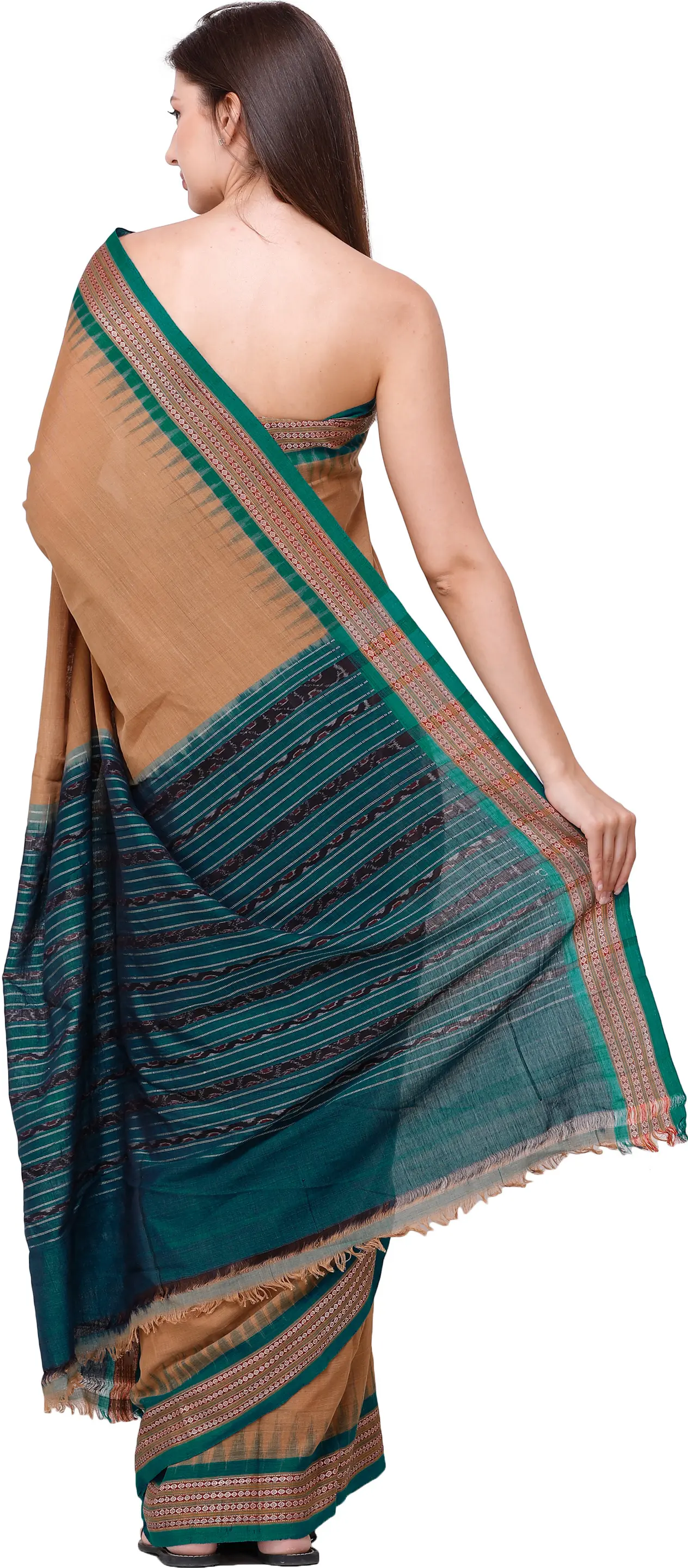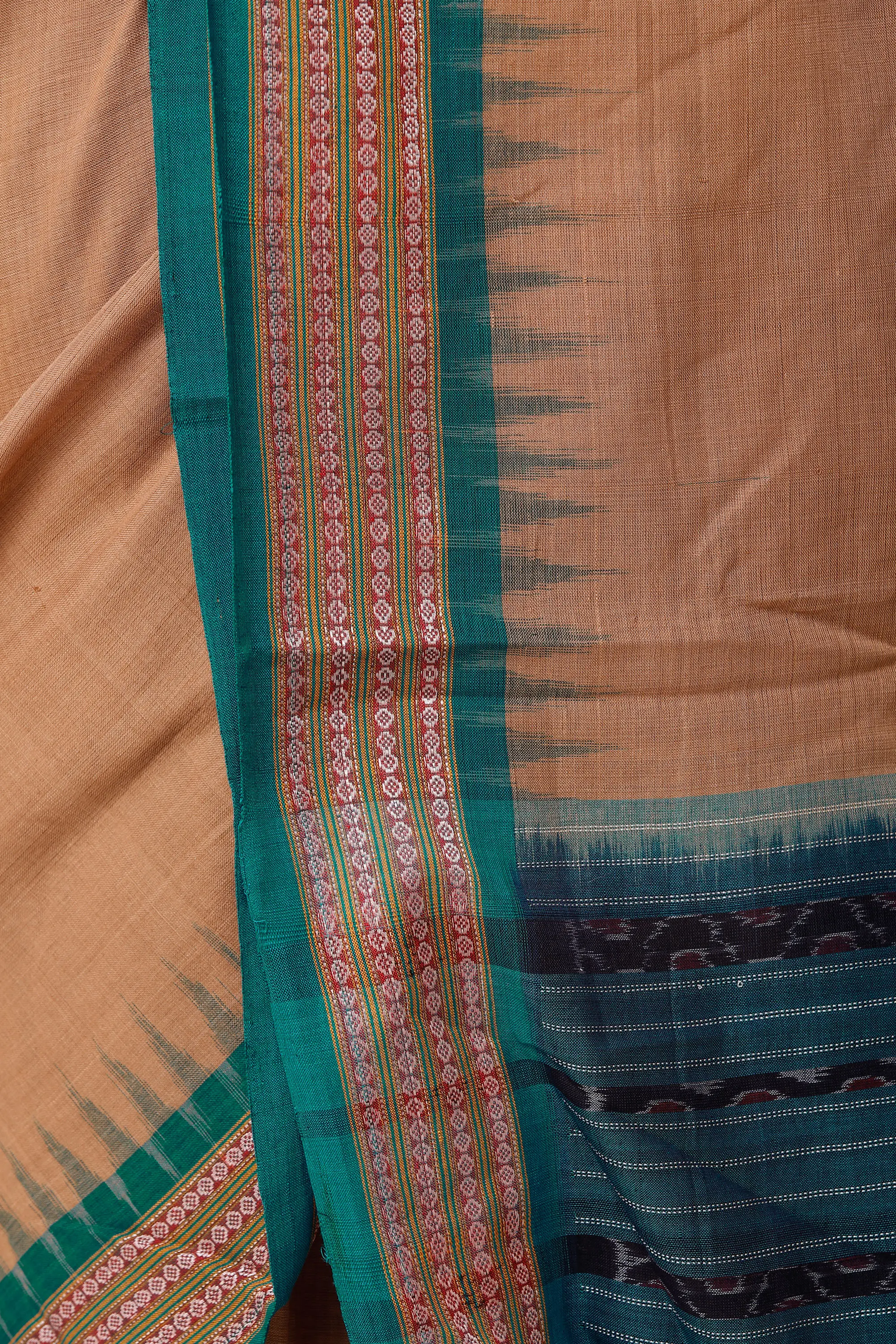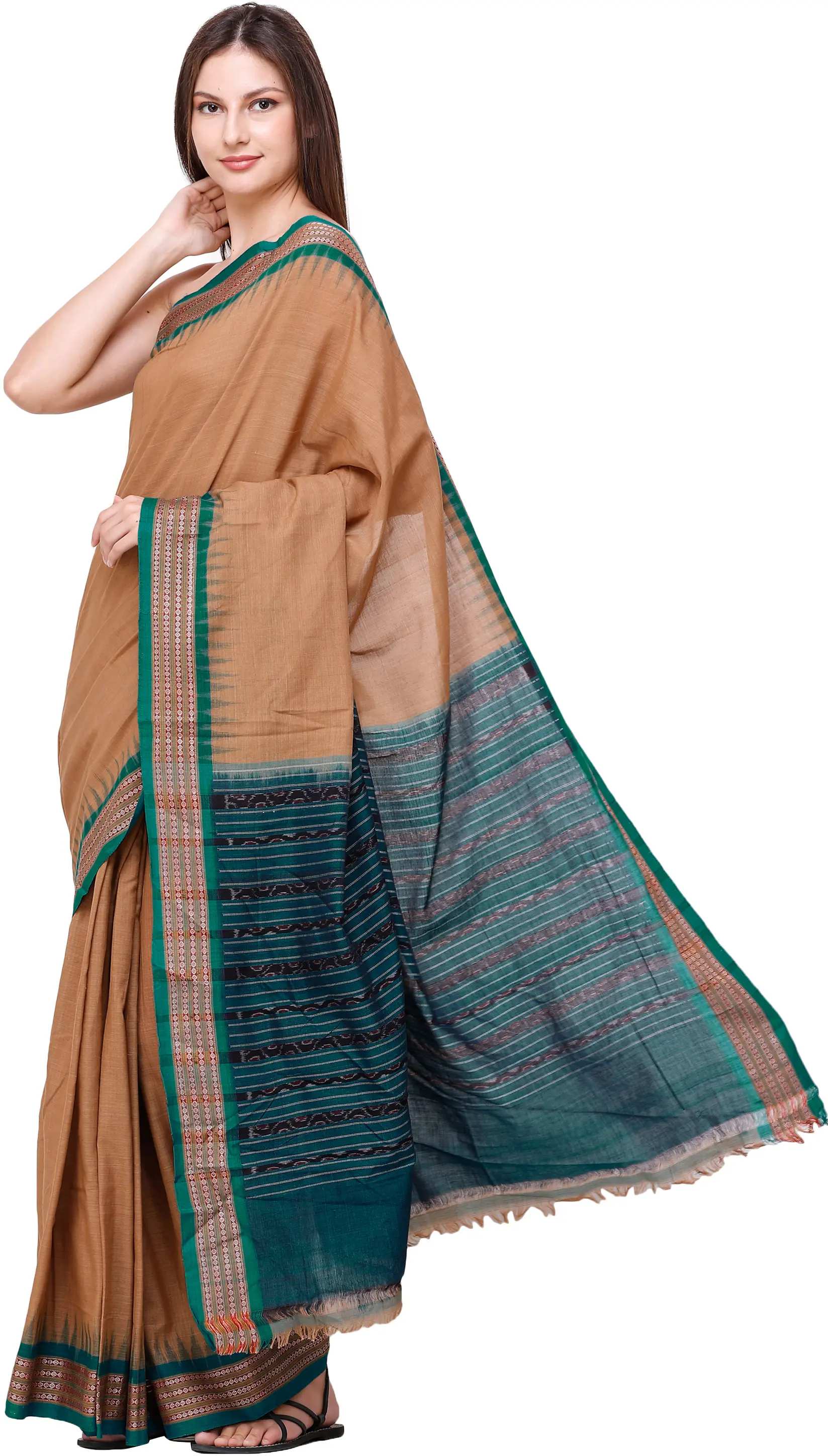 The Tannin Handloom Sari from Sambalpur is a harmonious blend of tradition and modernity. Its subtle hue, a hallmark of traditional Indian weaves, provides a contemporary twist to this classic attire, making it an ideal choice for the modern woman. The exquisite temple border and the intricate Ikat weave on the pallu are like threads of history woven into the fabric. The broad border and delicate tassels add layers of grace and charm to this ensemble, creating a symphony of elements that celebrate the timeless elegance of the Indian saree while catering to the style sensibilities of the contemporary woman.