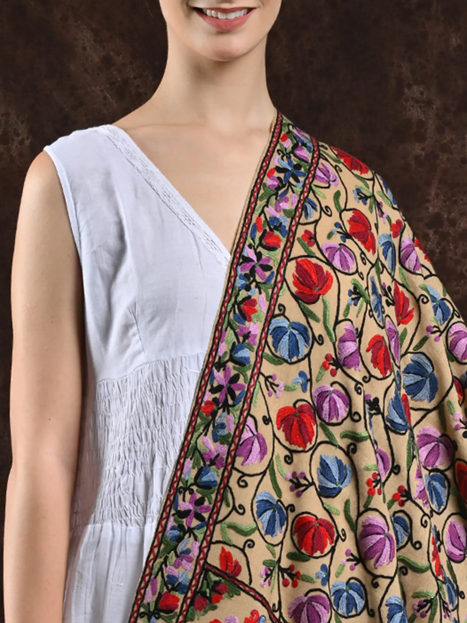 Ginger-Root Wool Stole from Amritsar with Dense Floral Embroidery with Diamond Weave