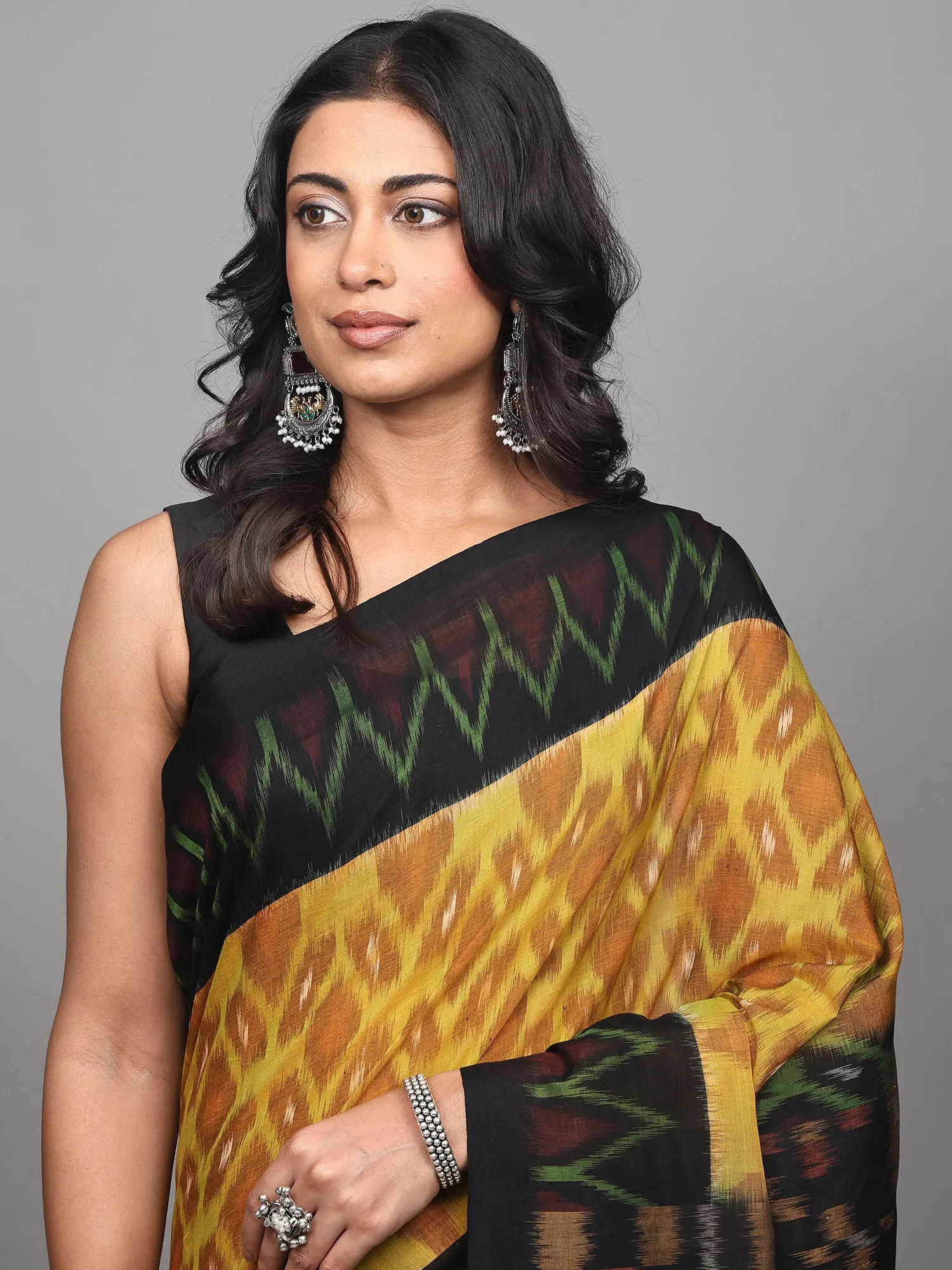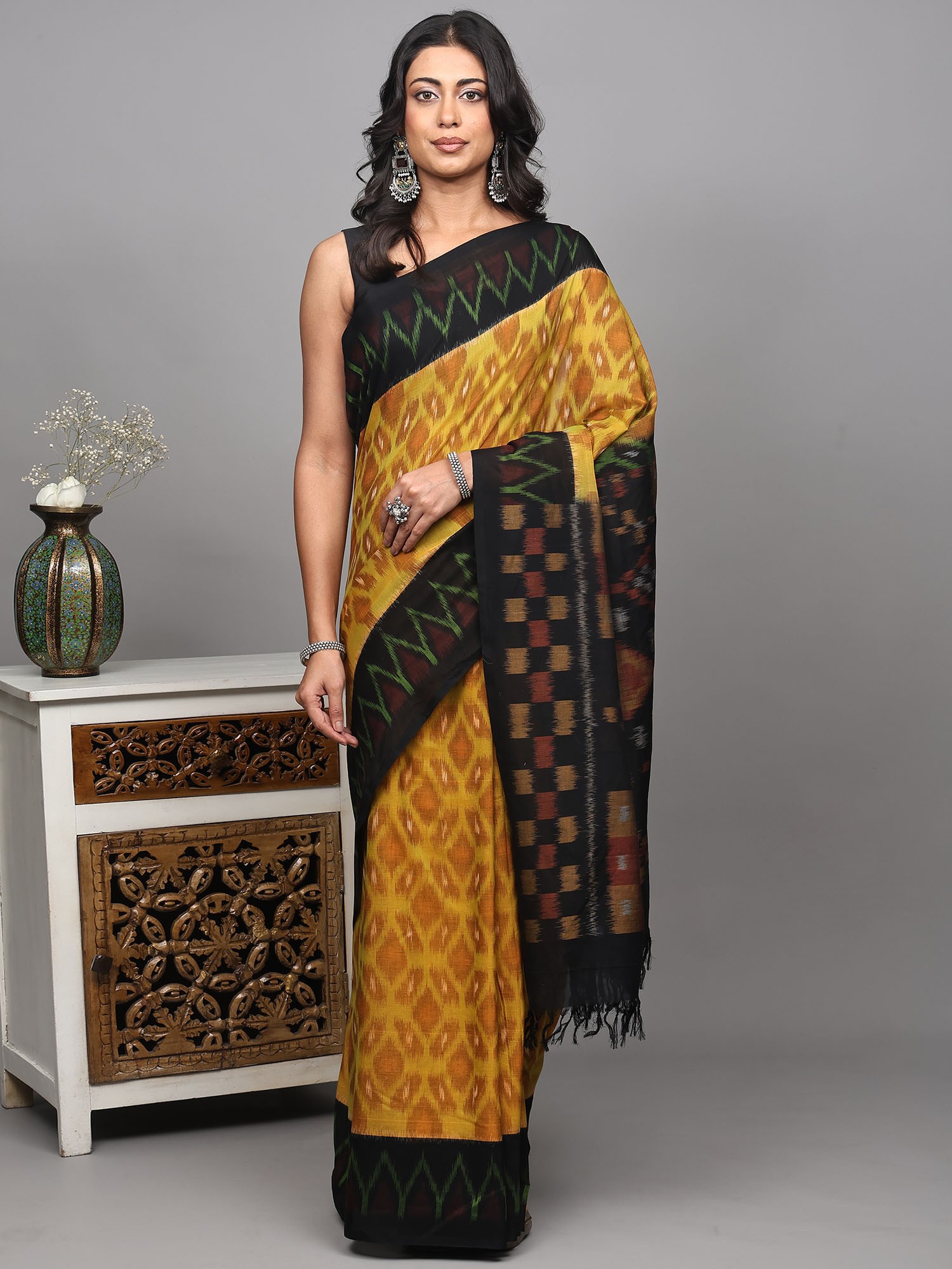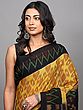 Pirate-Black Pure Cotton Ikat Handloom Saree from Sambhalpur with Contrast Wide Border