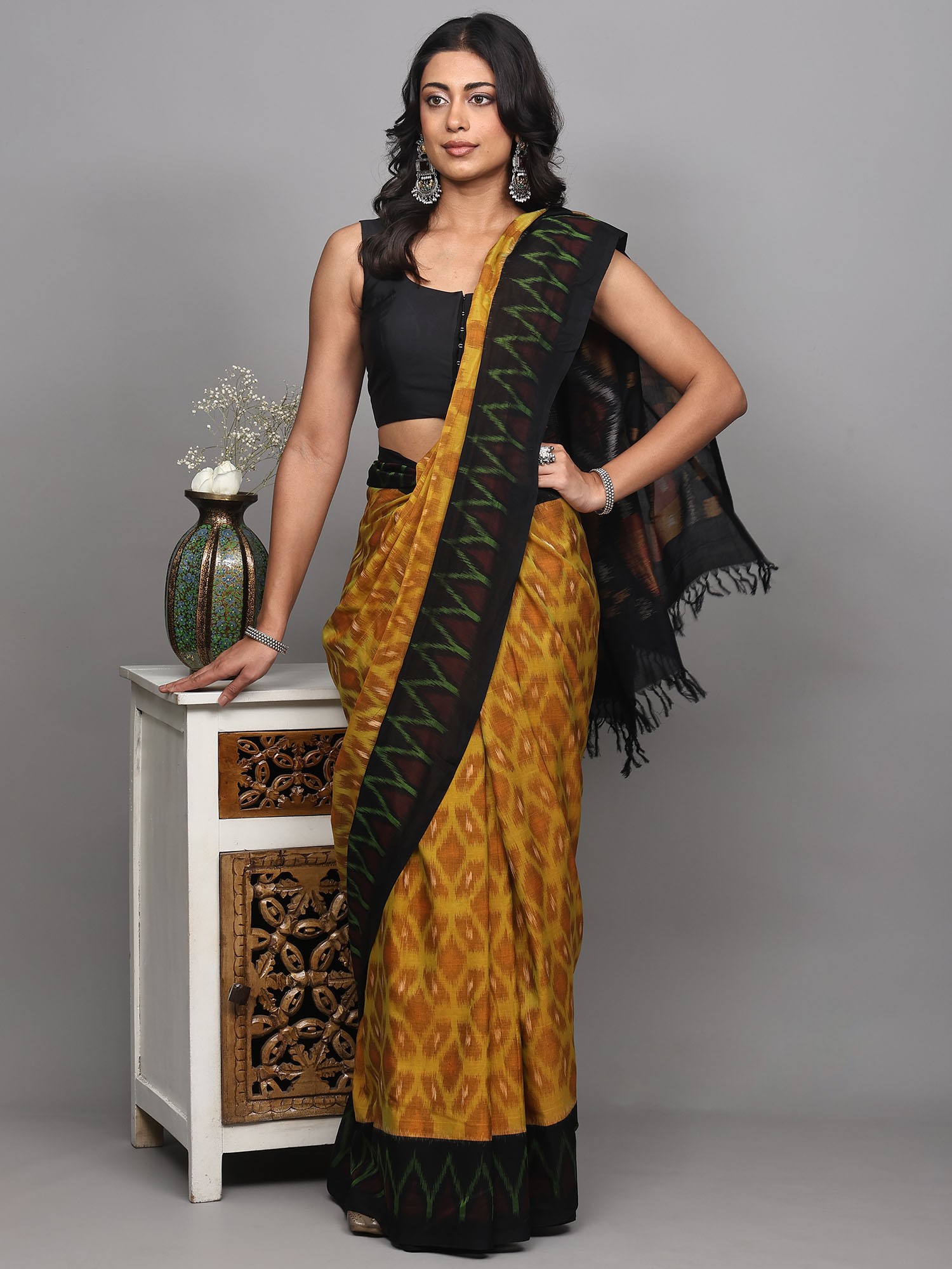 Complementing the all-over Ikat is a striking temple border, a classic design element deeply rooted in Indian temple architecture and art. This border, rendered in a contrasting black, features a sharp, zig-zag pattern reminiscent of architectural motifs. The intricate detailing within the border, including small, stylized squares and rectangles in earthy tones, adds a layer of visual interest and a touch of traditional grandeur. This border anchors the design, providing a sophisticated frame to the vibrant body of the saree and ensuring a regal drape.
