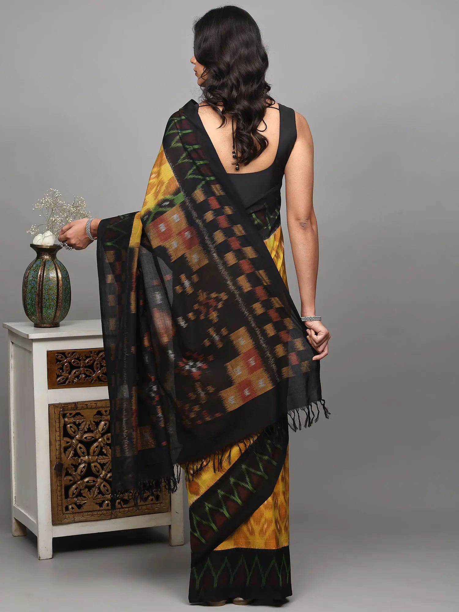 Black and Grey Pure Cotton Ikat Saree from Sambalpur with Temple Border