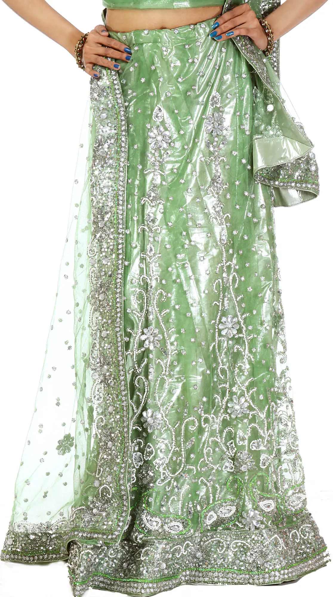 A beautiful green with shimmering sequins and beads creates this charming bridal lehenga, as an ode to the understated beauty of soft hues and the inner allure of the wearer. The monotone piece is made truly regal by the eye-catching traditional patterns all over, which are embellished with shining pieces of sequins and stones, added to the delicate net fabric, which complements the shimmering layer underneath, to tailor an exquisite festive traditional Indian wear.