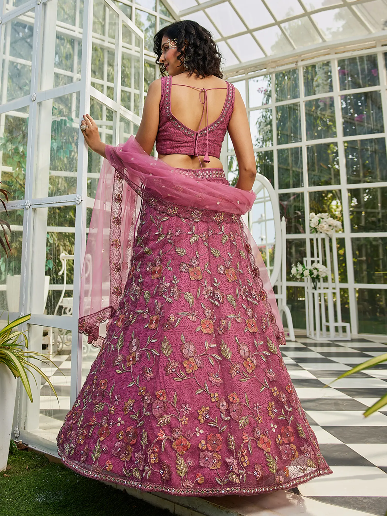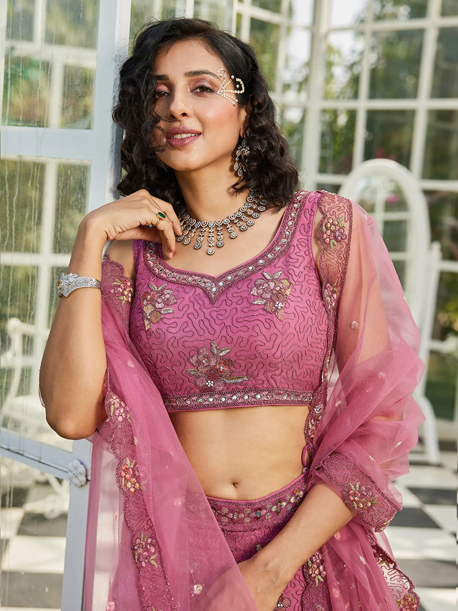 Light-Pink Soft Net Thread Embroidered Lehenga Choli with Sheer Dupatta