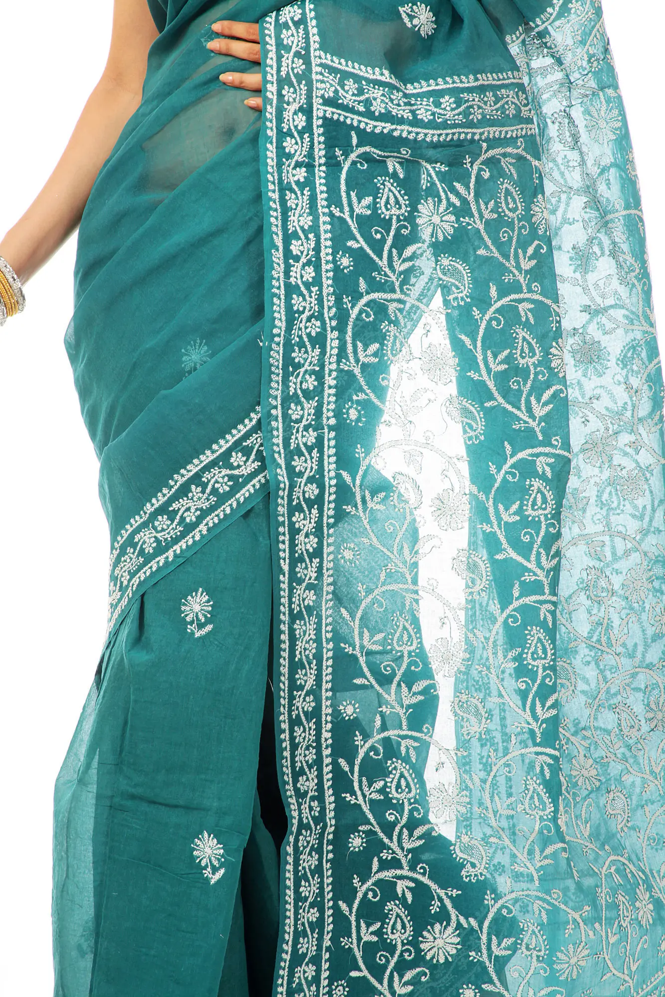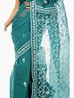 The true magic of this sari lies in its delicate Lukhnavi Chikan embroidery. Adorning the borders and scattered motifs throughout the fabric, the intricate white threadwork showcases the artistry of skilled craftspeople. Each stitch is a testament to tradition, creating a mesmerizing dance of floral patterns and paisley motifs that lend a breathtaking dimension to the garment. The embroidery is meticulously applied, ensuring a graceful drape and a subtle yet striking contrast against the vibrant teal base.