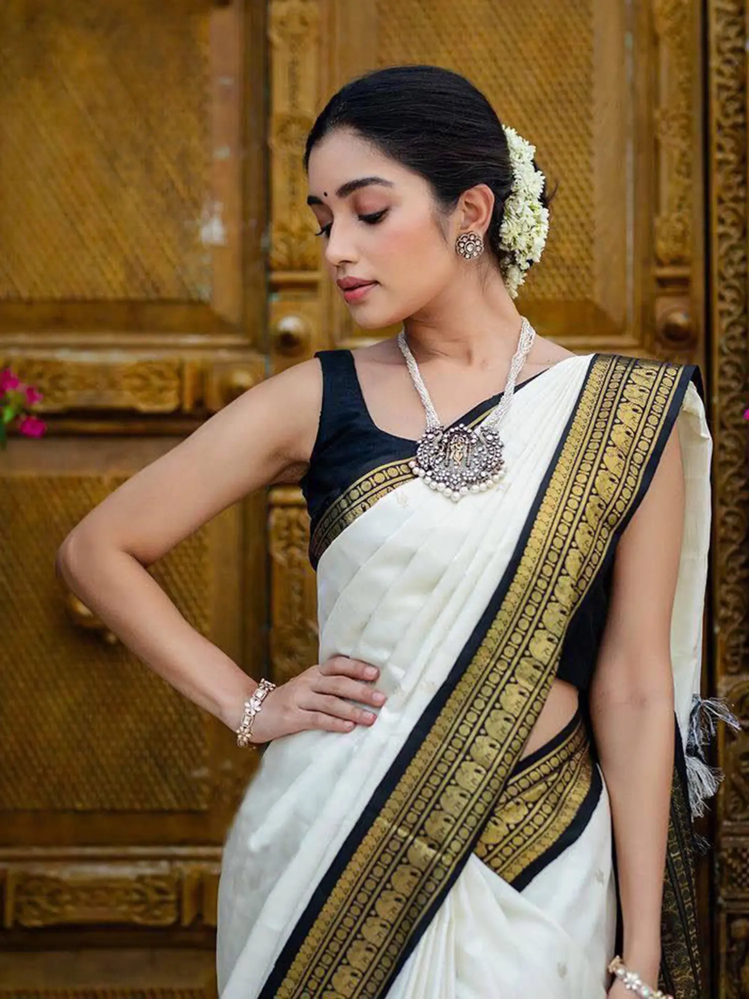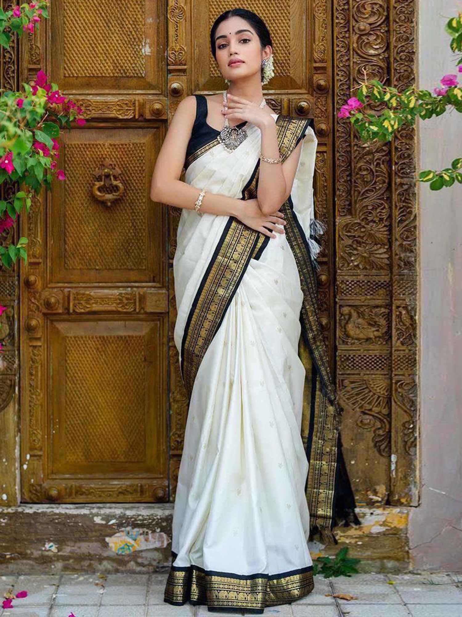 Party Wear Vichitra Silk Saree With Gold Zari Work On Border And Motifs All-Over