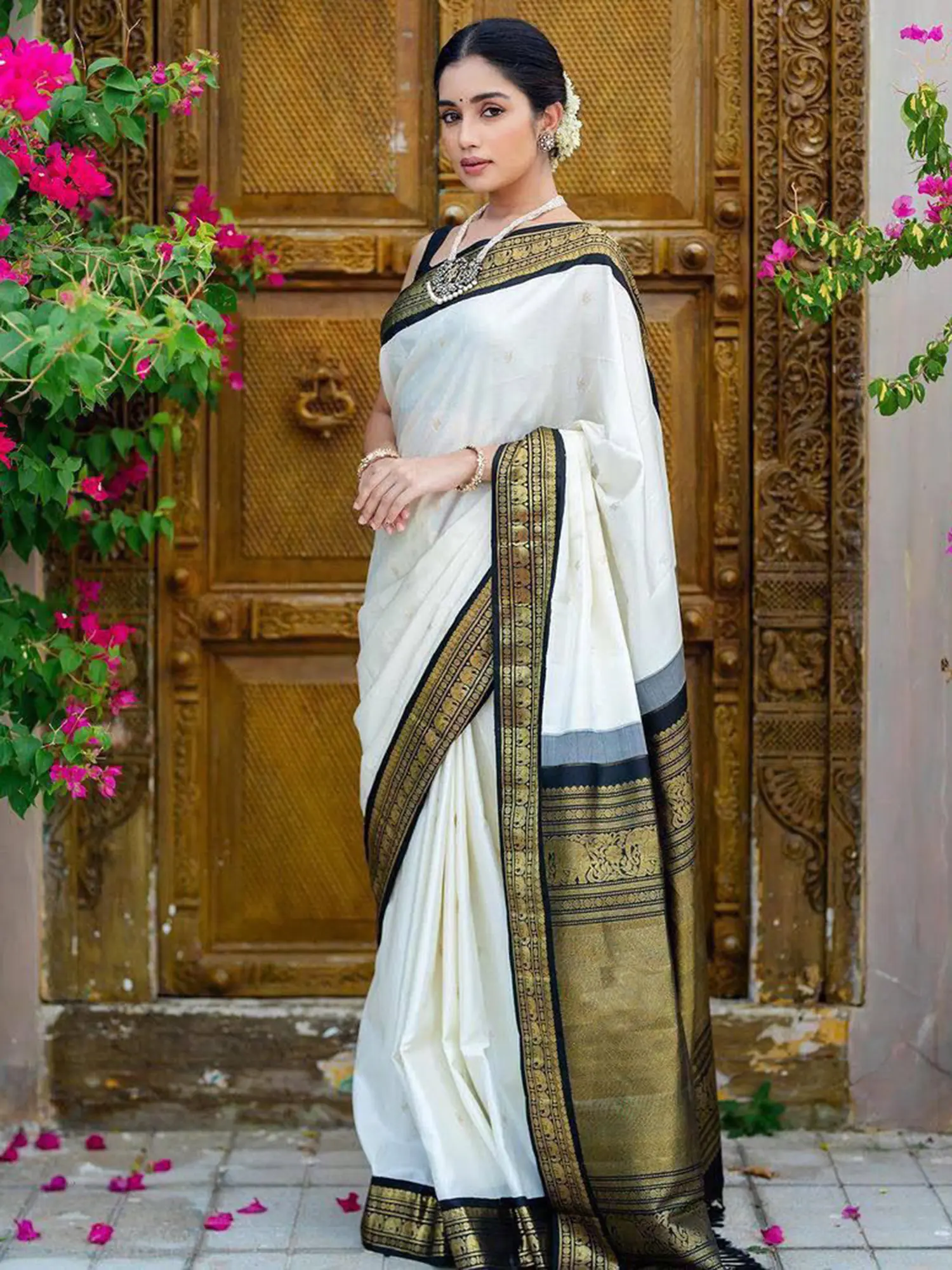 Silk Saree with Zari-Woven Border and Geometric Motifs All-Over