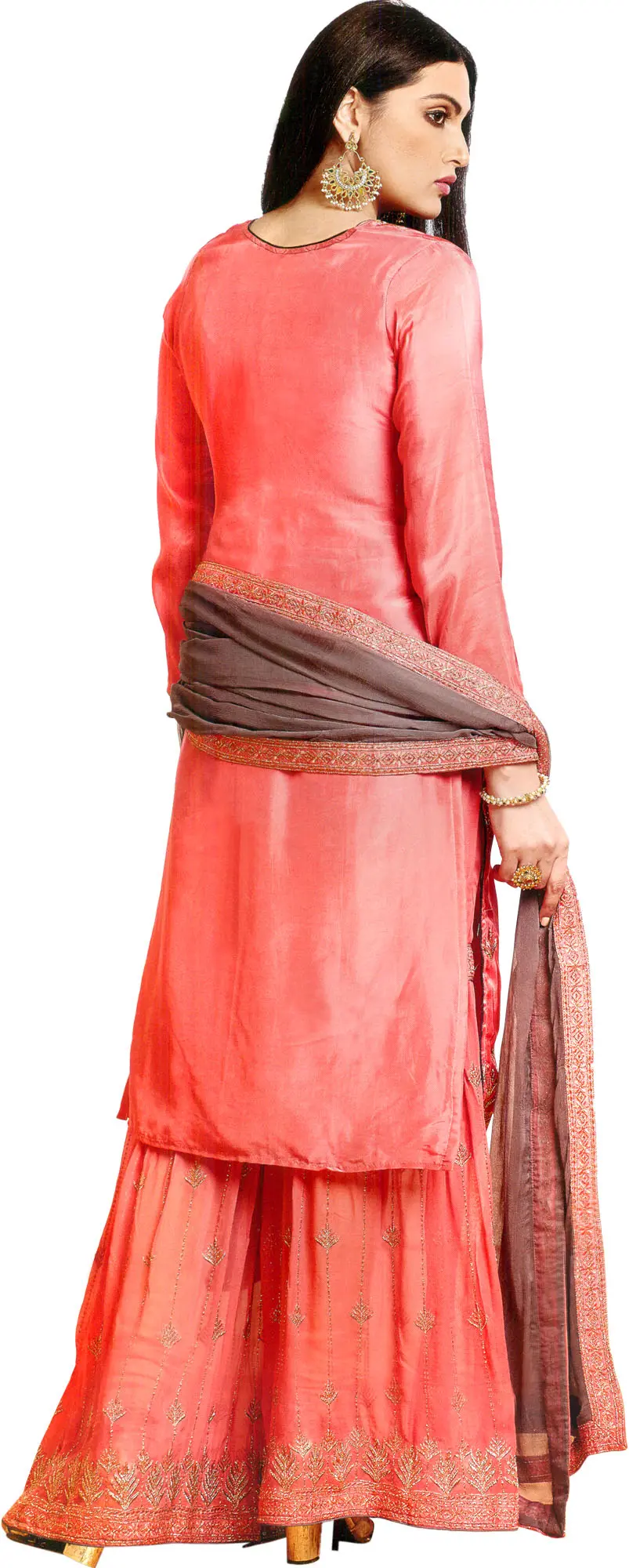 The tera-cotta Pakistani salwar kameez suit is a celebration of rich cultural aesthetics. The warm terra-cotta hue creates a captivating canvas for the intricate zari embroidery that graces the suit. The fine craftsmanship, enhanced by delicate crystals, adds a touch of opulence to the ensemble. The Pakistani salwar kameez silhouette brings a regal charm, offering a perfect blend of tradition and contemporary fashion. This attire is a testament to the timeless beauty of ethnic wear, making it a splendid choice for special occasions and festivity. Embrace the allure of Pakistani fashion with this exquisite terra-cotta ensemble.