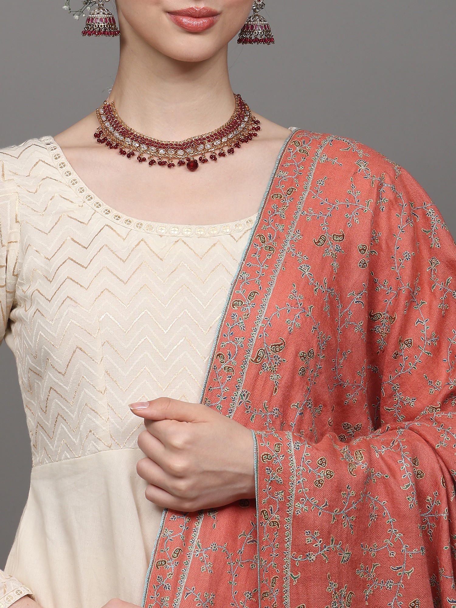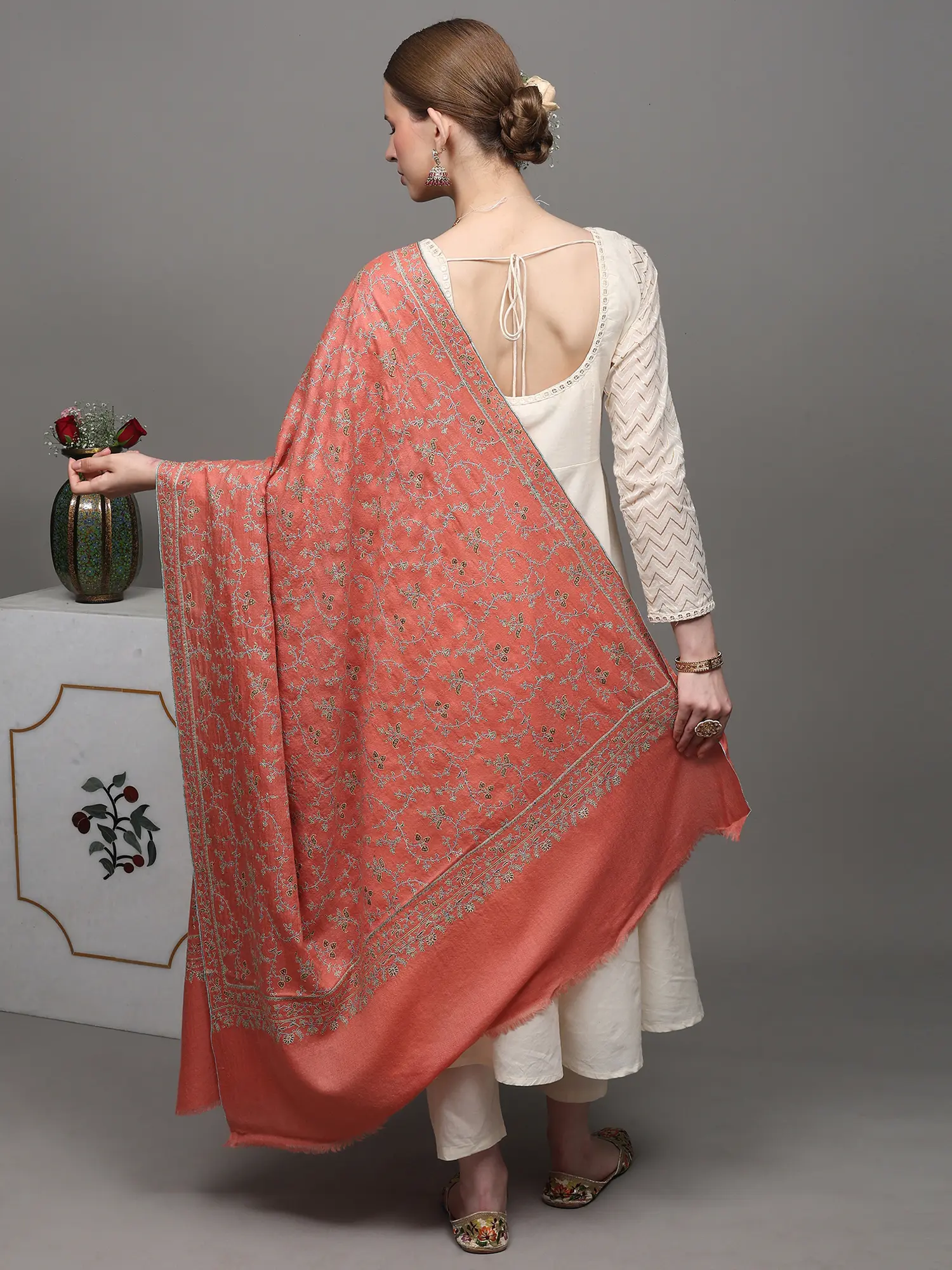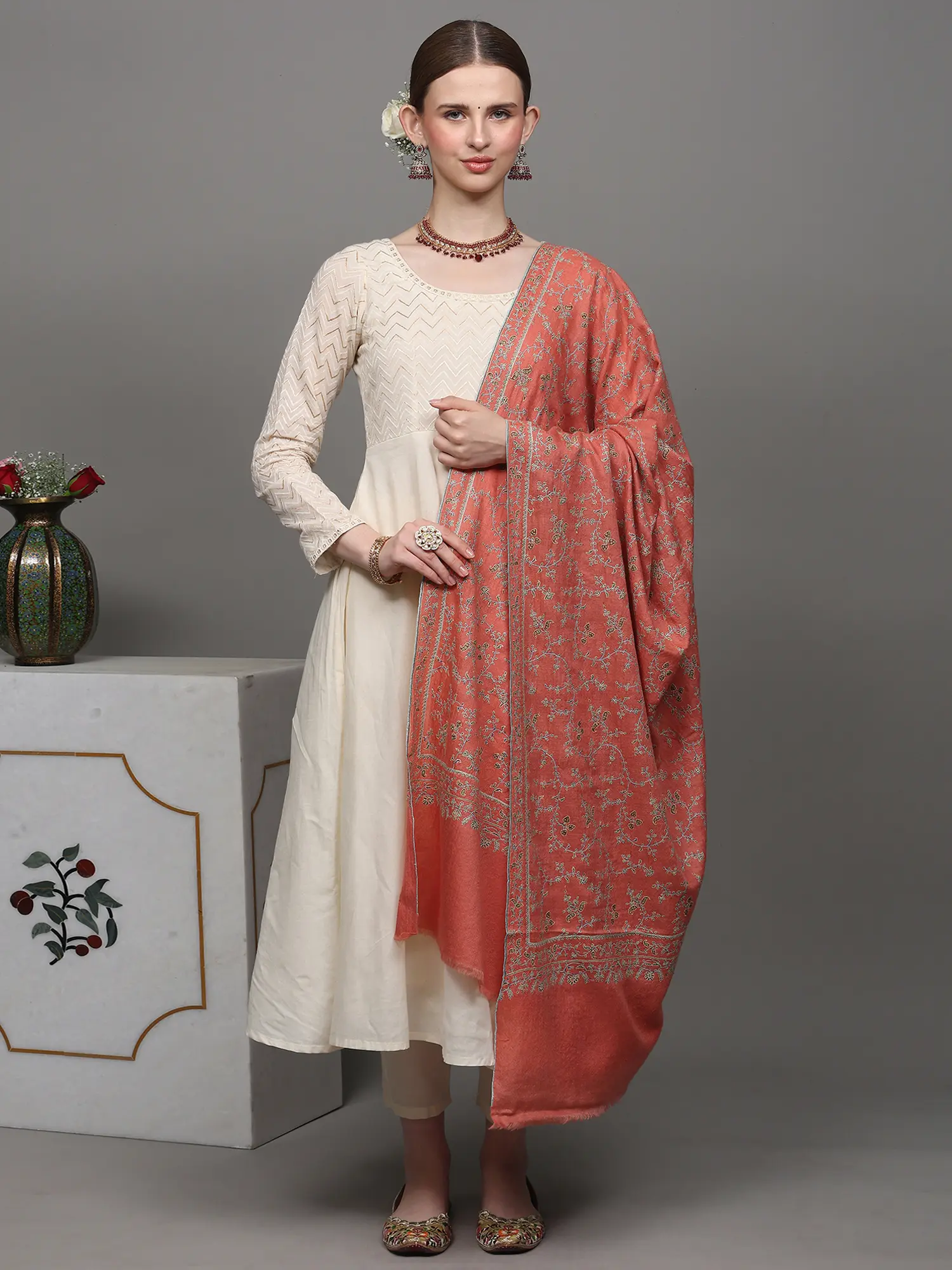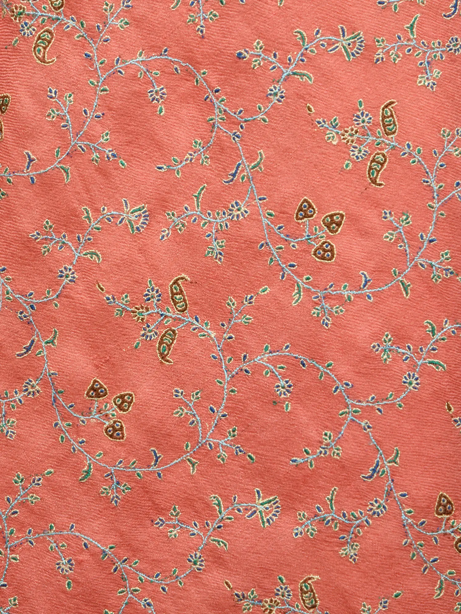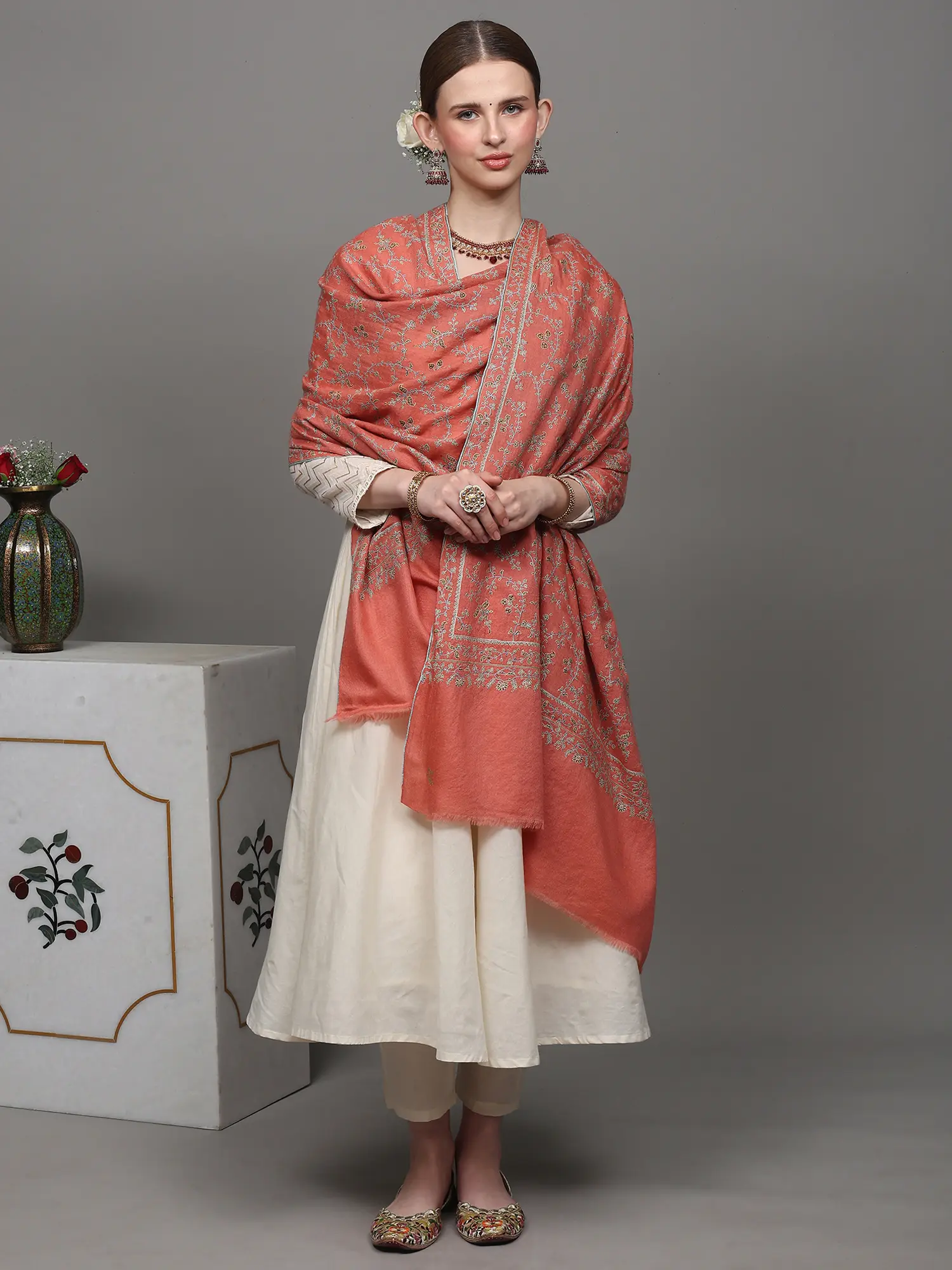Welcome to a voyage of unmatched luxury, the tangerine cashmere shawl with Floral design jaaldar sozni embroidery. It has real grace, the tangerine color embodies nature and evokes sentiments of peace and vitality. It features a symphony of delicate flower designs and beautiful jaaldar patterns that have been meticulously hand-embroidered by talented artisans. Each stitch bears witness to the commitment and skill of its maker. The sumptuousness of cashmere and the delicate beauty of sozni embroidery come together in this shawl to create a true masterpiece.