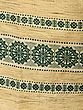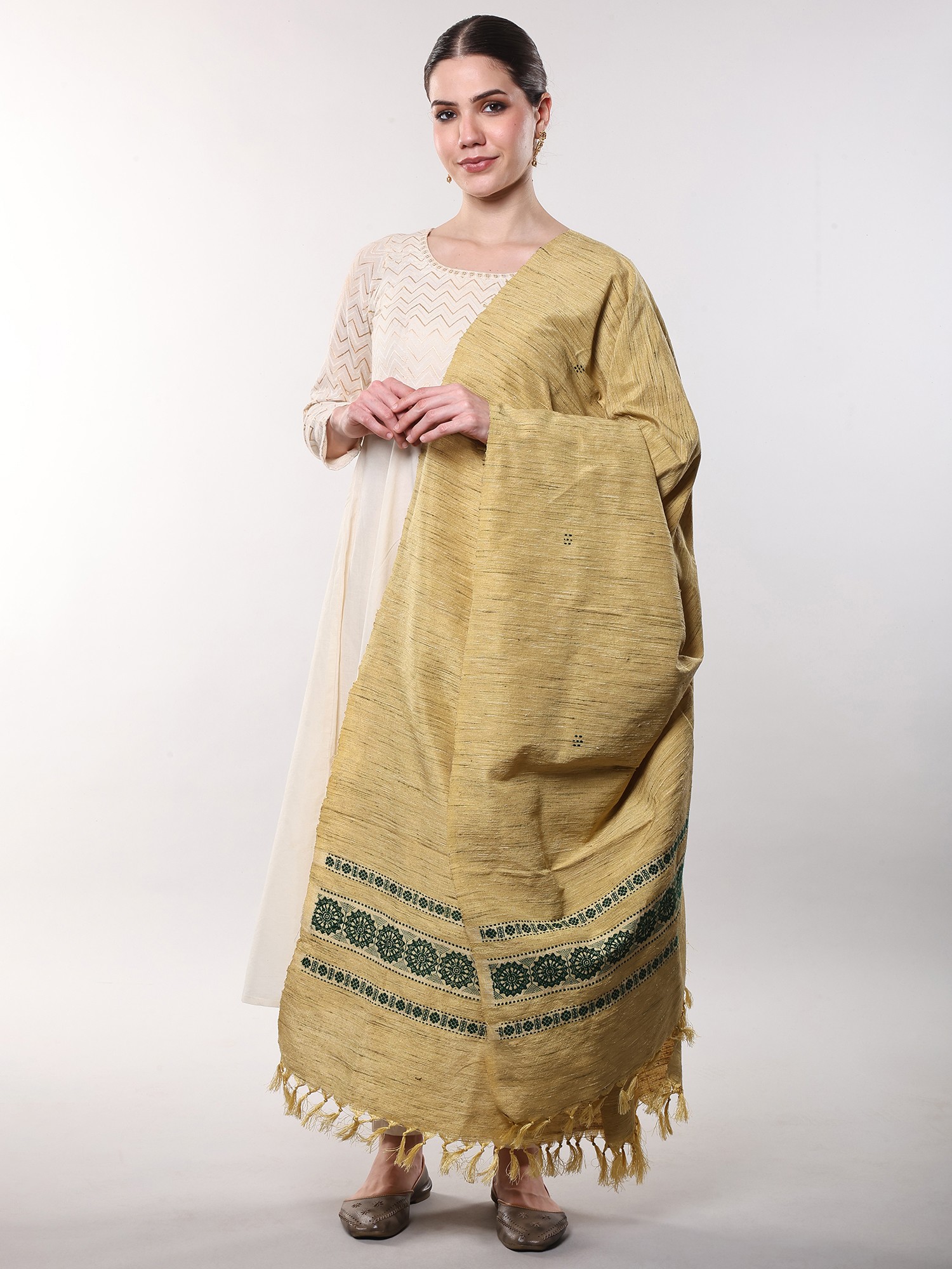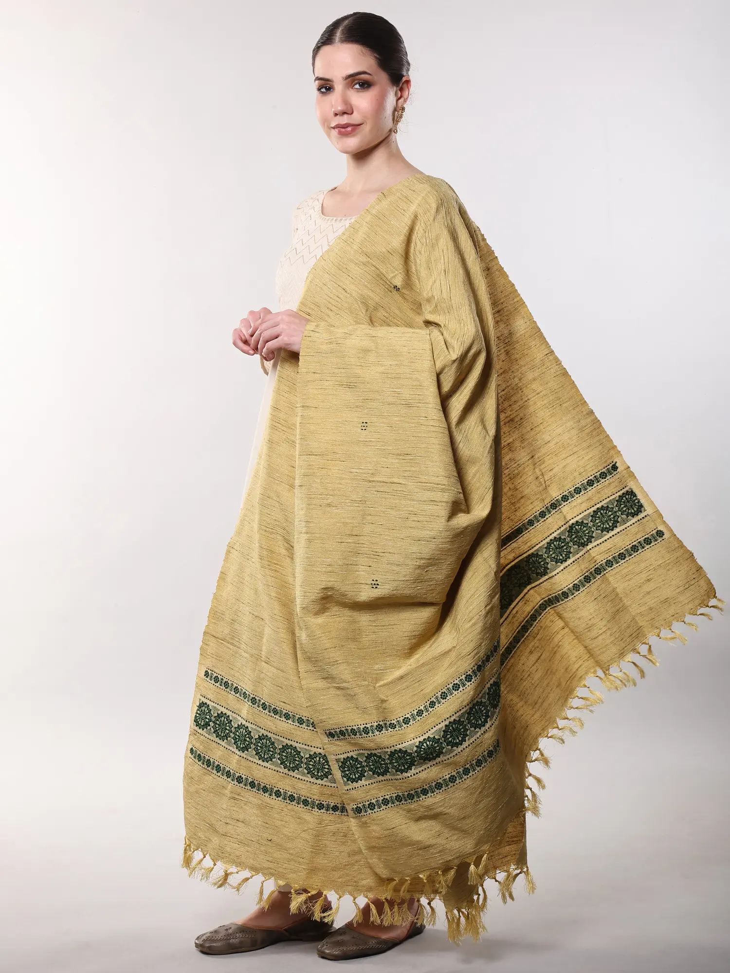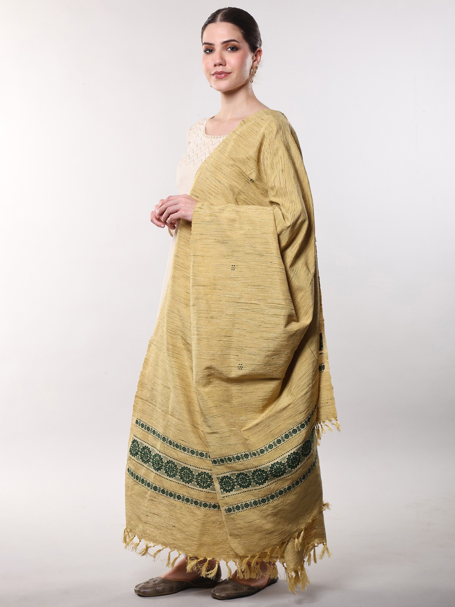 You’ll admire the unique, slubby texture of the jute, which lends a rich visual depth and a pleasing hand-feel. The generous 88-inch length and 39-inch width provide ample fabric to style in myriad ways, from a graceful drape over your shoulders to a vibrant accent around your neck. The deep green threadwork stands in striking contrast against the warm, earthy hue of the jute, creating a captivating visual narrative. Delicate tassels add a playful flourish to the edges, completing the artisanal aesthetic.