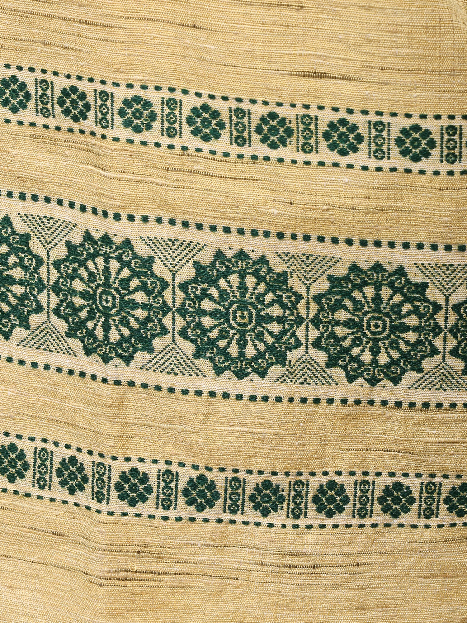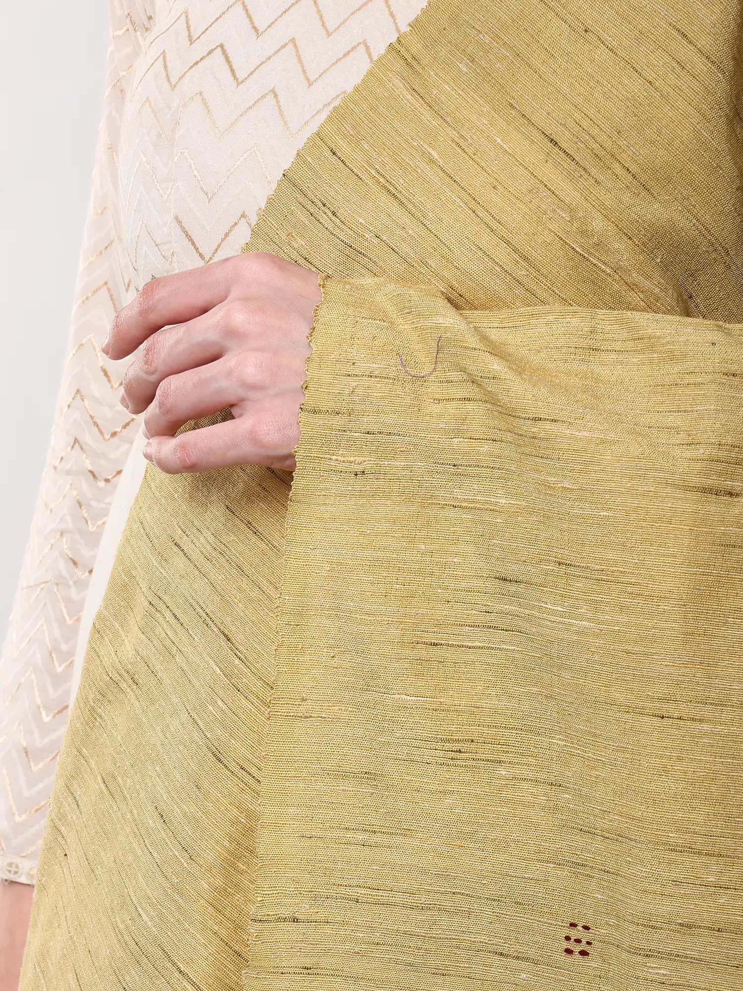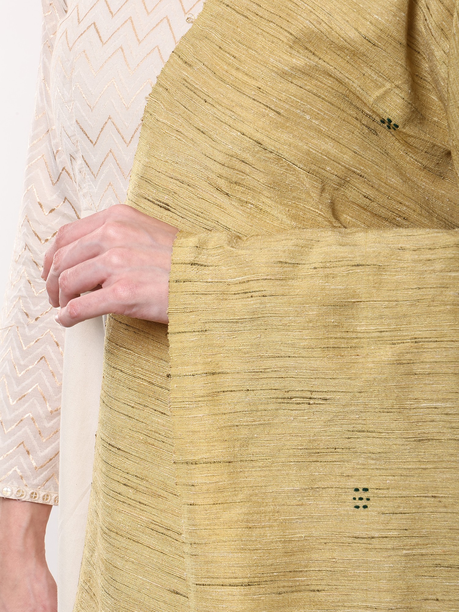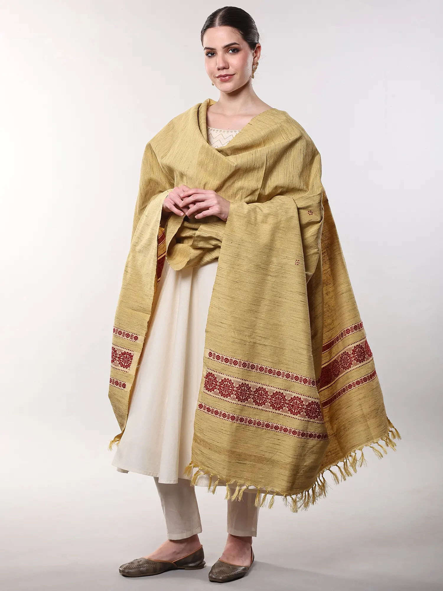 You’ll admire the unique, slubby texture of the jute, which lends a rich visual depth and a pleasing hand-feel. The generous 88-inch length and 39-inch width provide ample fabric to style in myriad ways, from a graceful drape over your shoulders to a vibrant accent around your neck. The deep green threadwork stands in striking contrast against the warm, earthy hue of the jute, creating a captivating visual narrative. Delicate tassels add a playful flourish to the edges, completing the artisanal aesthetic.