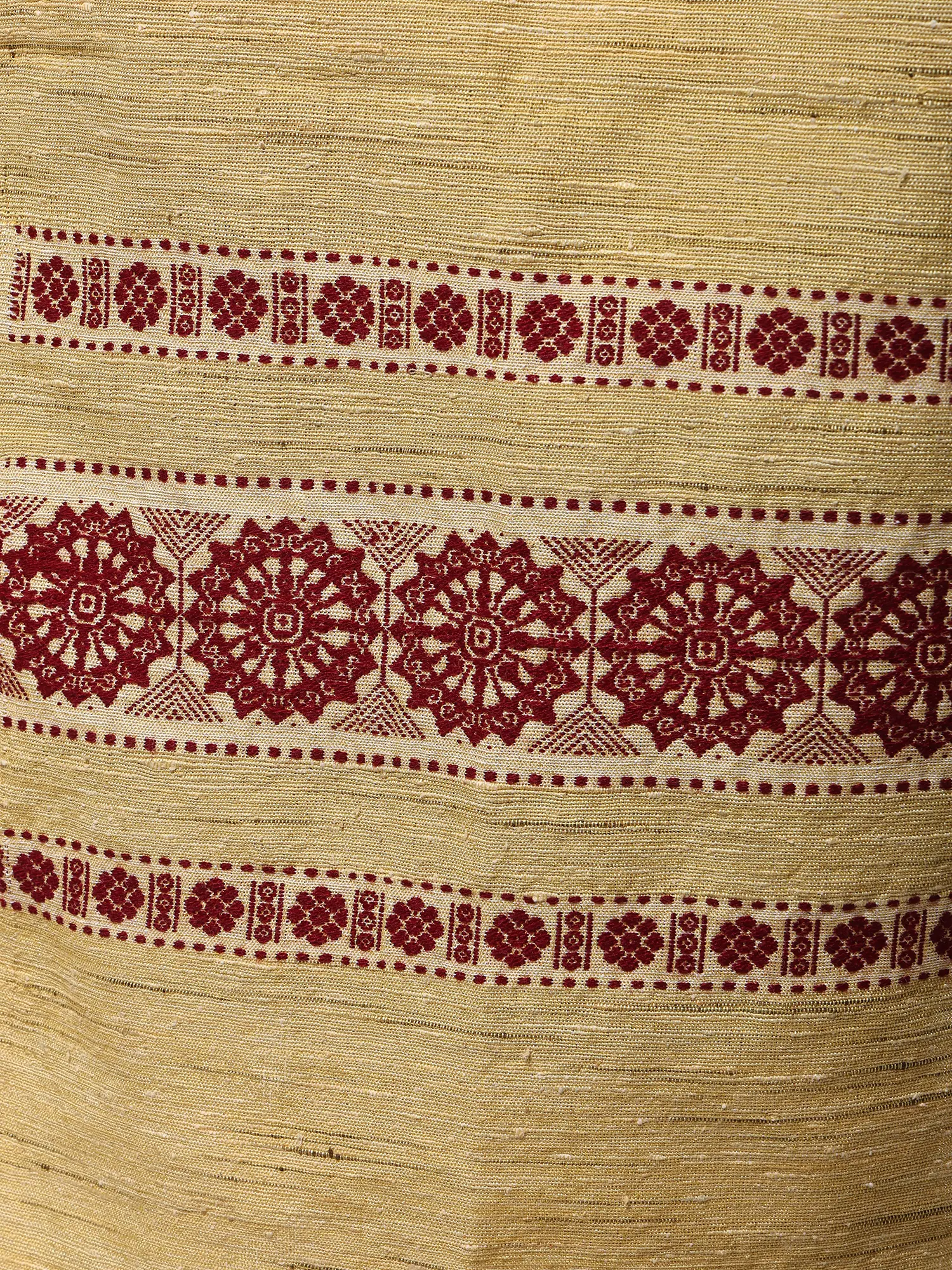 Adorned with intricate threadwork in a striking maroon against a warm, earthy jute base.