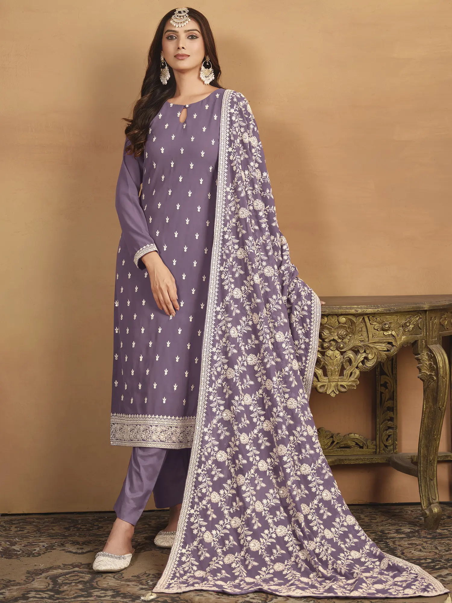 Muted colors and intricate embroidery create a festive wear salwar suit that is stylishly comfortable. The straight-cut kurta offers a graceful fit, covered in butis all over.