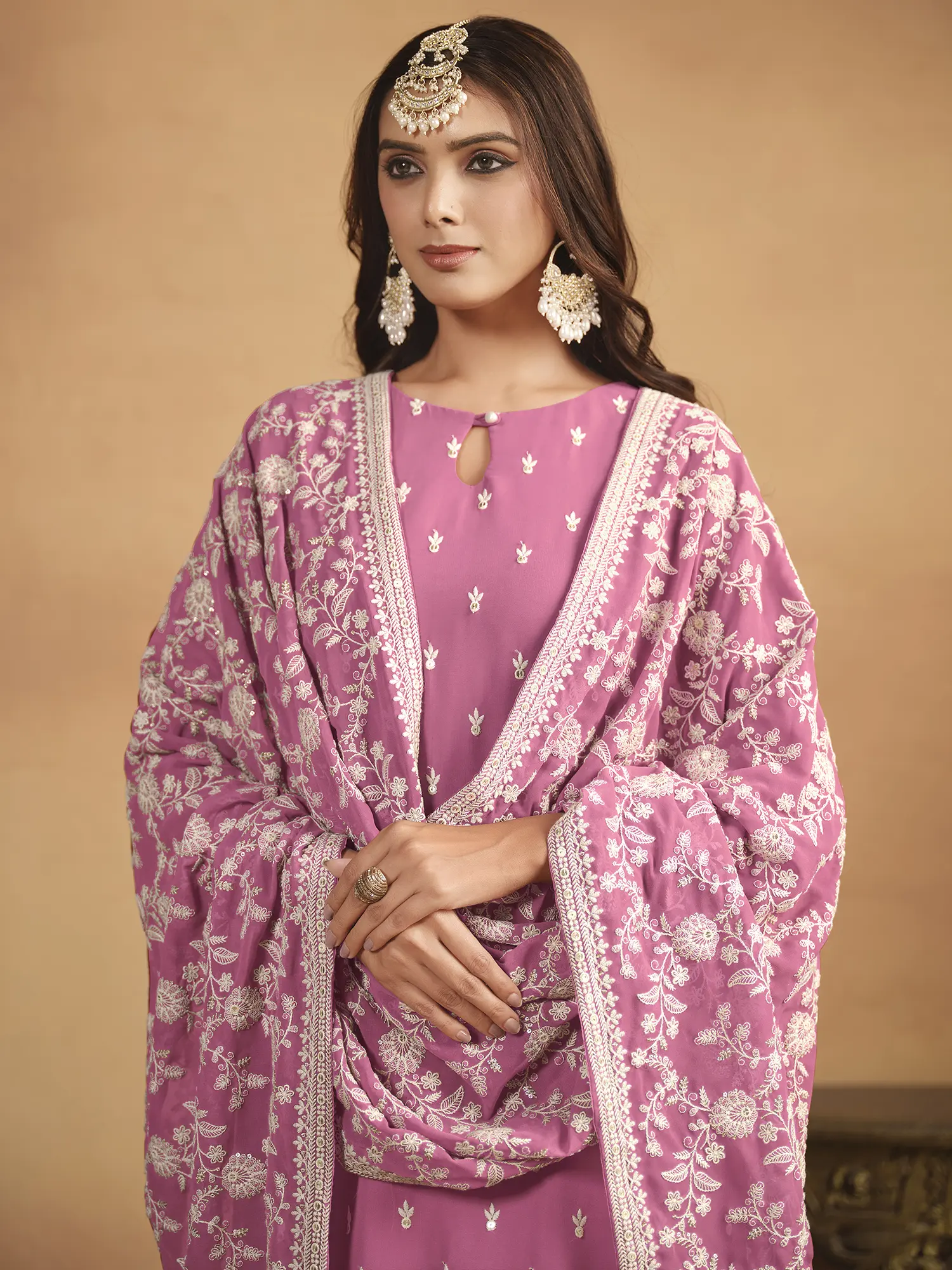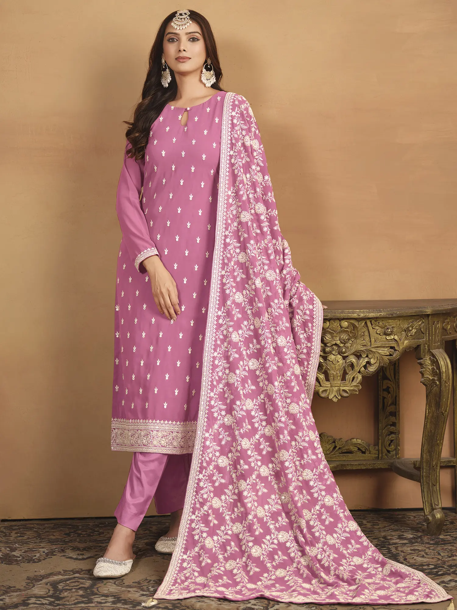 Muted colors and intricate embroidery create a festive wear salwar suit that is stylishly comfortable. The straight-cut kurta offers a graceful fit, covered in butis all over.